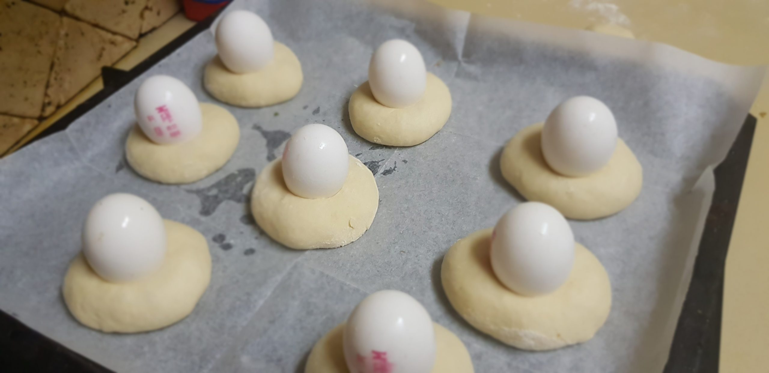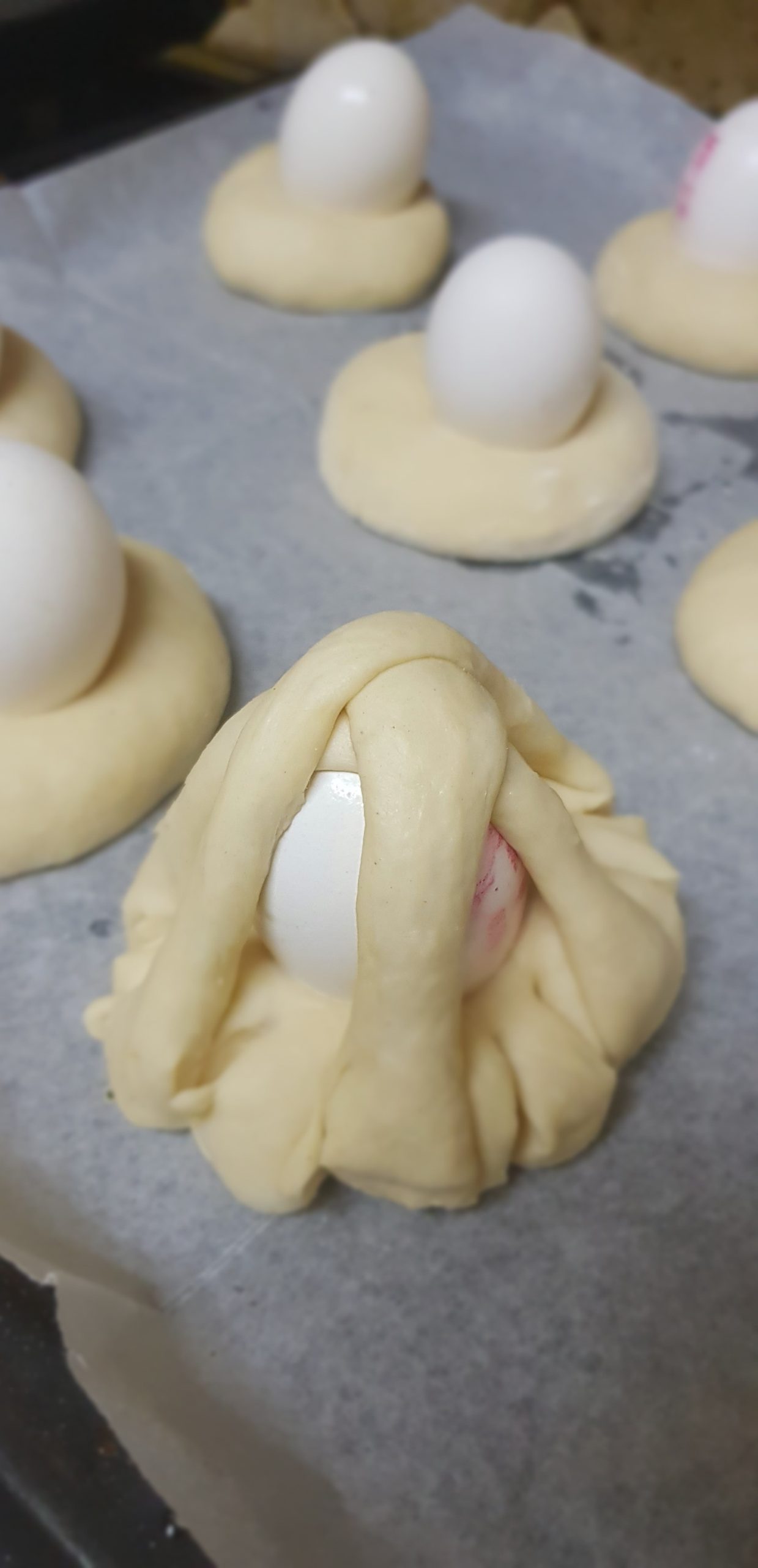 Préparer des boules de pates, les placer sur votre plat de cuisson, ajouter au centre un œuf bien lavé et enfoncer doucement l’oeuf, pointe vers le bas ( je ne le fais pas bouillir car il va cuire dans le four).