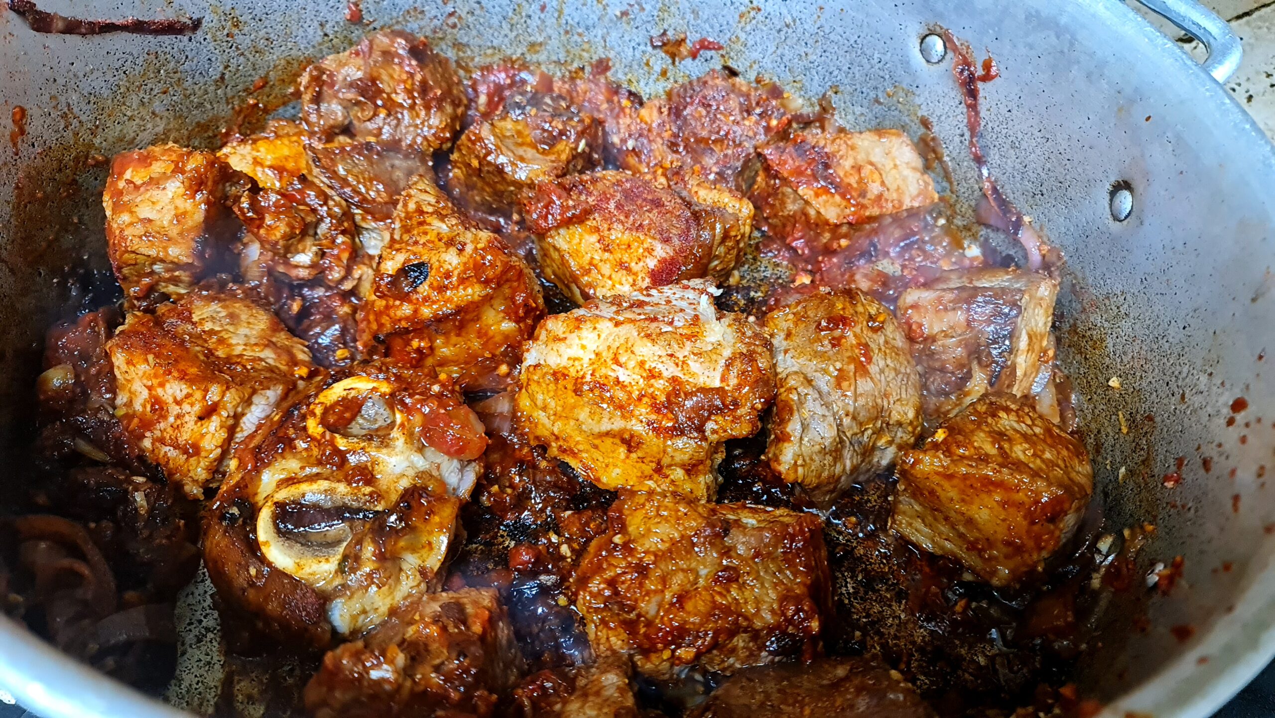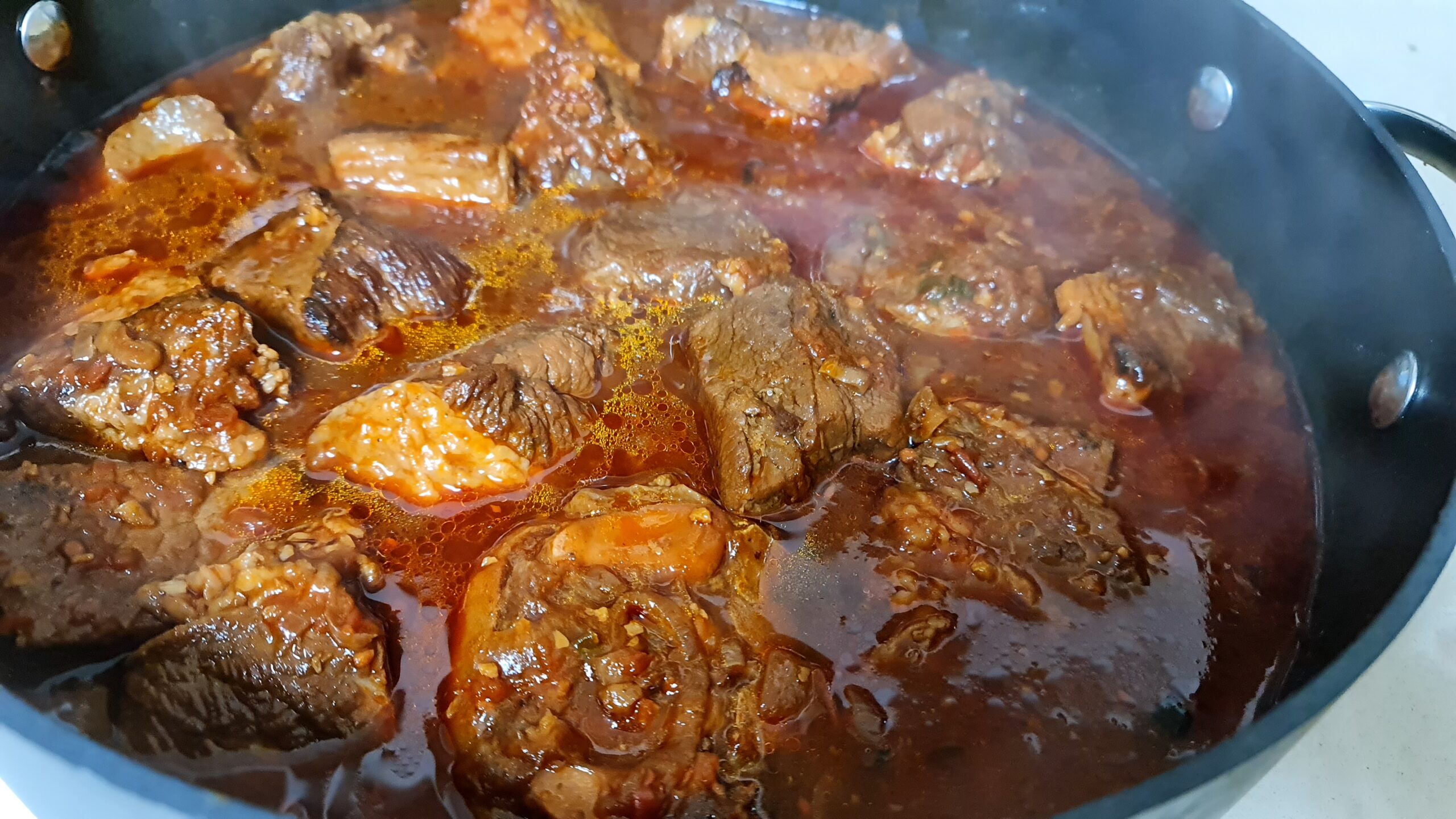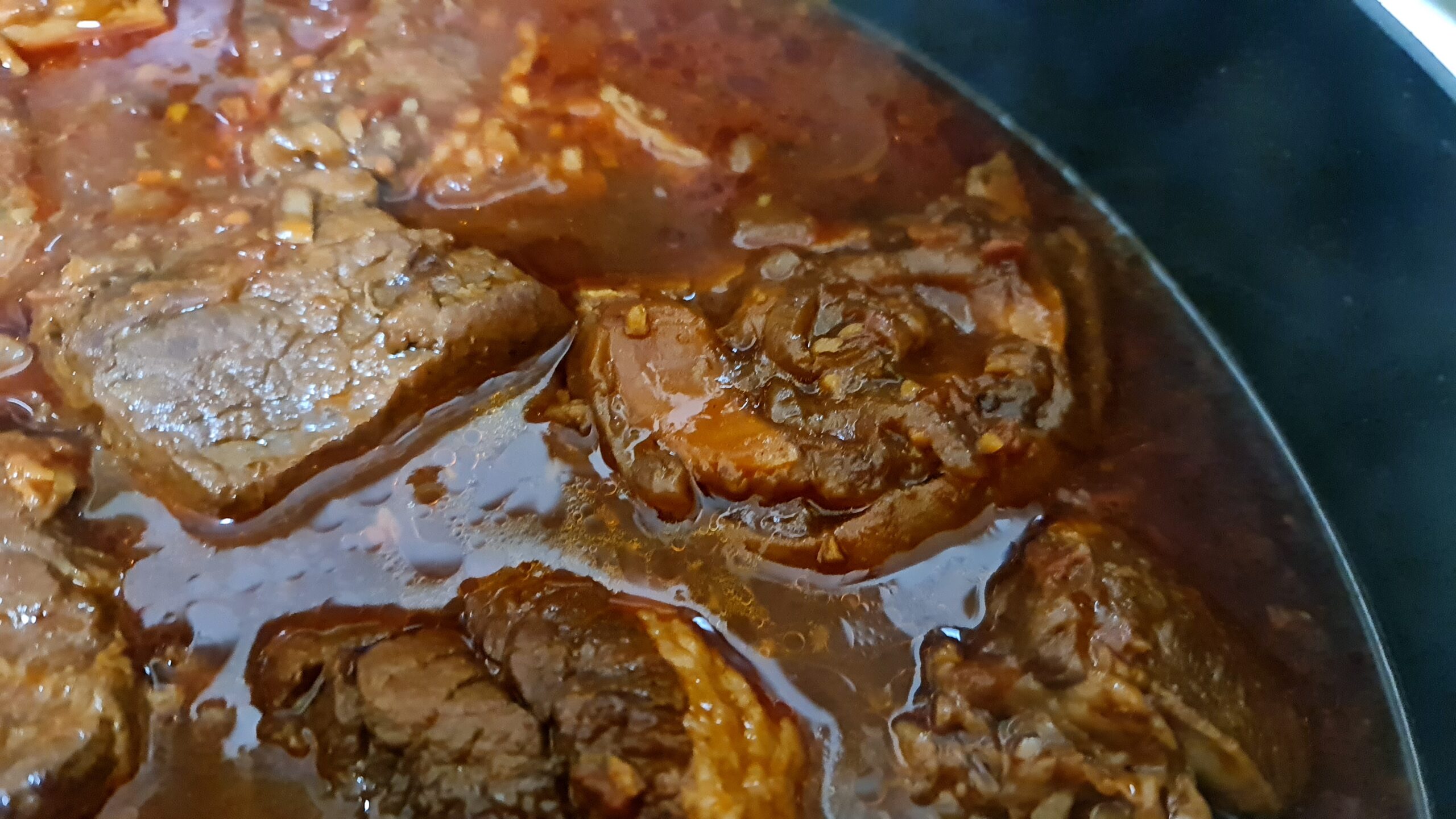 Prenez 2 kilos d’asado en gros dés, salez et poivrez, et faites-les saisir dans une large marmite jusqu’à ce qu’ils soient bien rotis, sortez-les, mettez 12 gousses d’ail, 3 branches de céleri, 3-4 carottes coupées, 2 oignons violets dans la même huile. 5-6 patates douces 6 pommes de terres de Jerusalem, et bien mélanger, ajouter un bâton de cannelle et 2 tiges de thym, saler et poivrer, placer la viande, mettre 7-8 pruneaux, ajouter 3 cuillères à soupe de silan et 2 cuillères à soupe de concentré de grenade, ajouter une cuillère à soupe de concentré de tomates , ajoutez un verre de vin blanc et dès que l’alcool s’évapore, ajoutez 2 verres d’eau bouillante