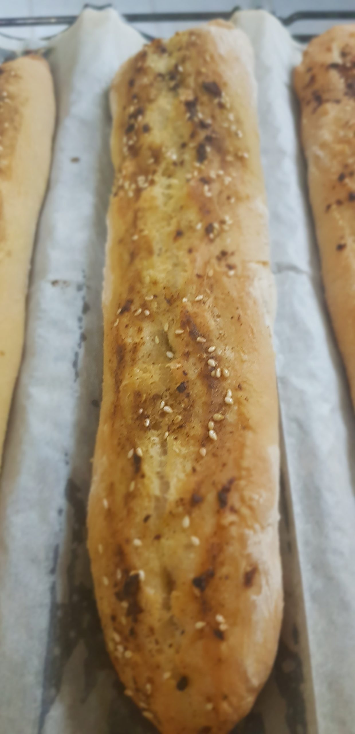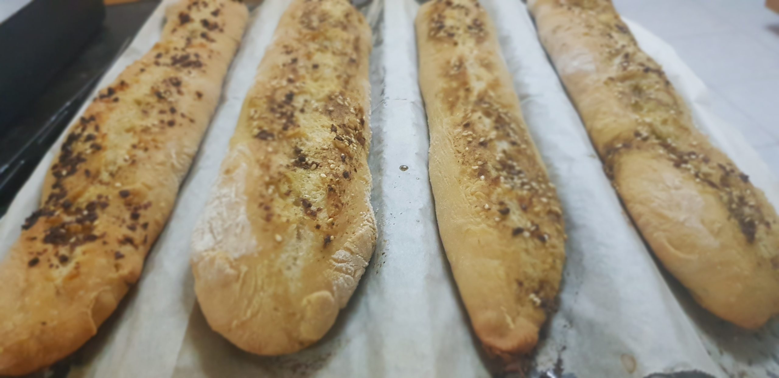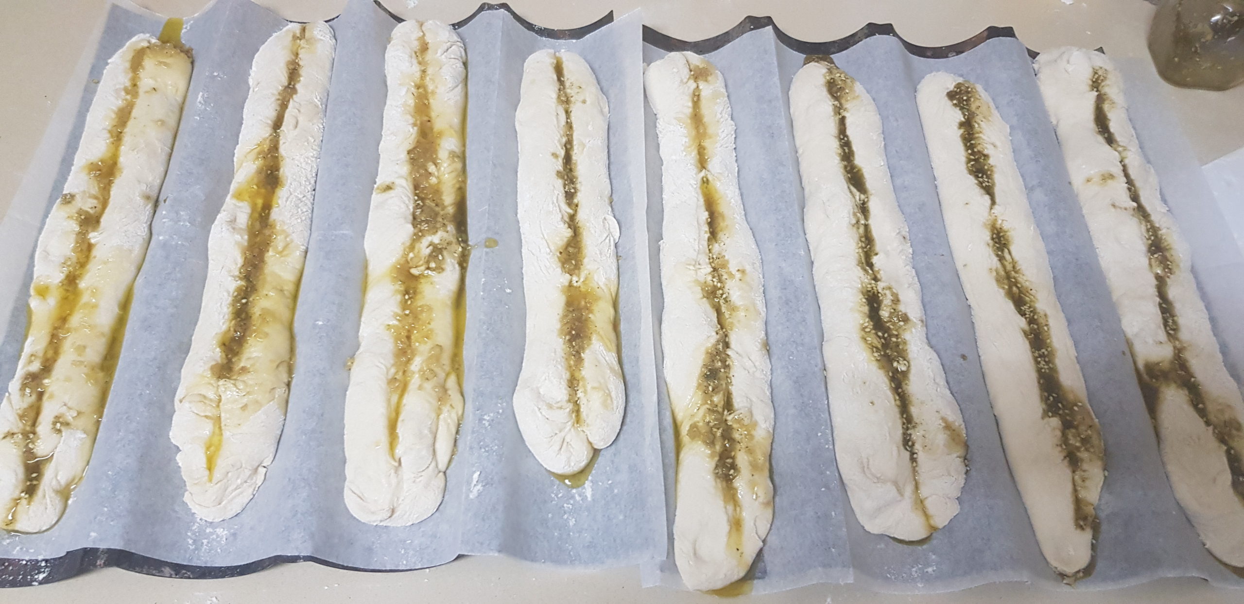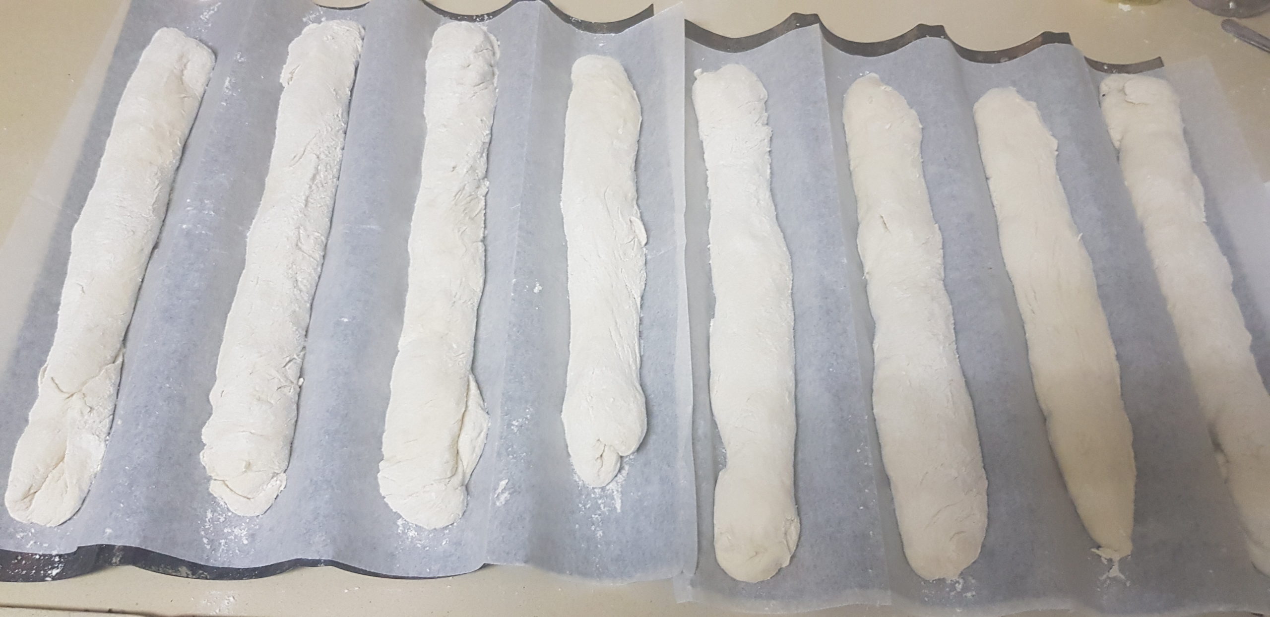 Déposer chaque baguette sur une plaque à pâtisserie recouverte de papier sulfurisé
