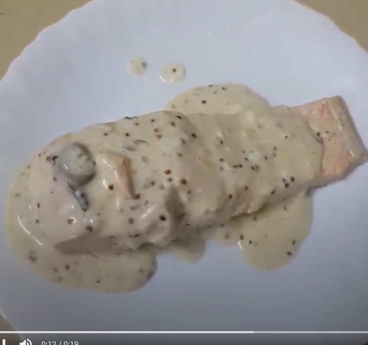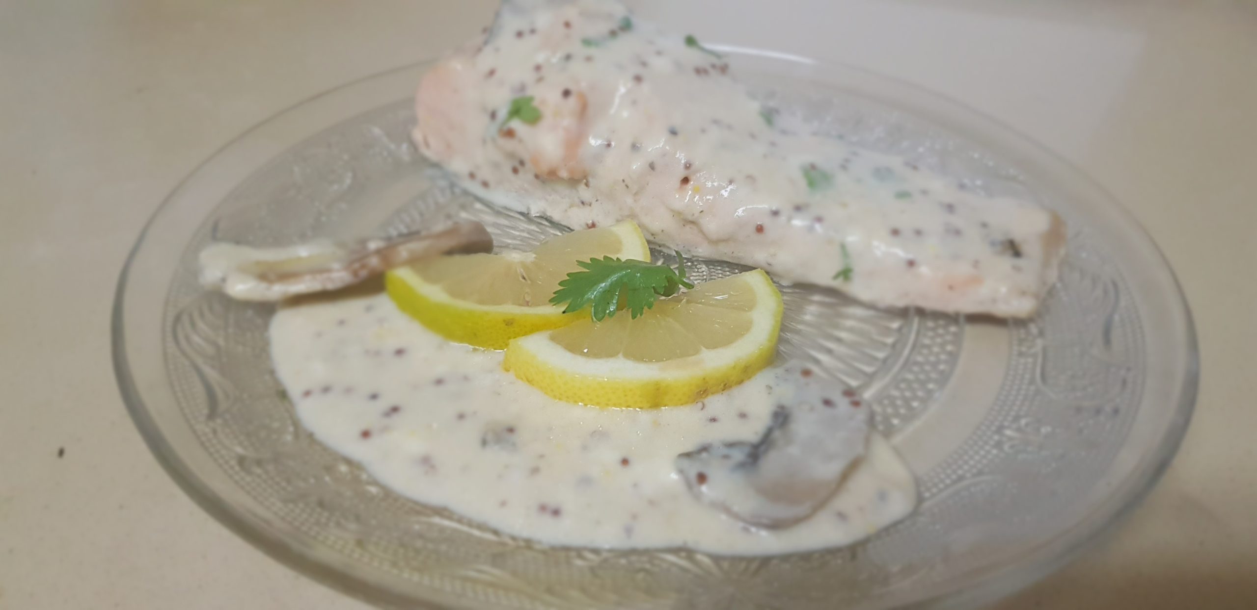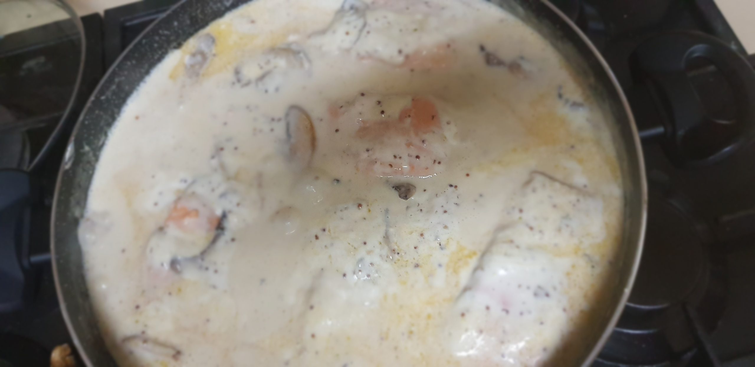 Quand la sauce s’est épaissie, ajoutez la crème, la moutarde et donnez un tour de moulin.