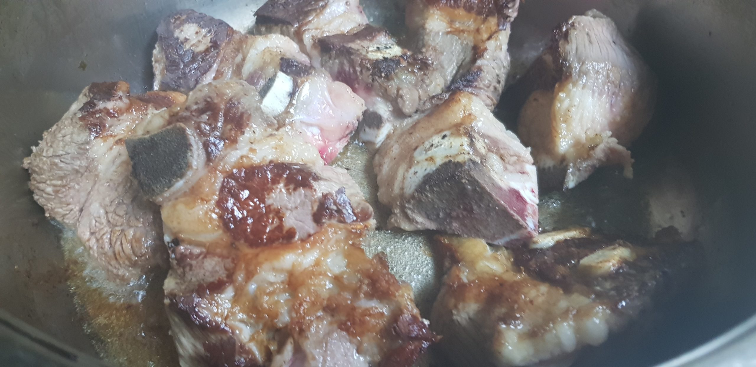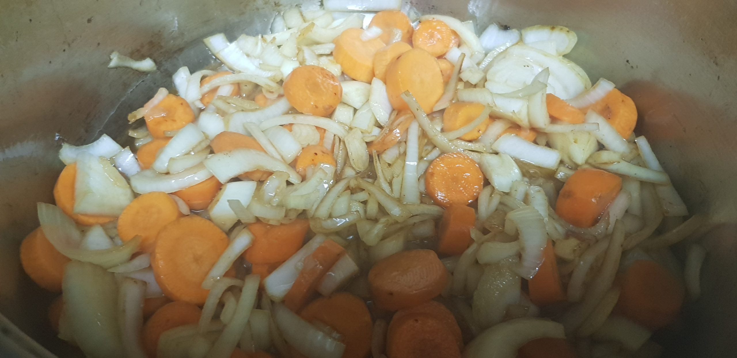2 – Après la friture, mettez la viande de côté et dans la même casserole, faites maintenant revenir l’oignon avec les carottes pendant 10 minutes.