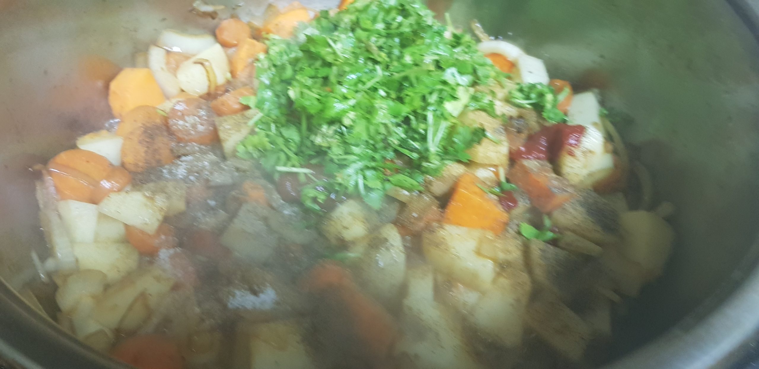 5 – Bien mélanger, porter le ragoût à ébullition, couvrir avec un couvercle, baisser la flamme et cuire environ une demi-heure.
