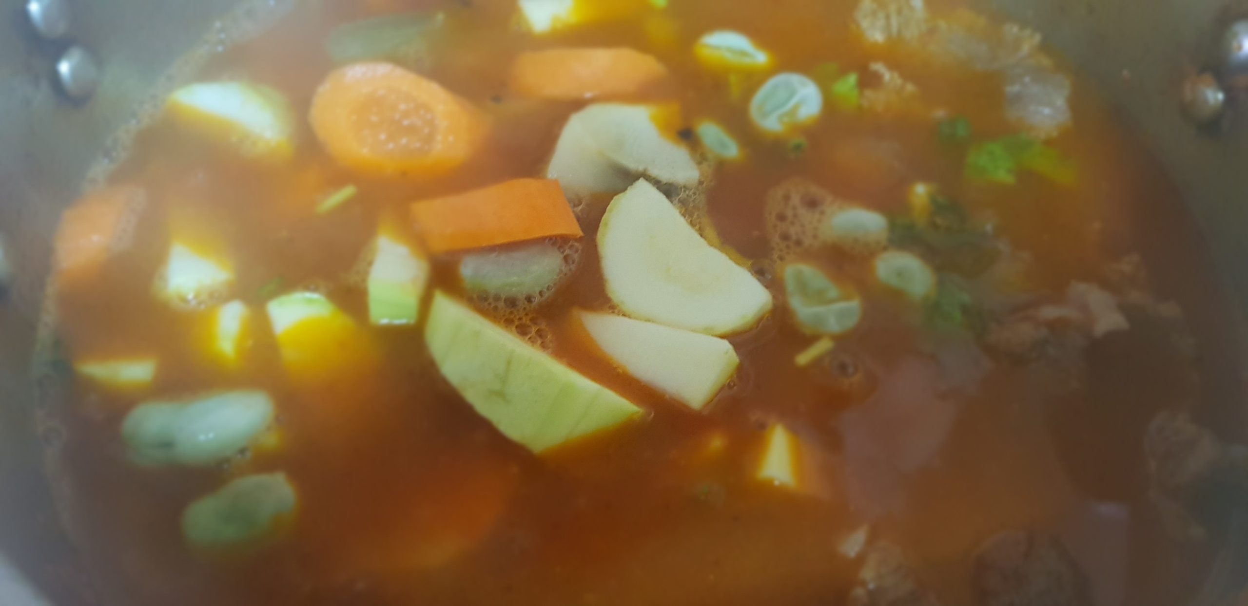 Après que le bouillon commence à épaissir, ajouter de l’eau jusqu’à la hauteur de la casserole, laisser bouillir, ensuite ajouter les carottes, des morceaux de chou-rave, de branches de céleri et des épices: curcuma, sel, bouillon de poulet et paprika rouge.