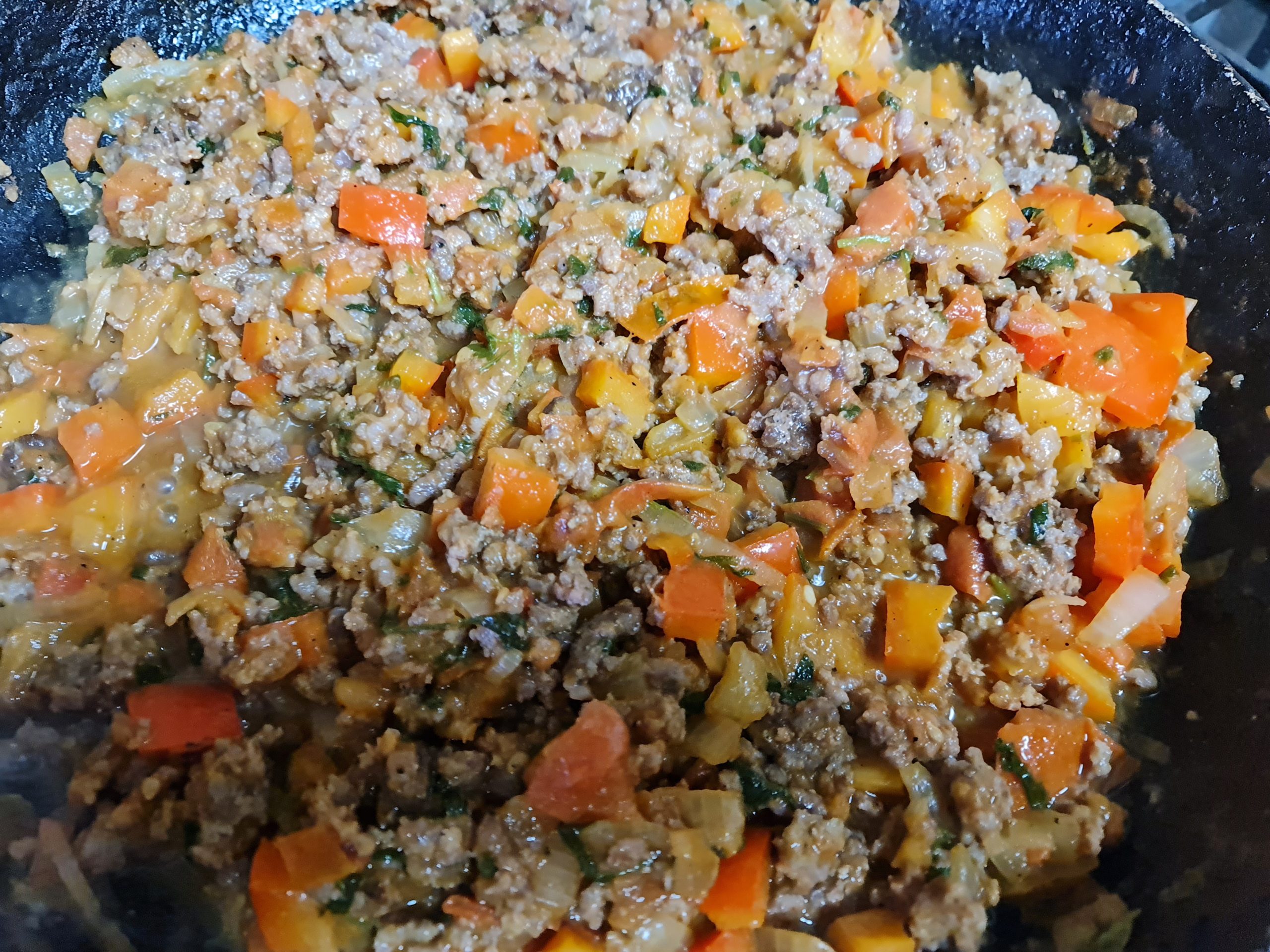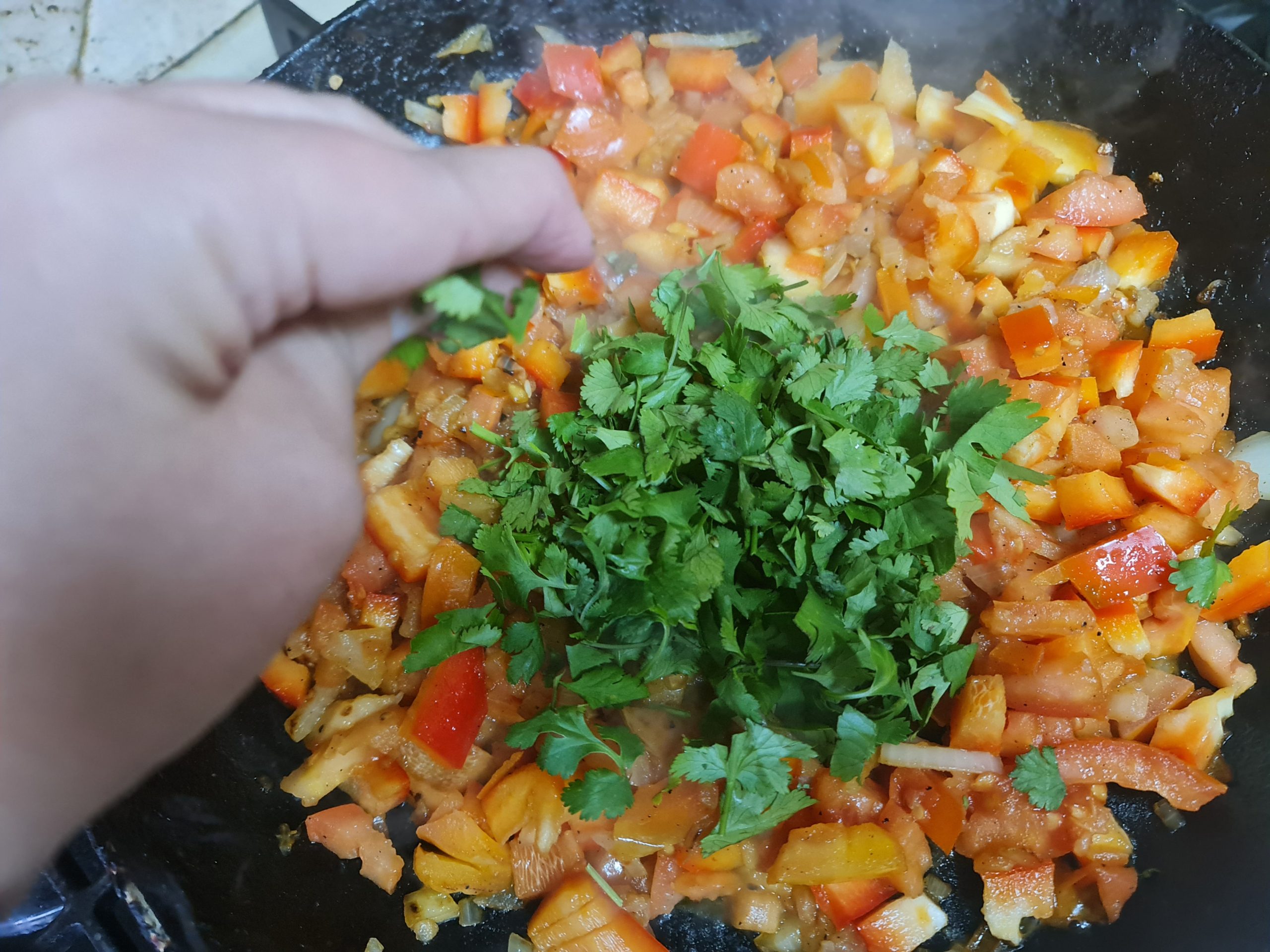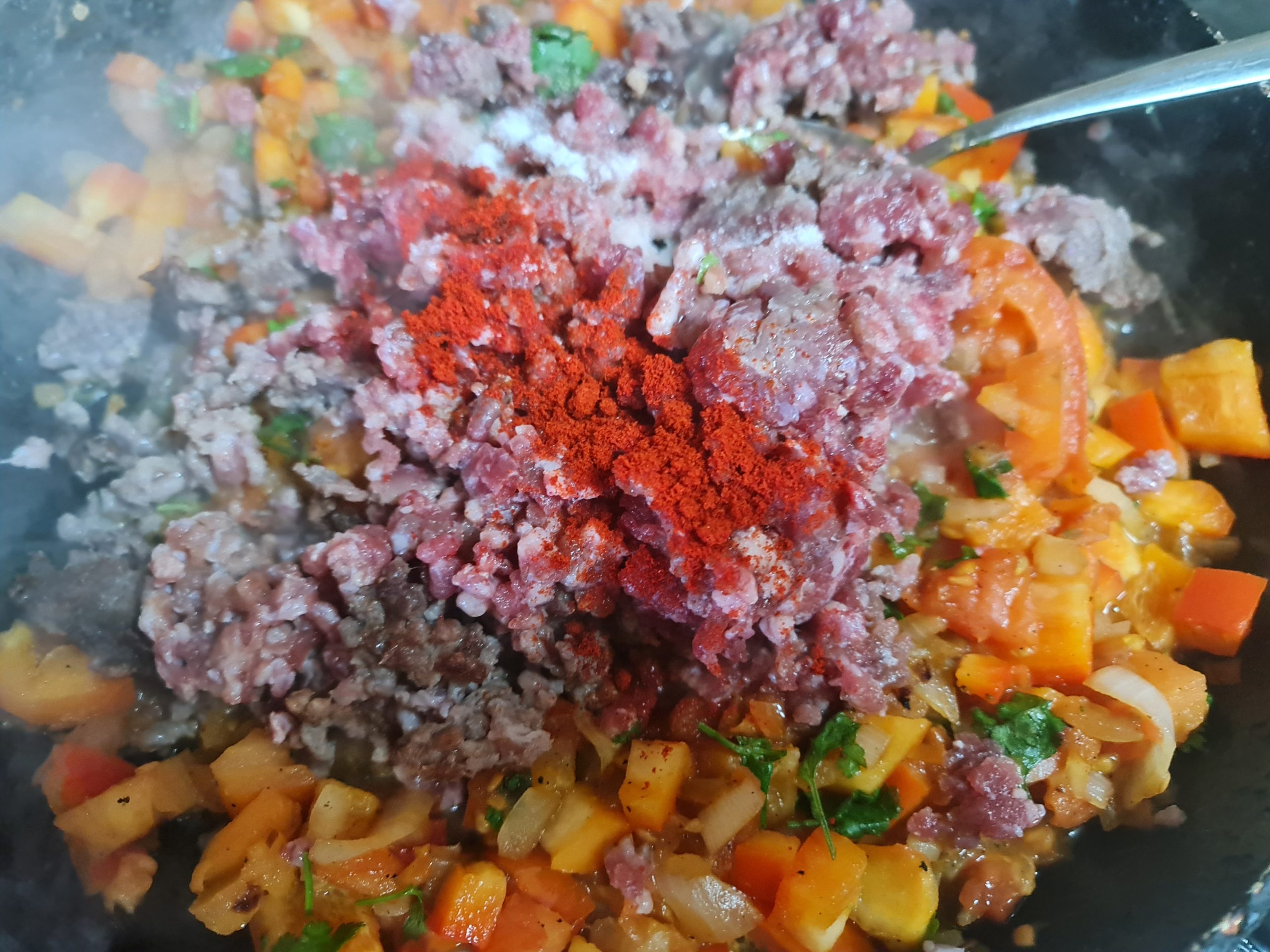 Préparer la farce à la viande : chauffer une cuillère à soupe d’huile d’olive, cuire la viande hachée. Dés qu’elle est cuite, la retirer et ajouter dans le jus de la viande, l’ail et l’oignon haché, et laisser cuire 5 minutes, ajouter les poivrons, puis les tomates en petit morceaux, et ensuite les épices et à la fin la coriandre fraiche émincée. Laisser cuire 10 minutes et réserver.