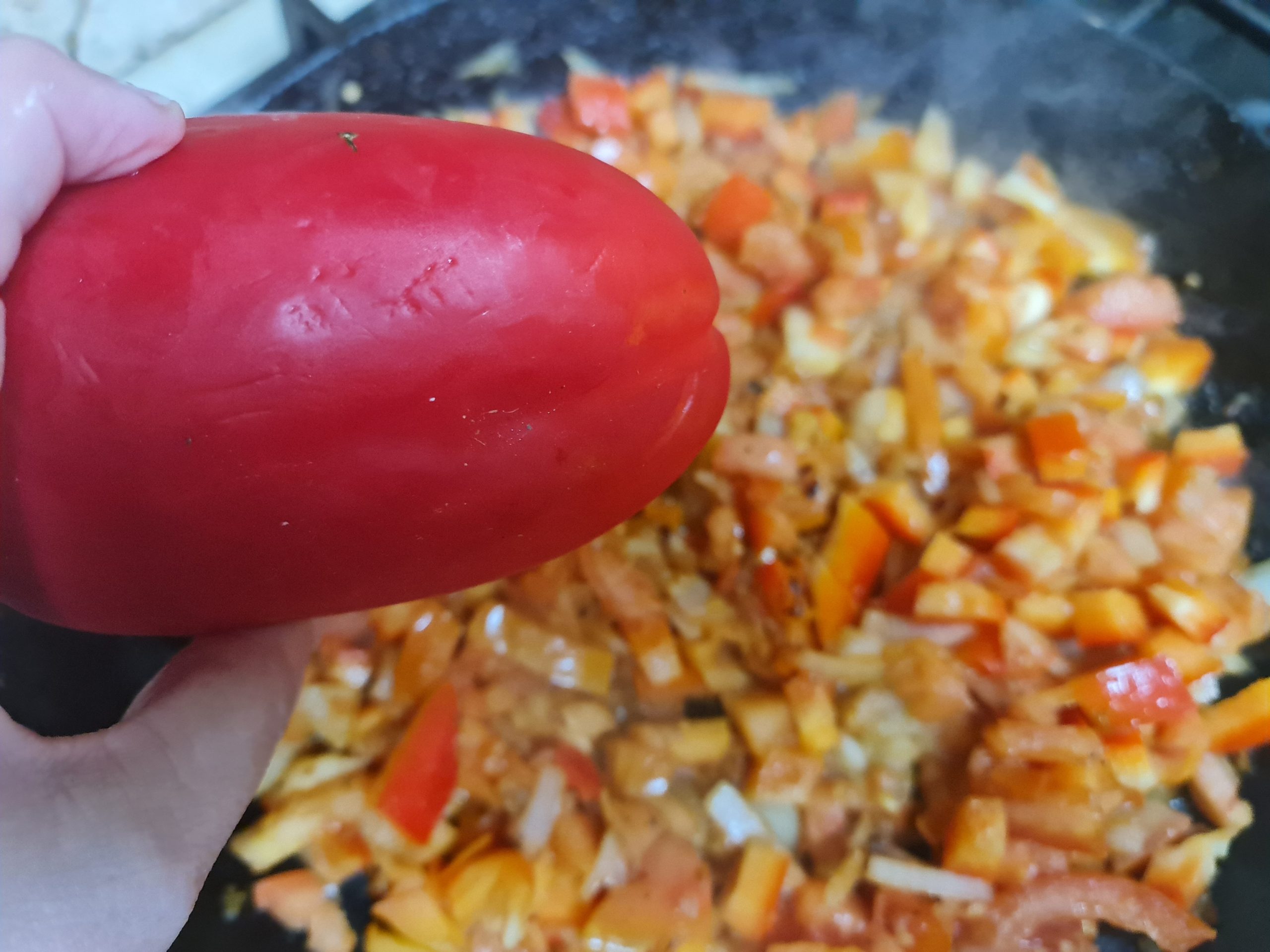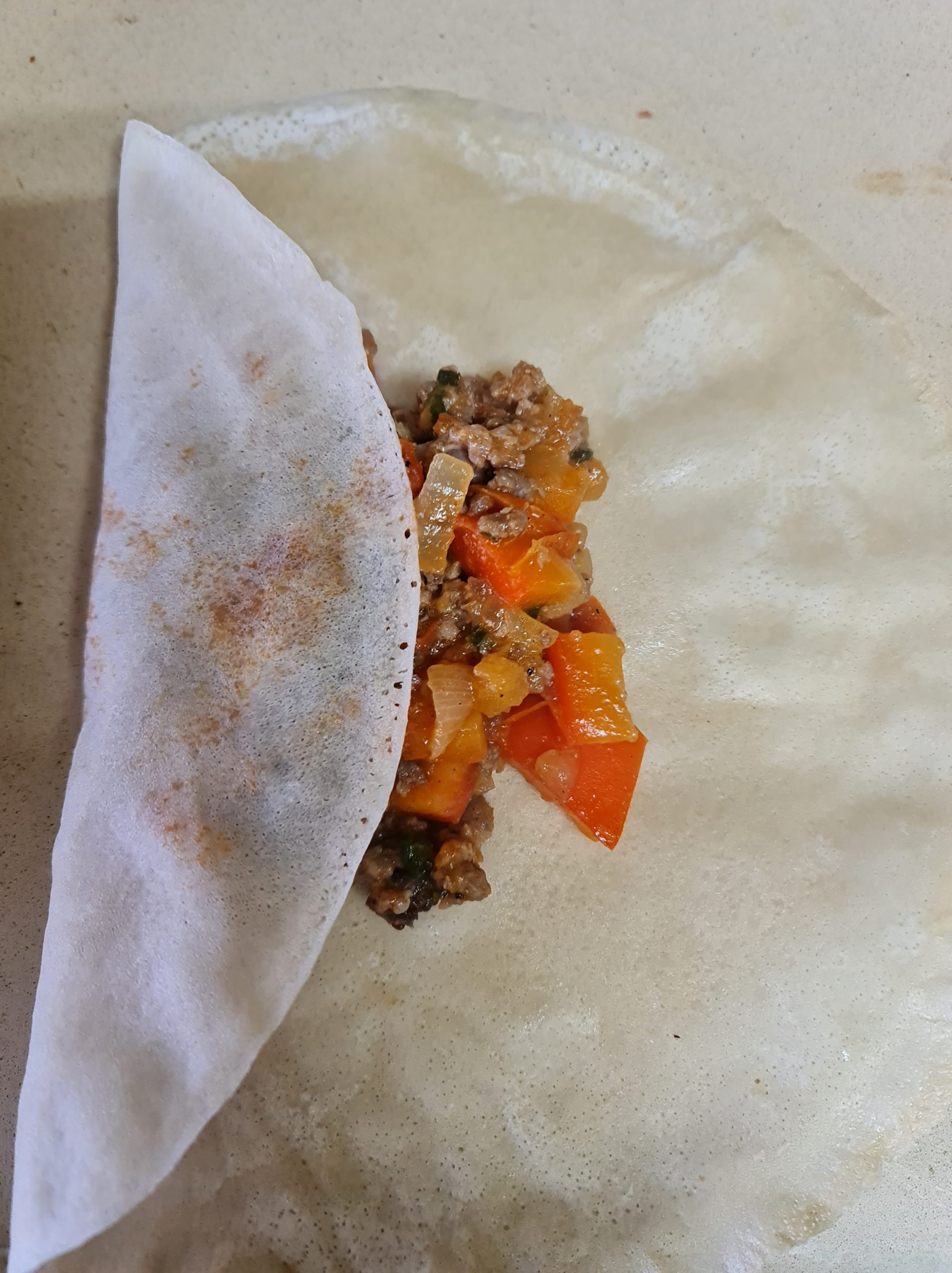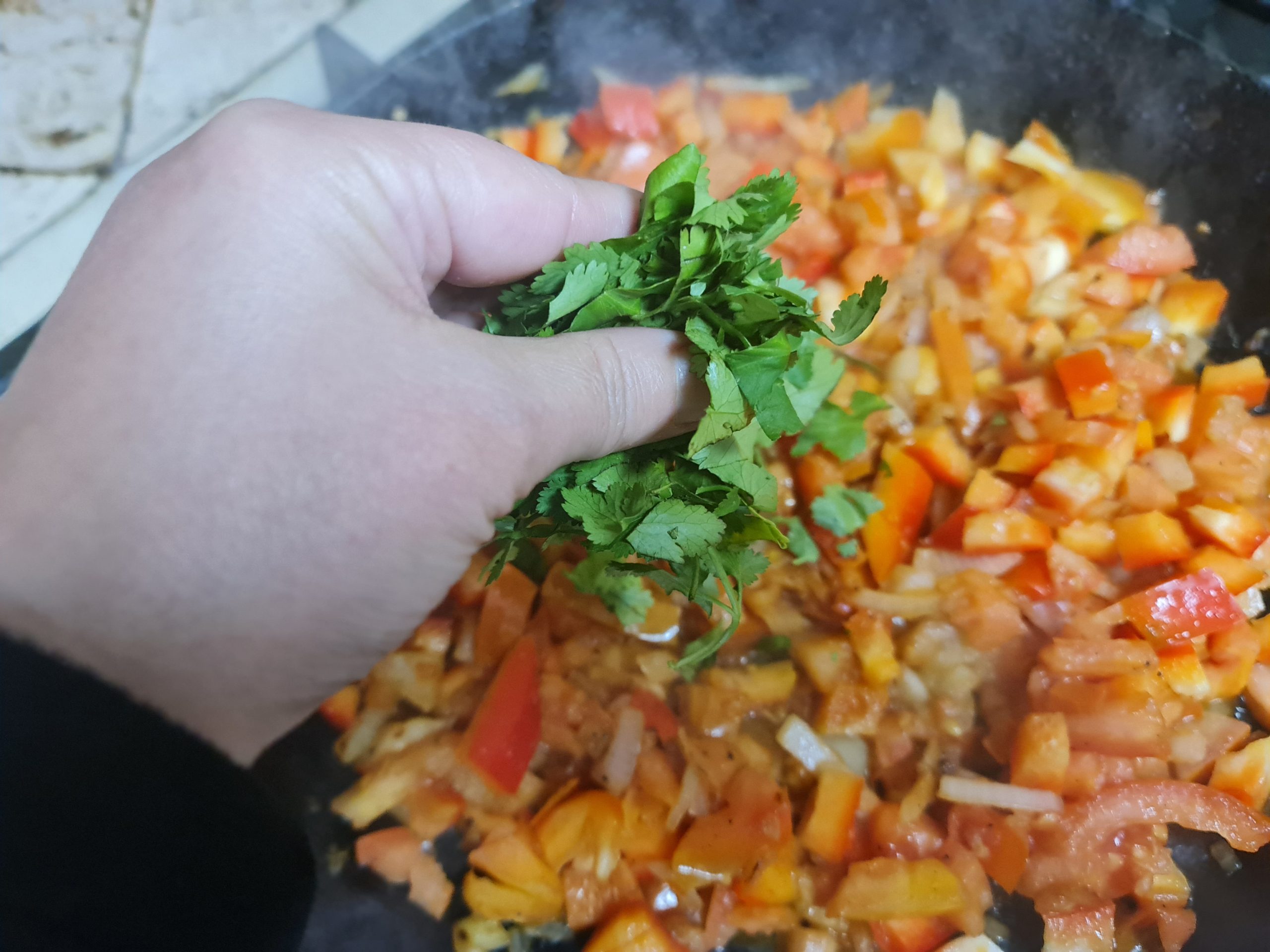 Préparer la farce à la viande : chauffer une cuillère à soupe d’huile d’olive, cuire la viande hachée. Dés qu’elle est cuite, la retirer et ajouter dans le jus de la viande, l’ail et l’oignon haché, et laisser cuire 5 minutes, ajouter les poivrons, puis les tomates en petit morceaux, et ensuite les épices et à la fin la coriandre fraiche émincée. Laisser cuire 10 minutes et réserver.