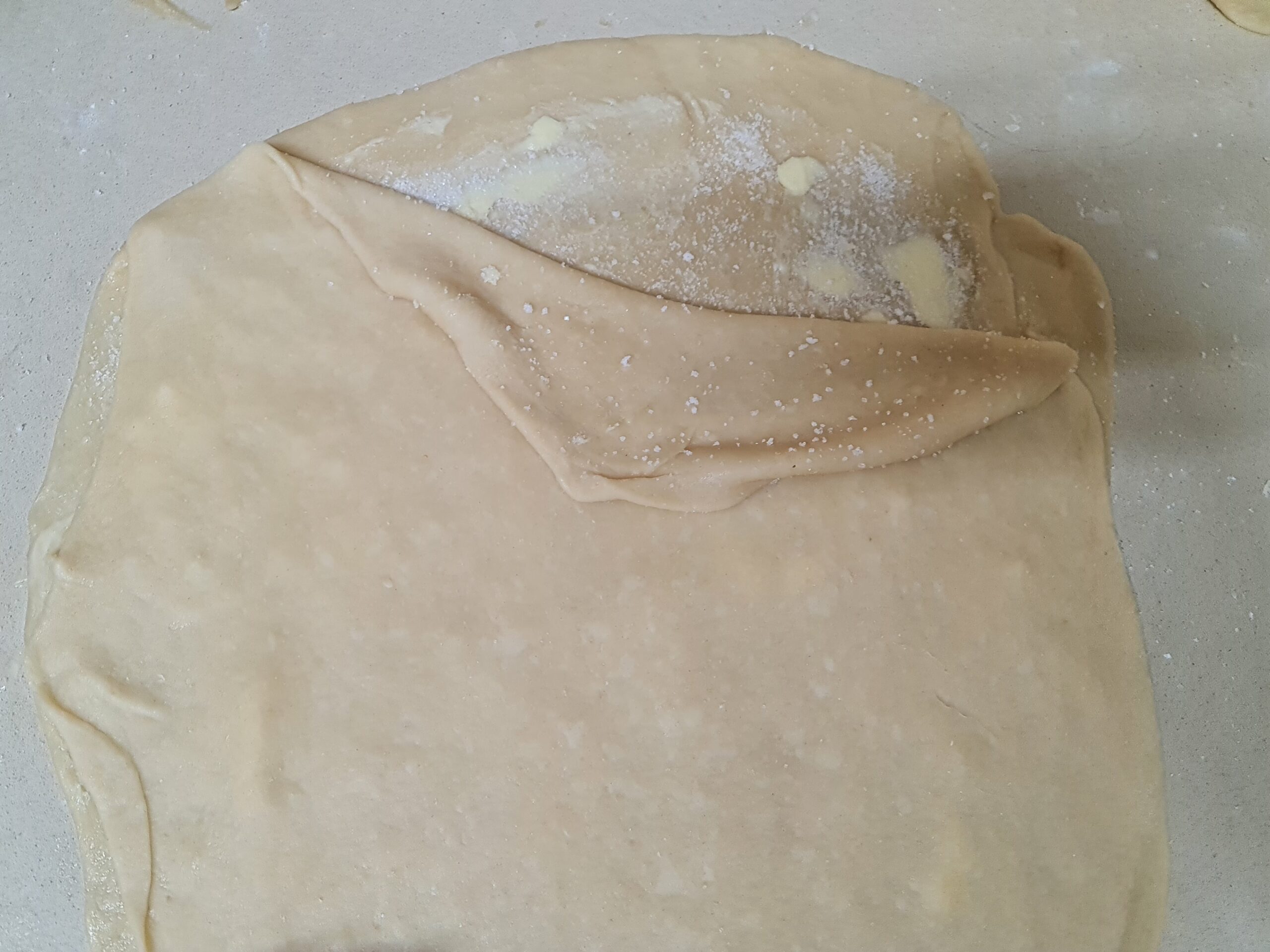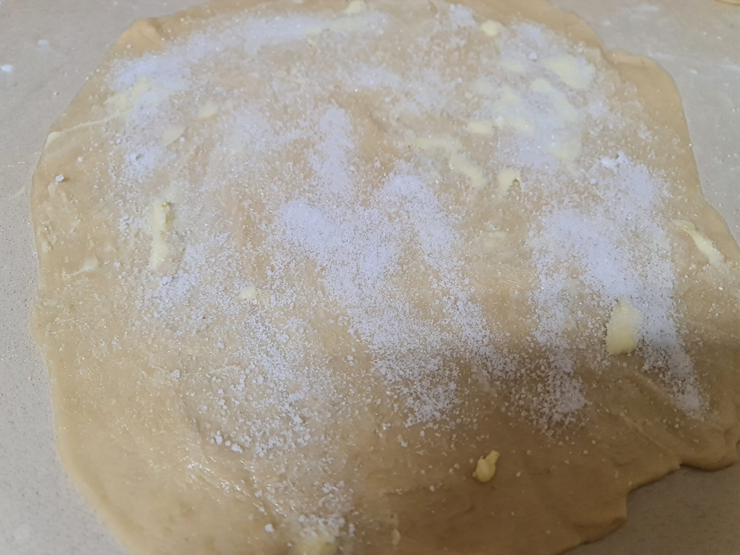 - Etaler une boule en une forme ronde de la taille d’une pizza familiale, étaler généreusement dessus du beurre mou, saupoudrer généreusement de sucre, plus 1 sucre vanillé dessus