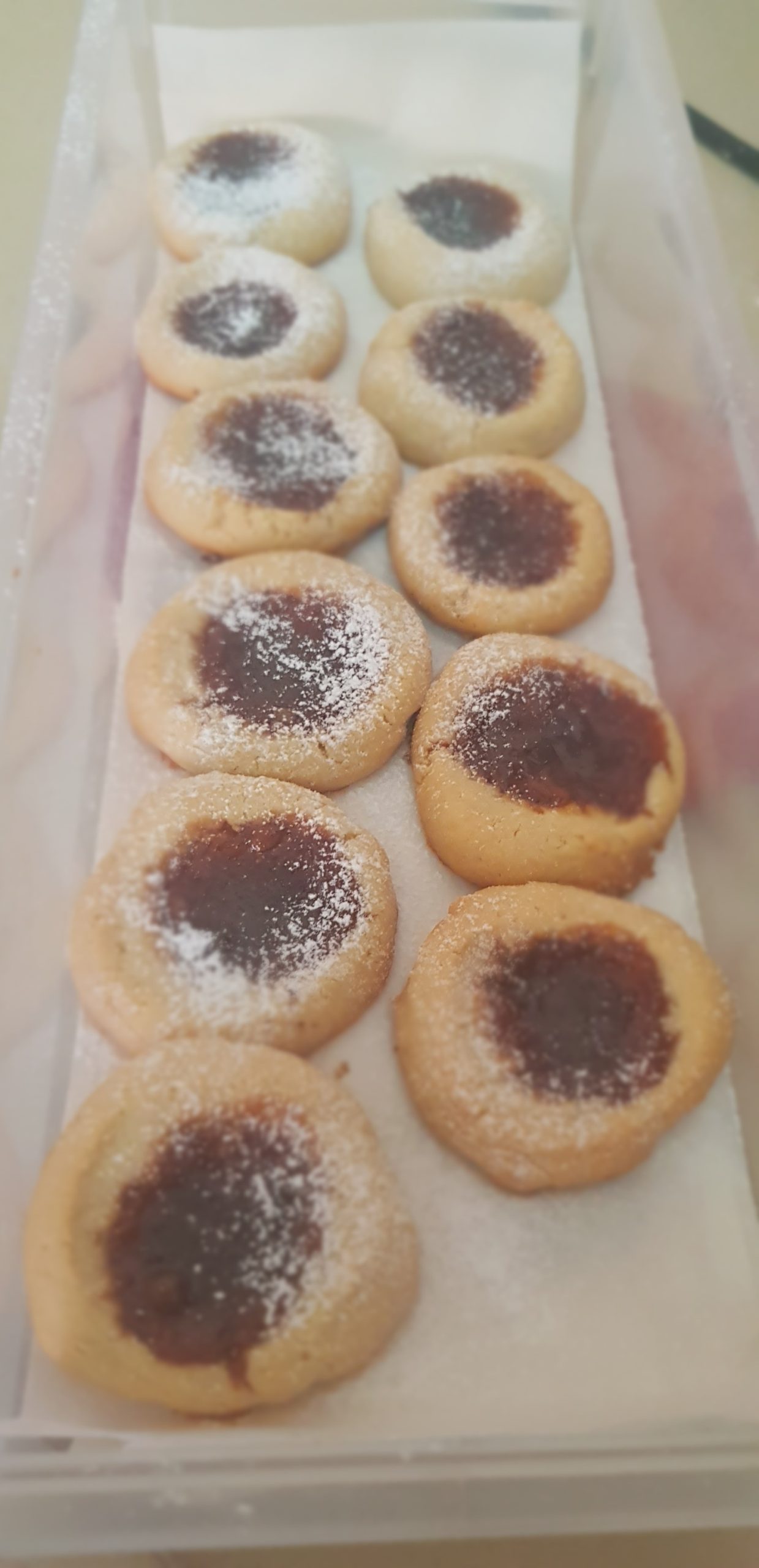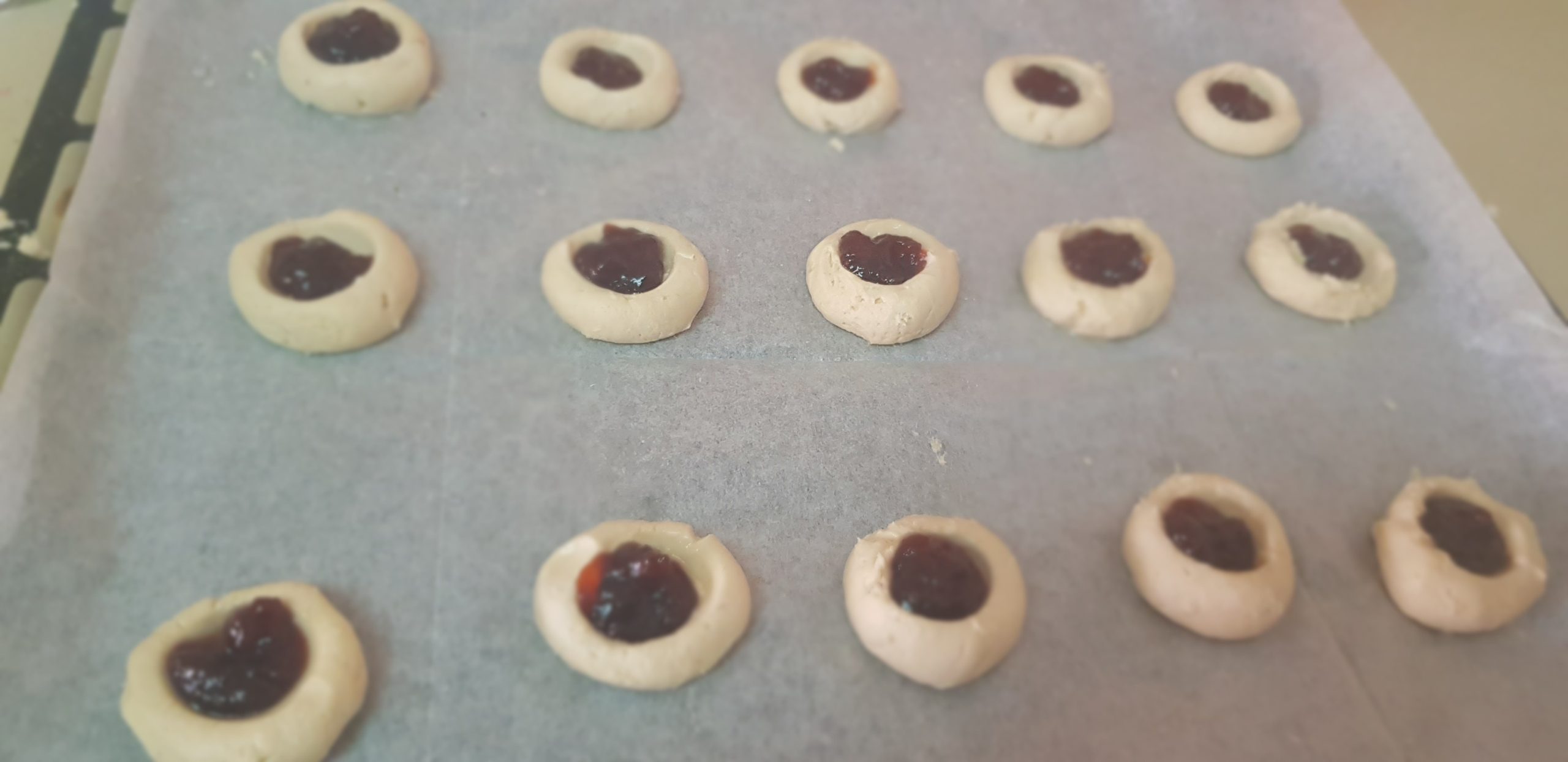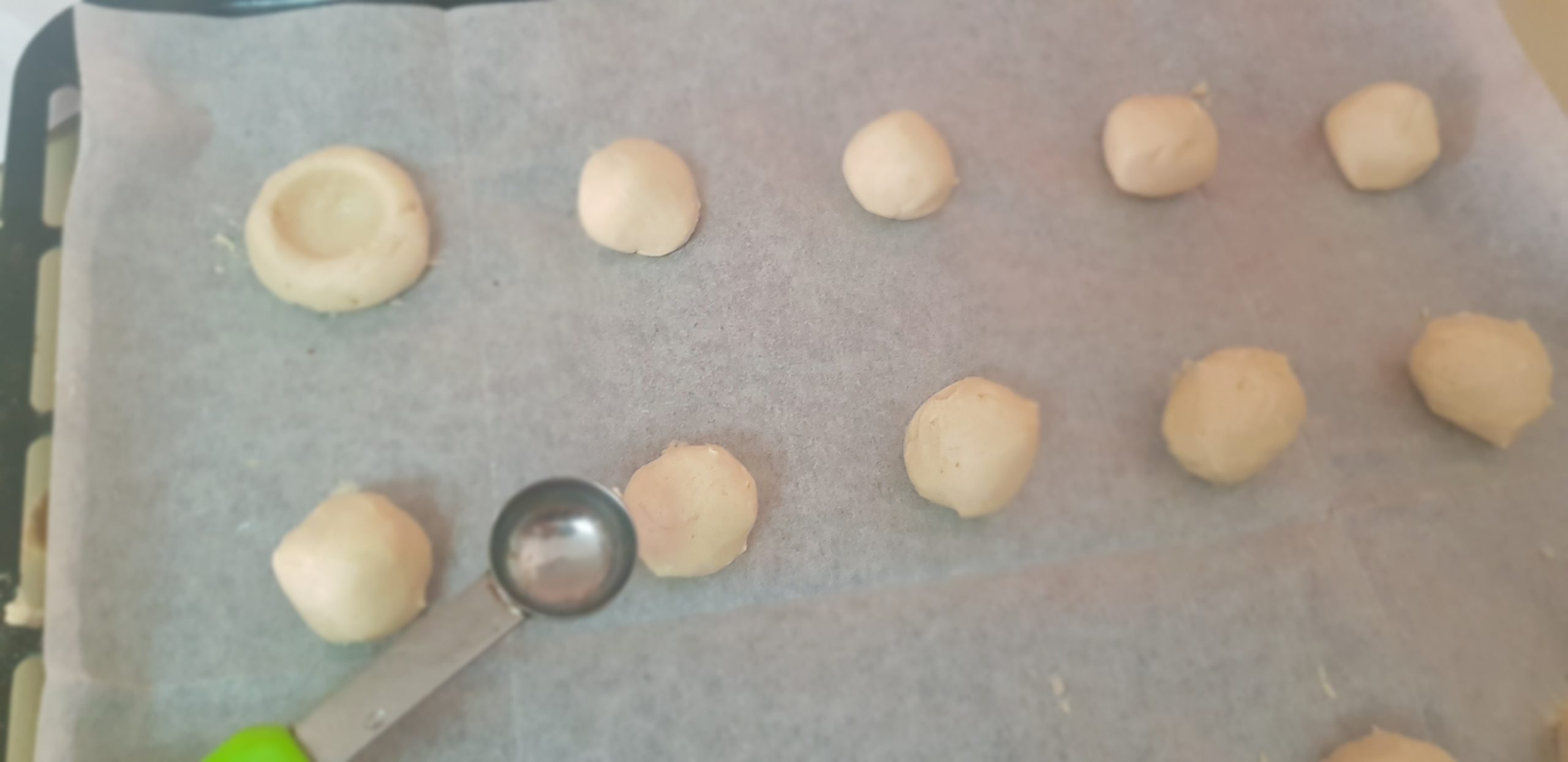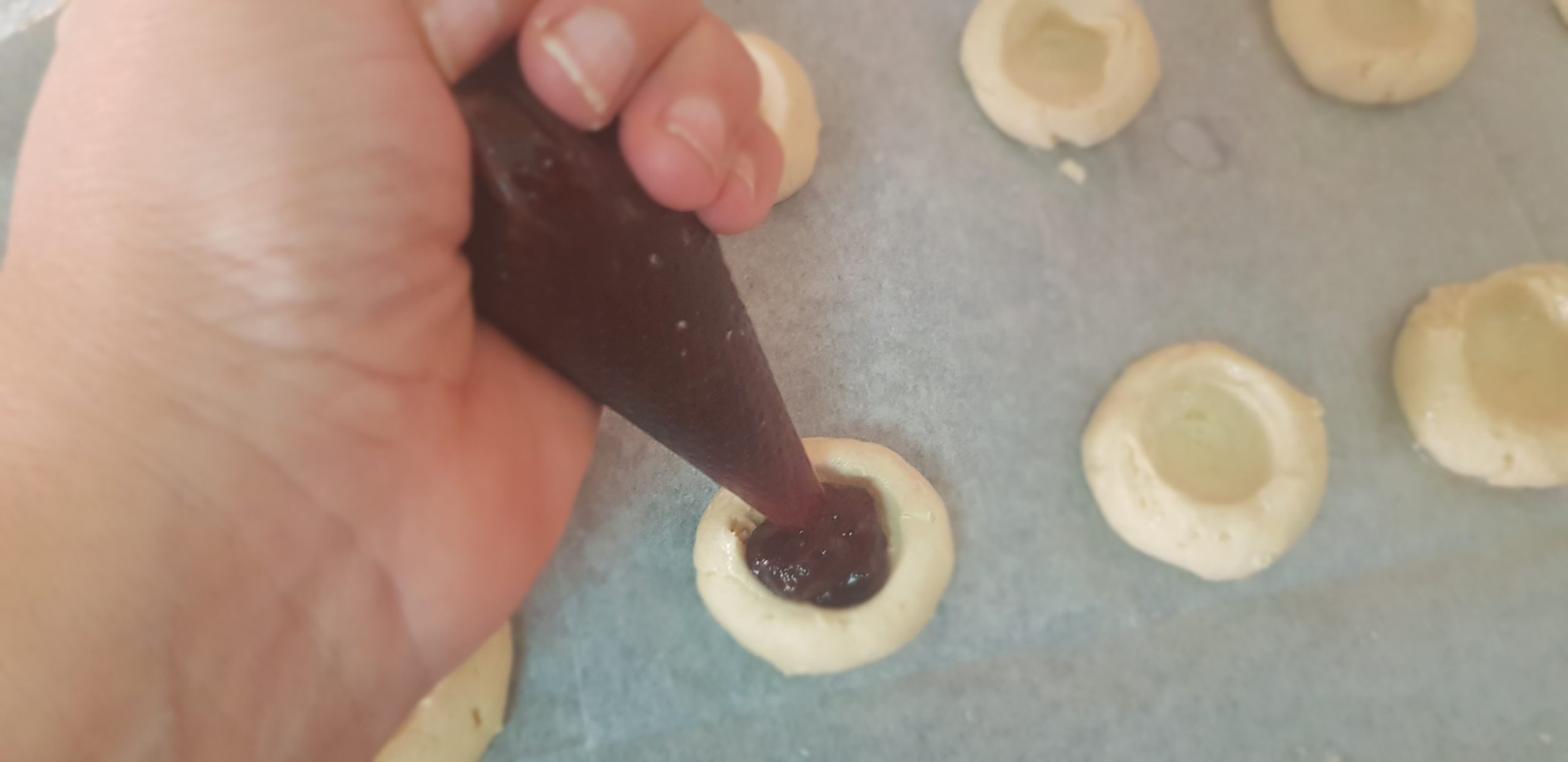 Si vous n’avez pas l’embout spécial pour la poche à douille, mouiller vos mains et faites des petits rond, légèrement aplati, dans lesquels , vous ferez un trou et insérer la confiture (ce que j’ai fait dans la recette).