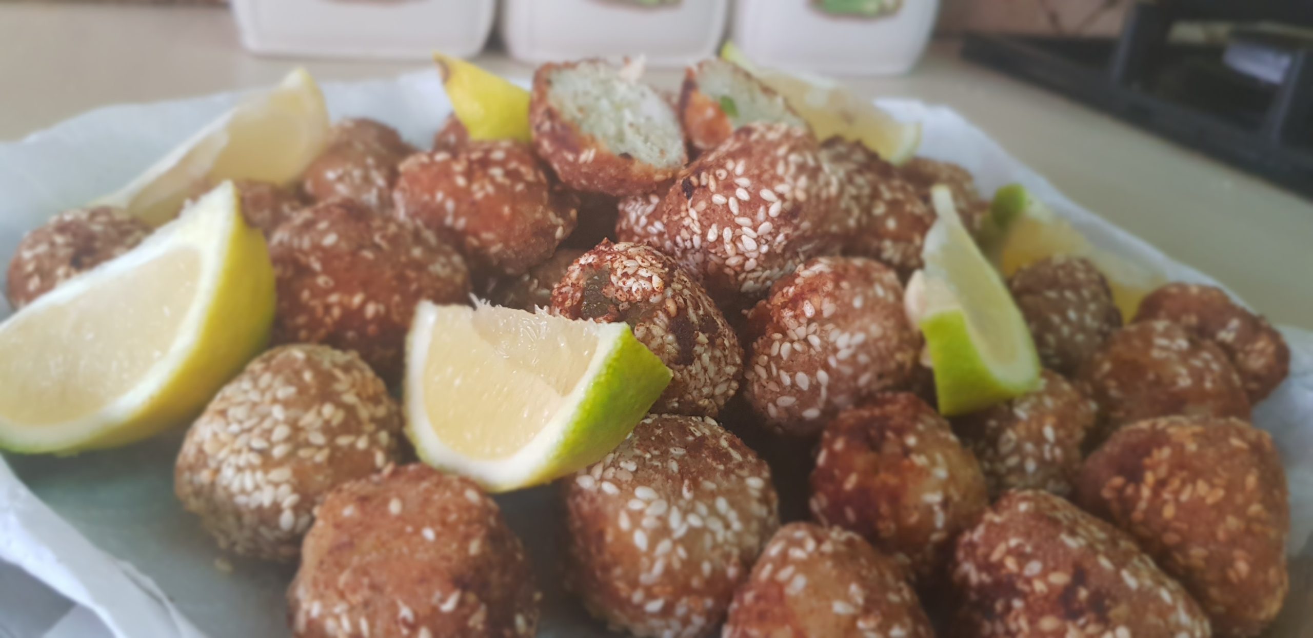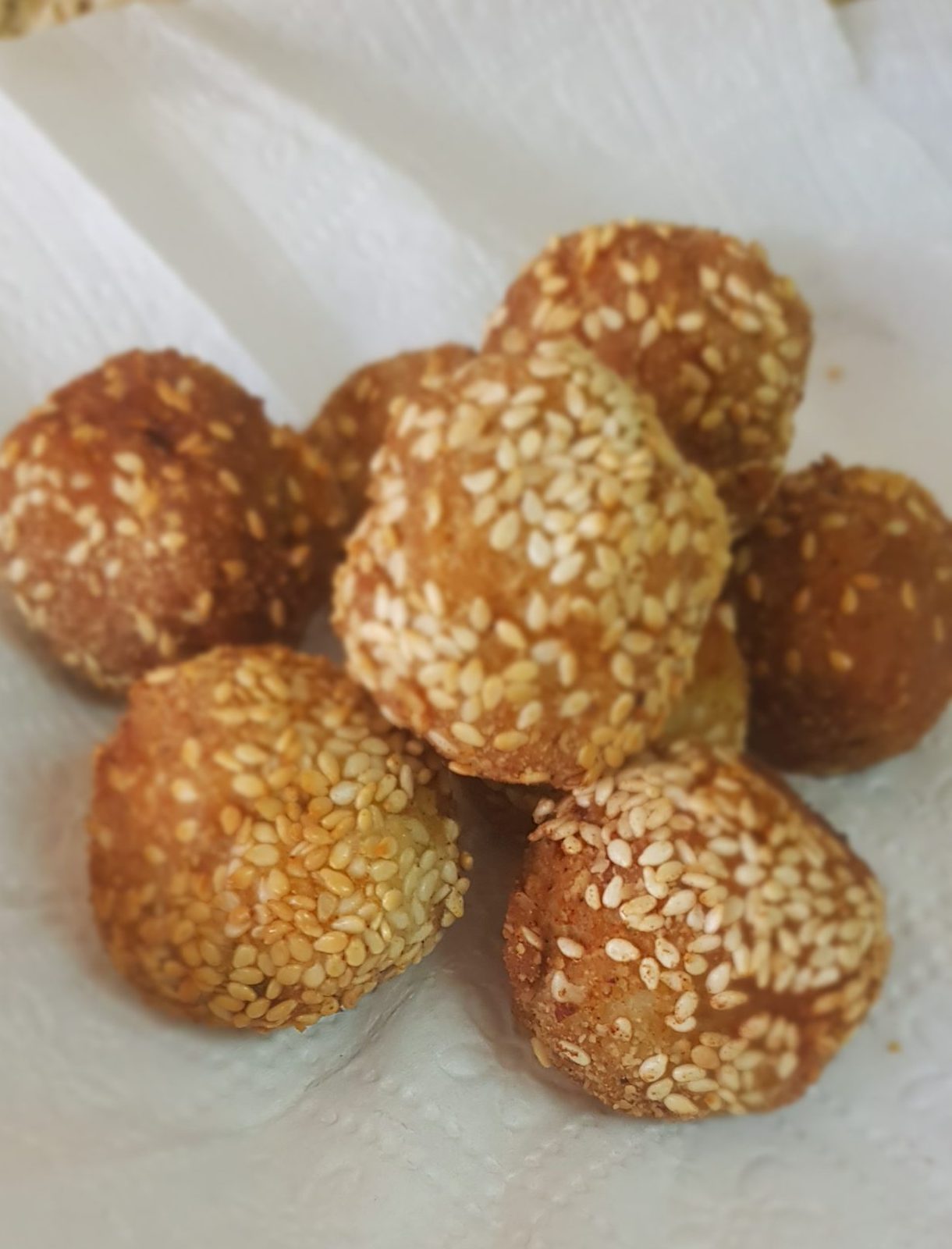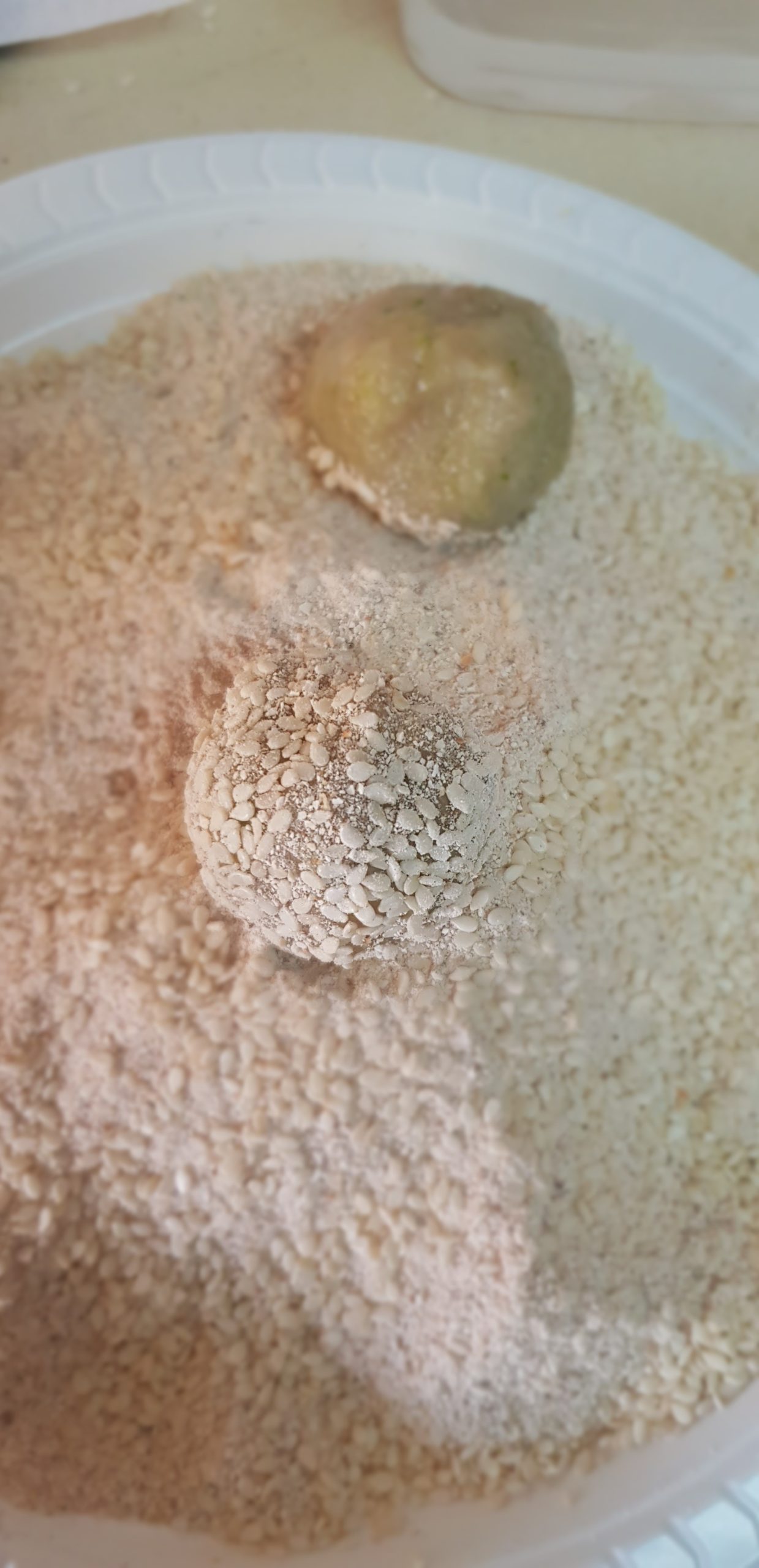Faire des ronds, enrober de panure avec des graines de sésames et faire frire.