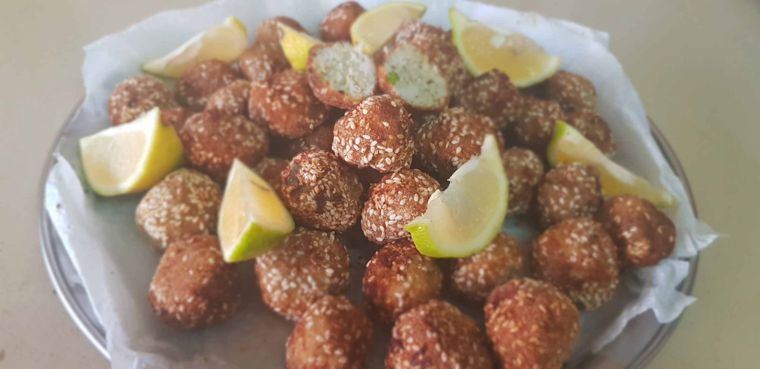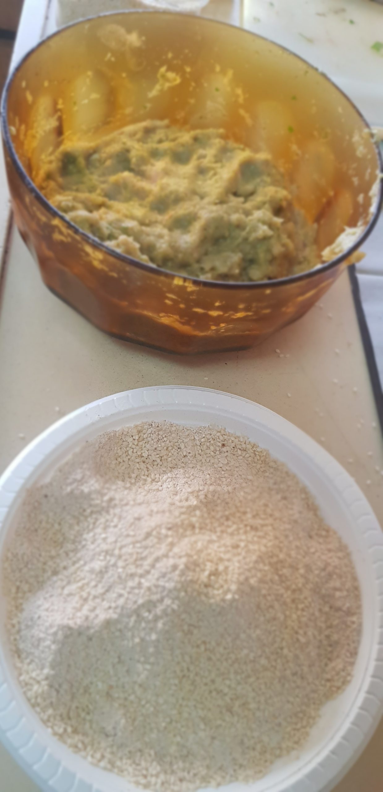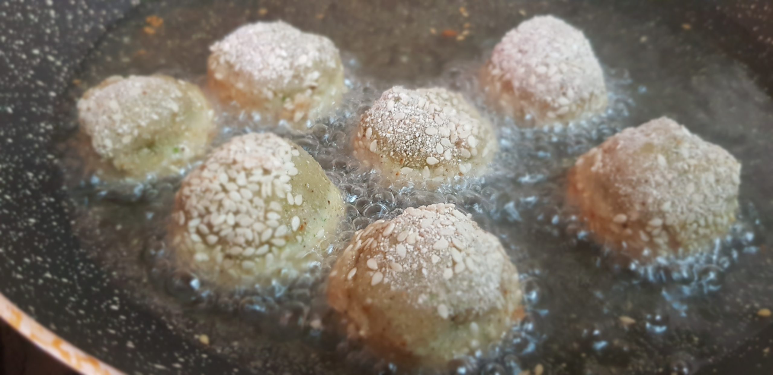 Faire des ronds, enrober de panure avec des graines de sésames et faire frire.
