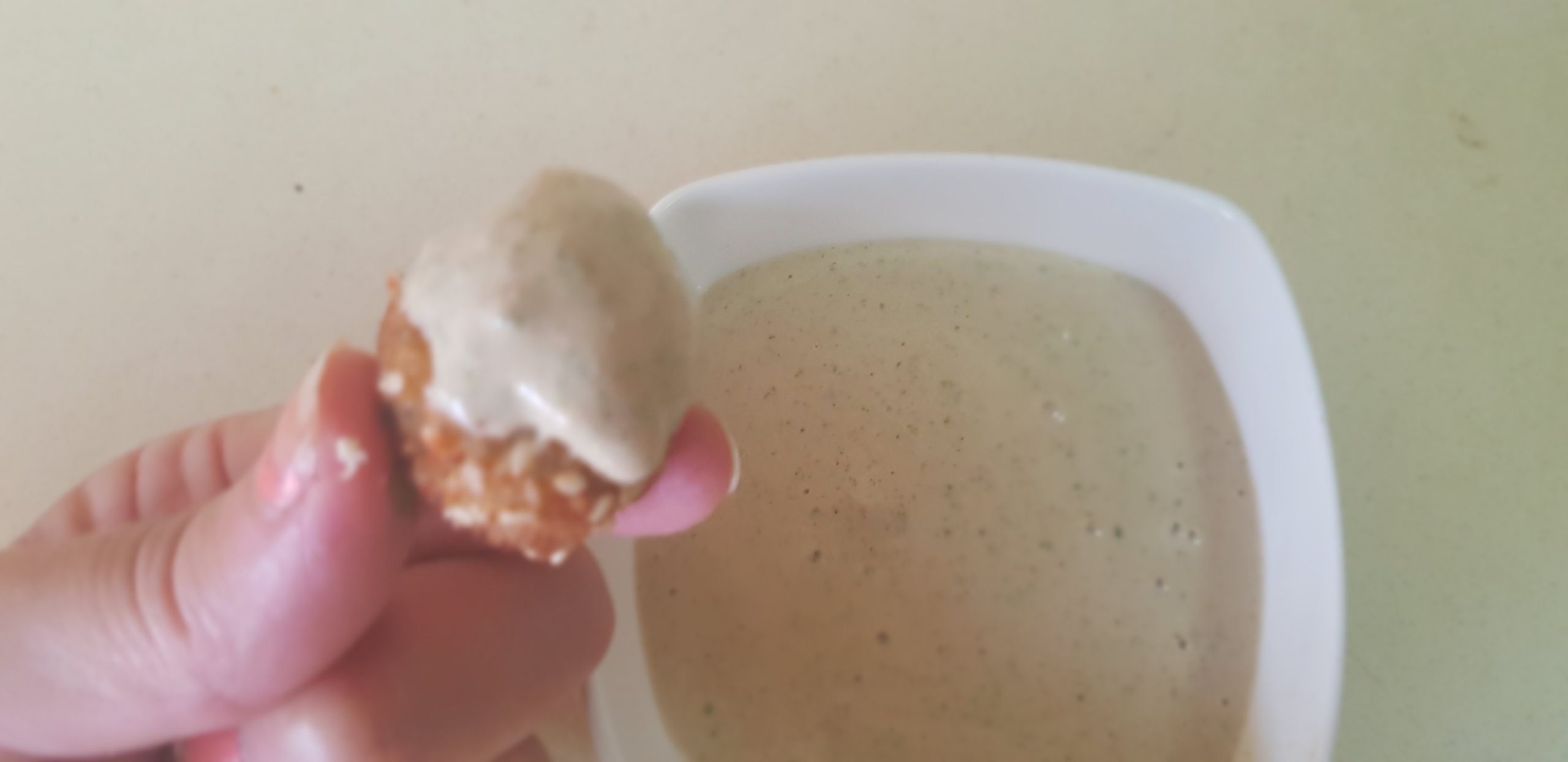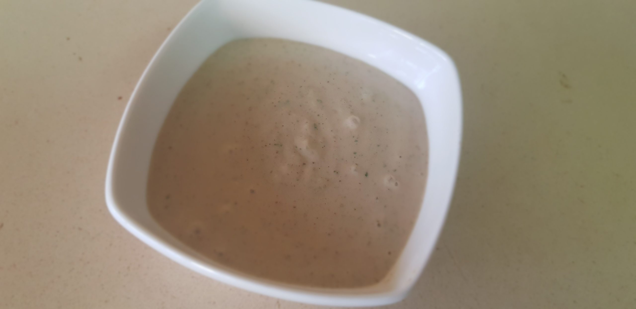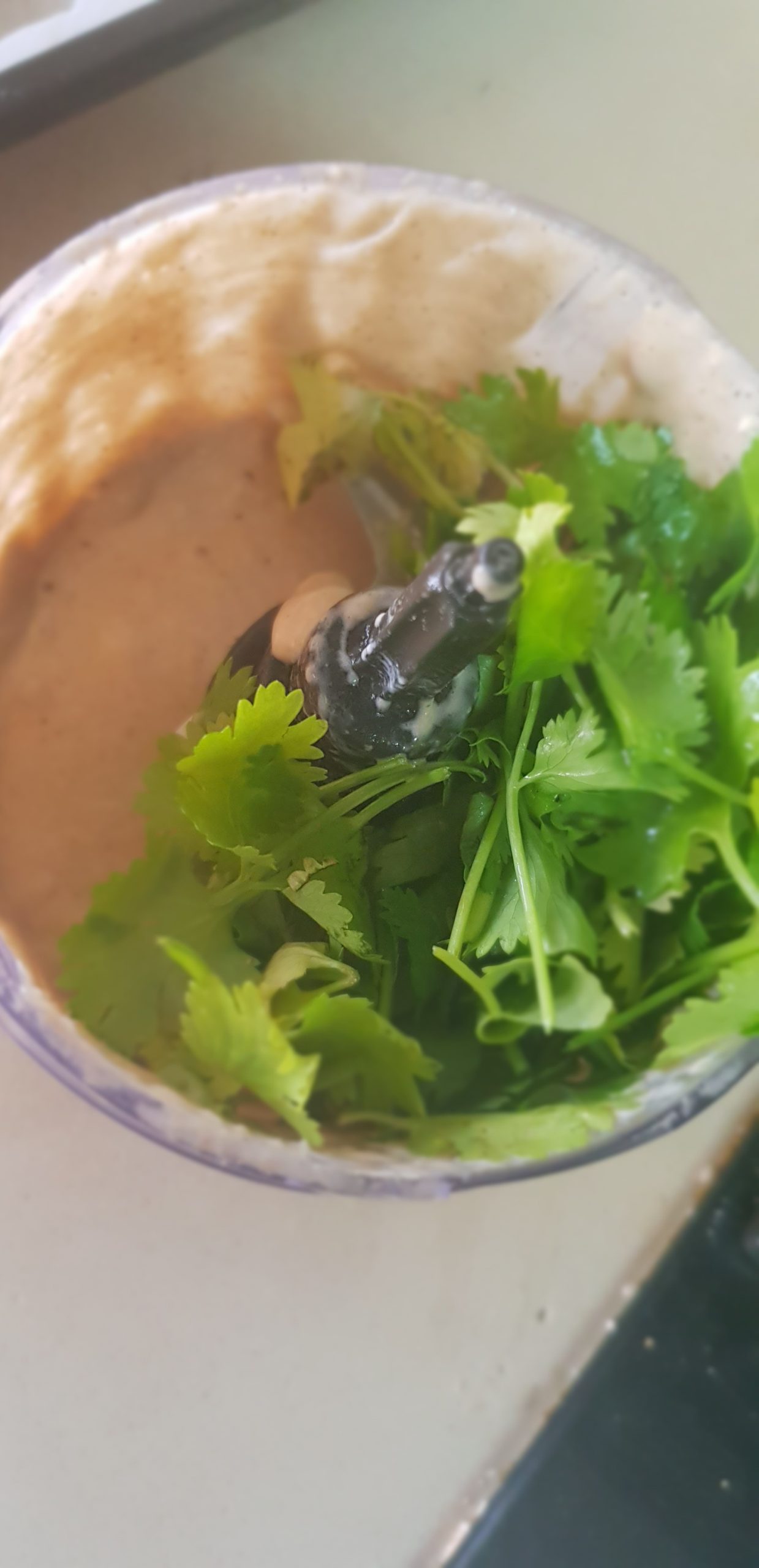 Dans un hachoir, mettre 3 cuillères à soupe de tehina, 4 gousses d’ails, sel, poivre, et un demi jus de citron et un demi verre d’eau et la moitié d’un bouquet de coriandre et hachée le tout, si la sauce est trop épaisse, ajouter un peu d ‘eau.