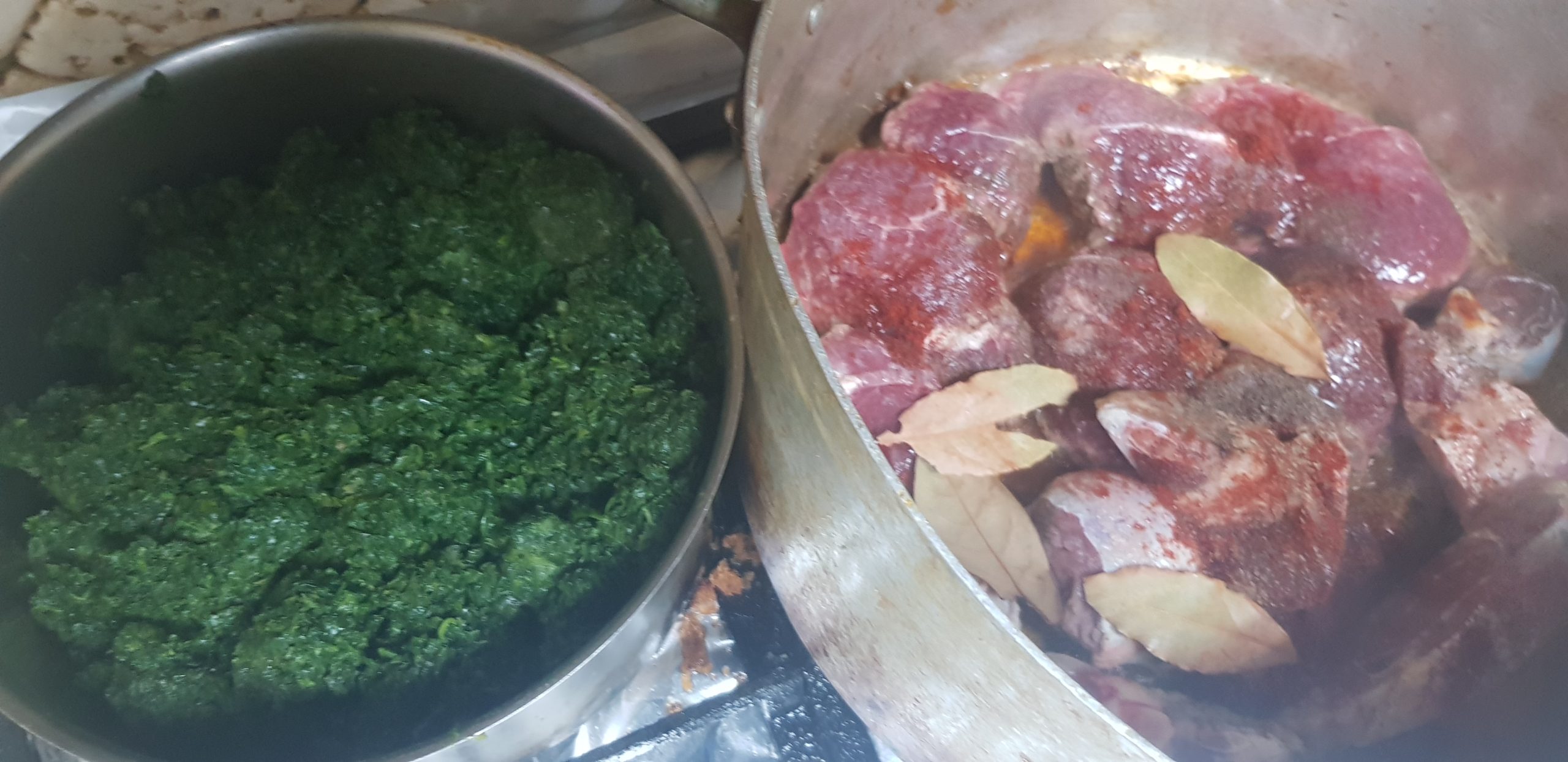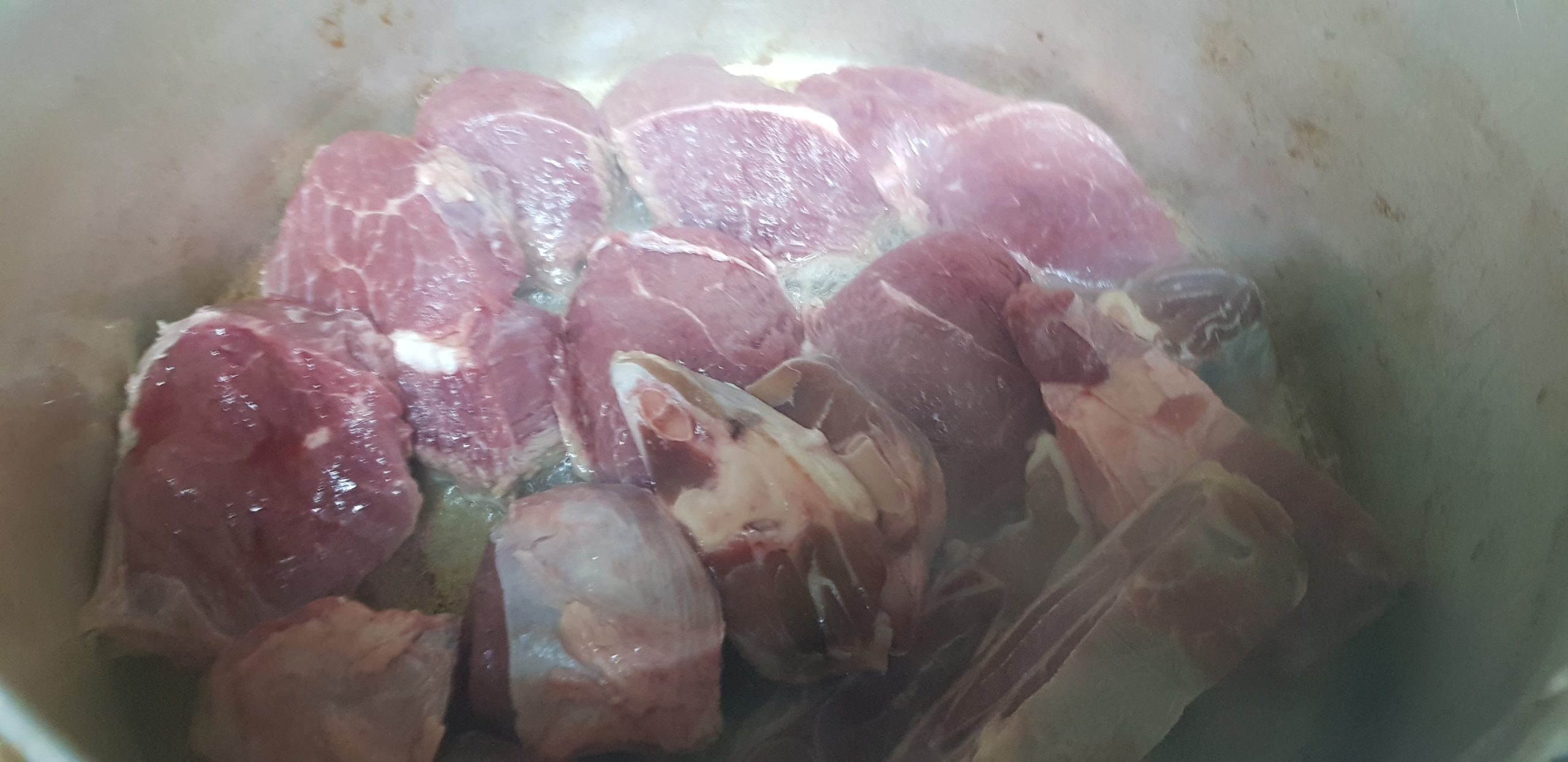 Dans une autre marmite, faire revenir votre viande et os dans un peu d’huile, et ajouter l’oignon et ail et épices.