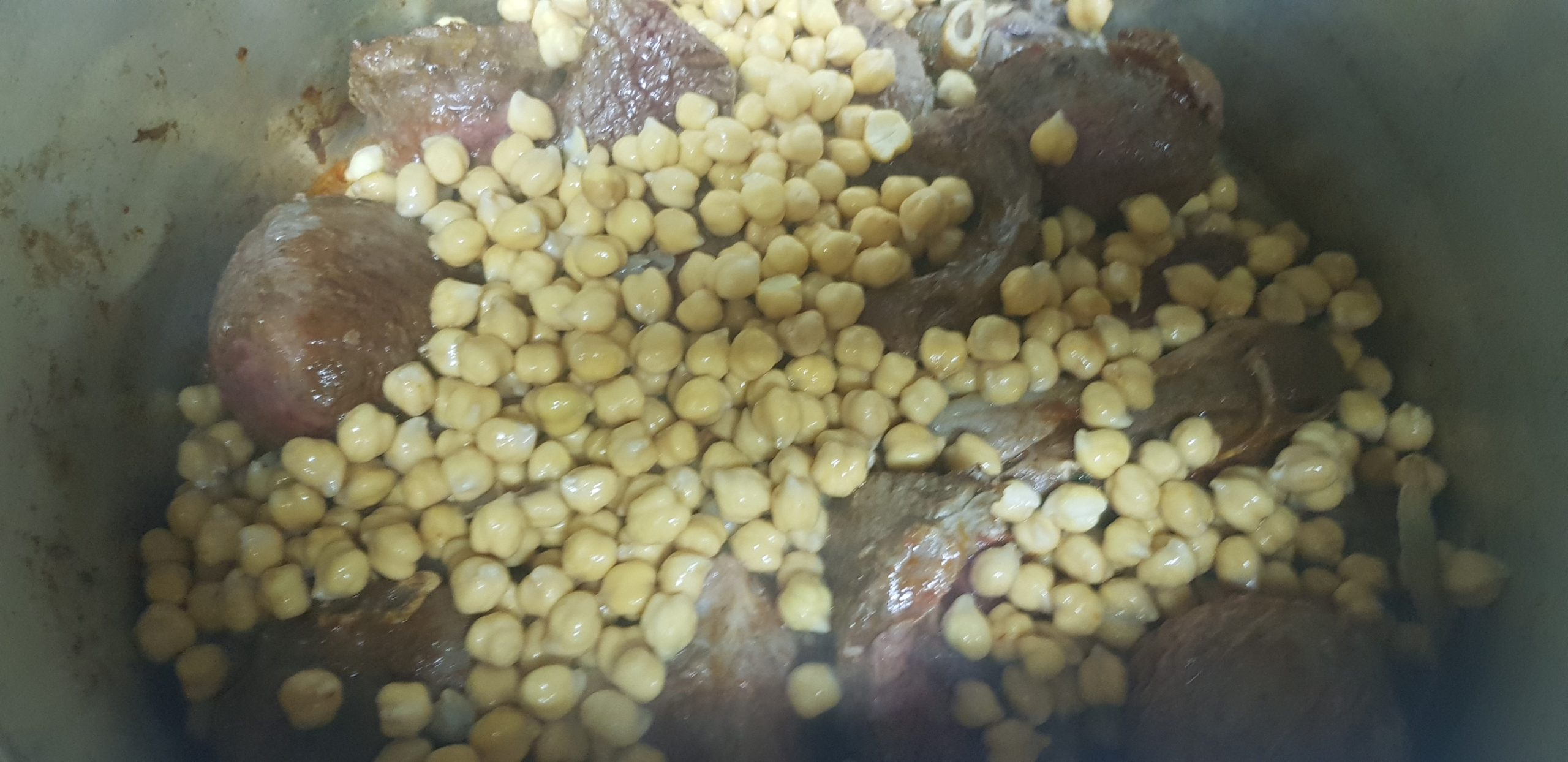 Laisser revenir la viande 20 minutes sans qu’elle brule puis ajouter les pois chiche.