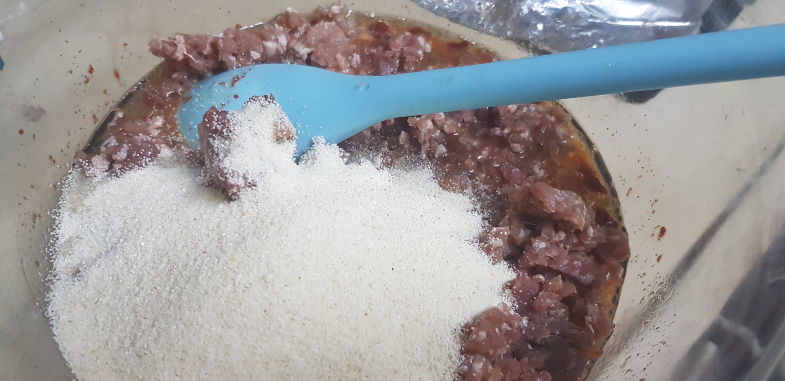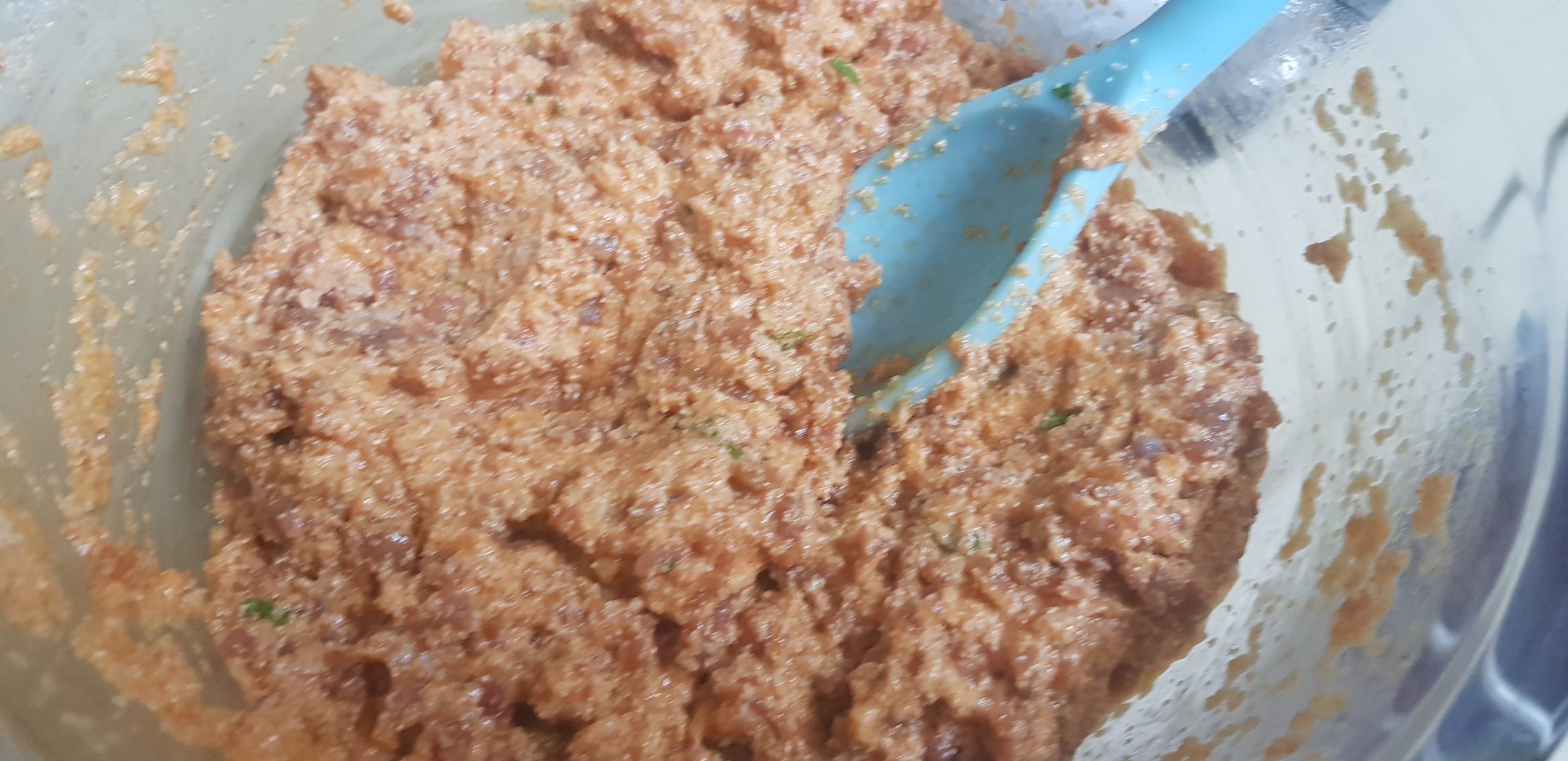 Mélanger, dans un bol, la viande hachée, les oeufs battus, la menthe ciselée, la semoule, sel, poivre et paprika et un peu d’eau nécessaire pour une pate collante.