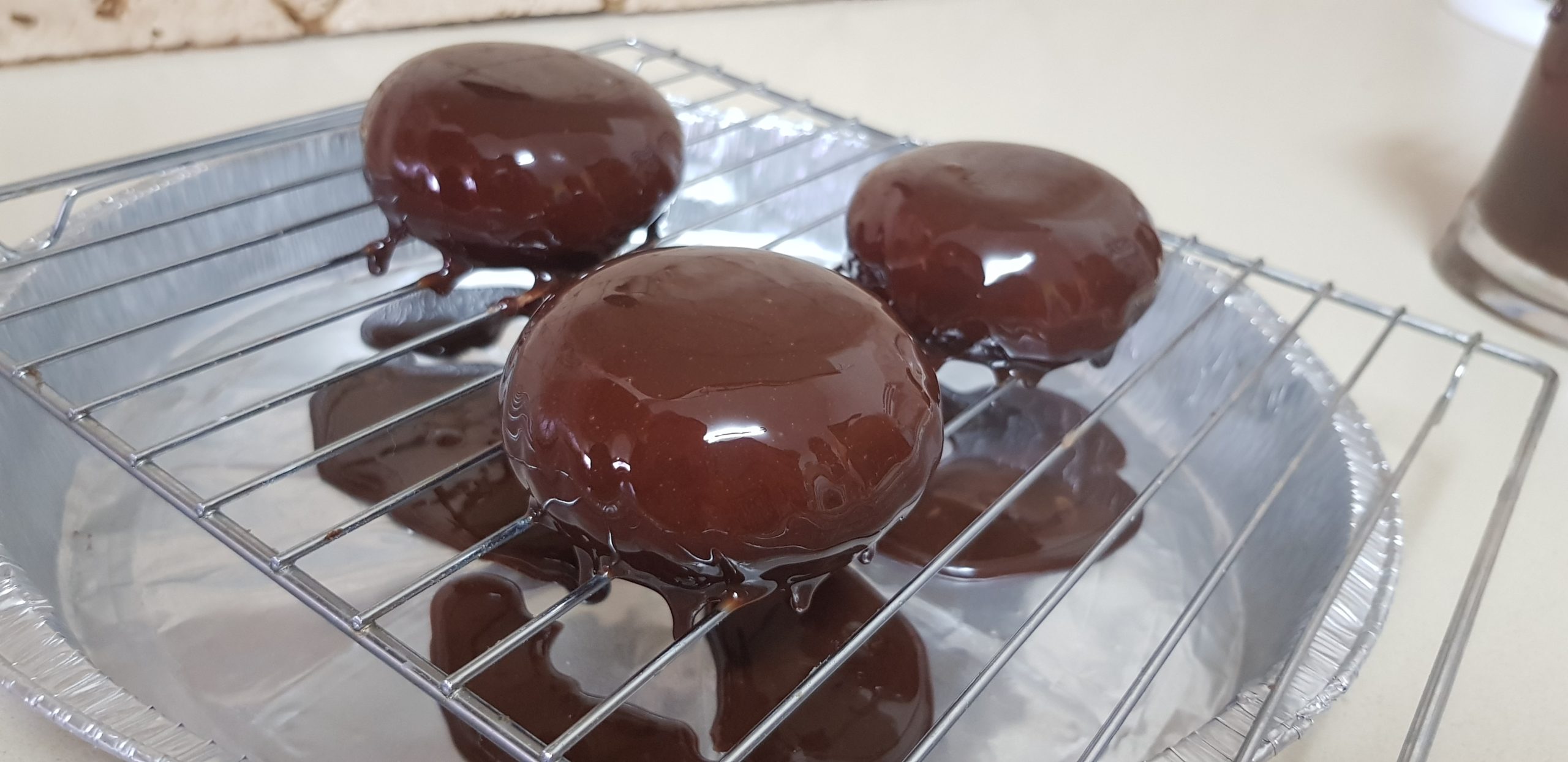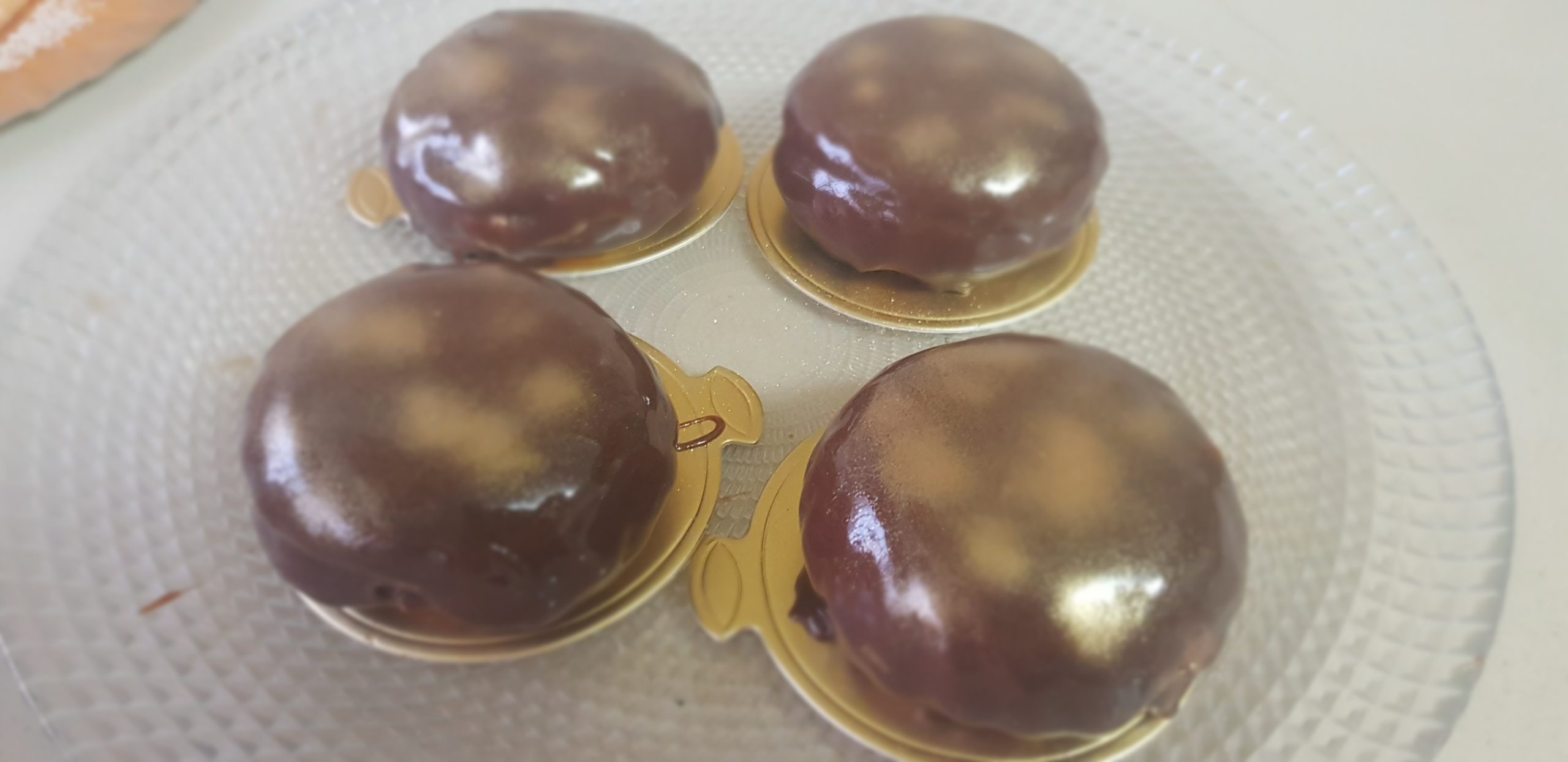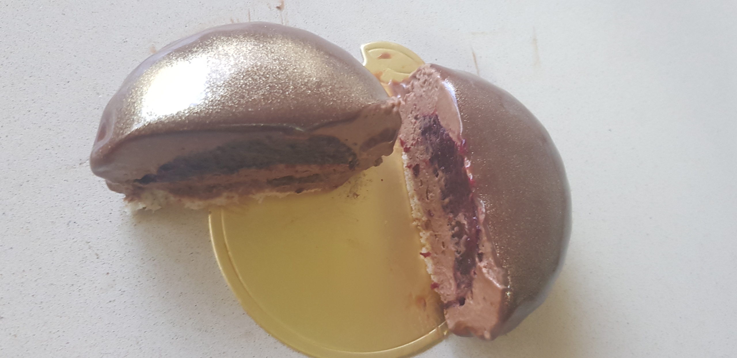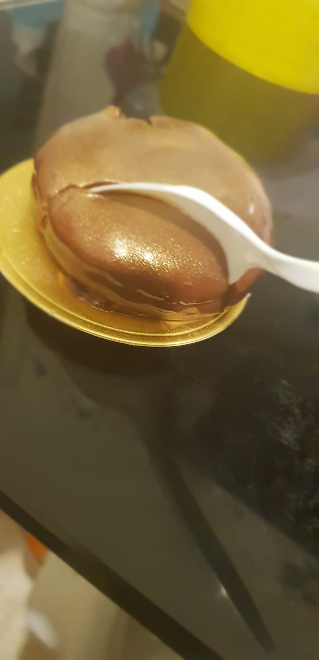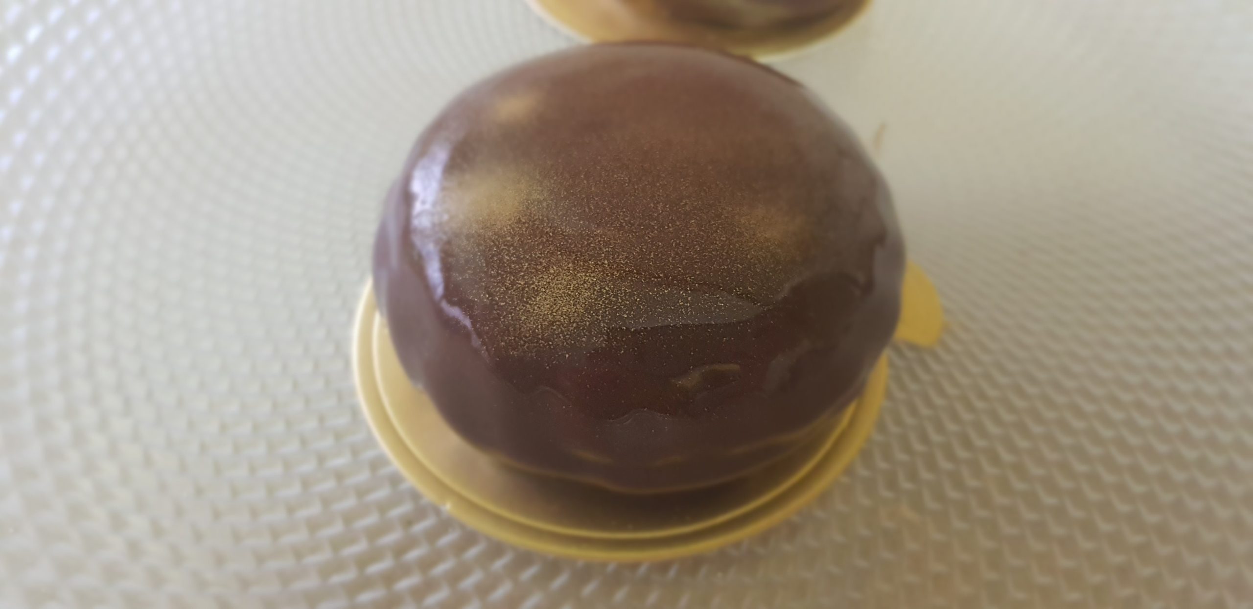 Vérifier la température du glaçage qui doit être à 32°. Le réchauffer si nécessaire. Sortir l‘entremets du congélateur et verser le glaçage dessus en une fine couche. Bien égoutter et déposer le gâteau au centre de la poudre or.