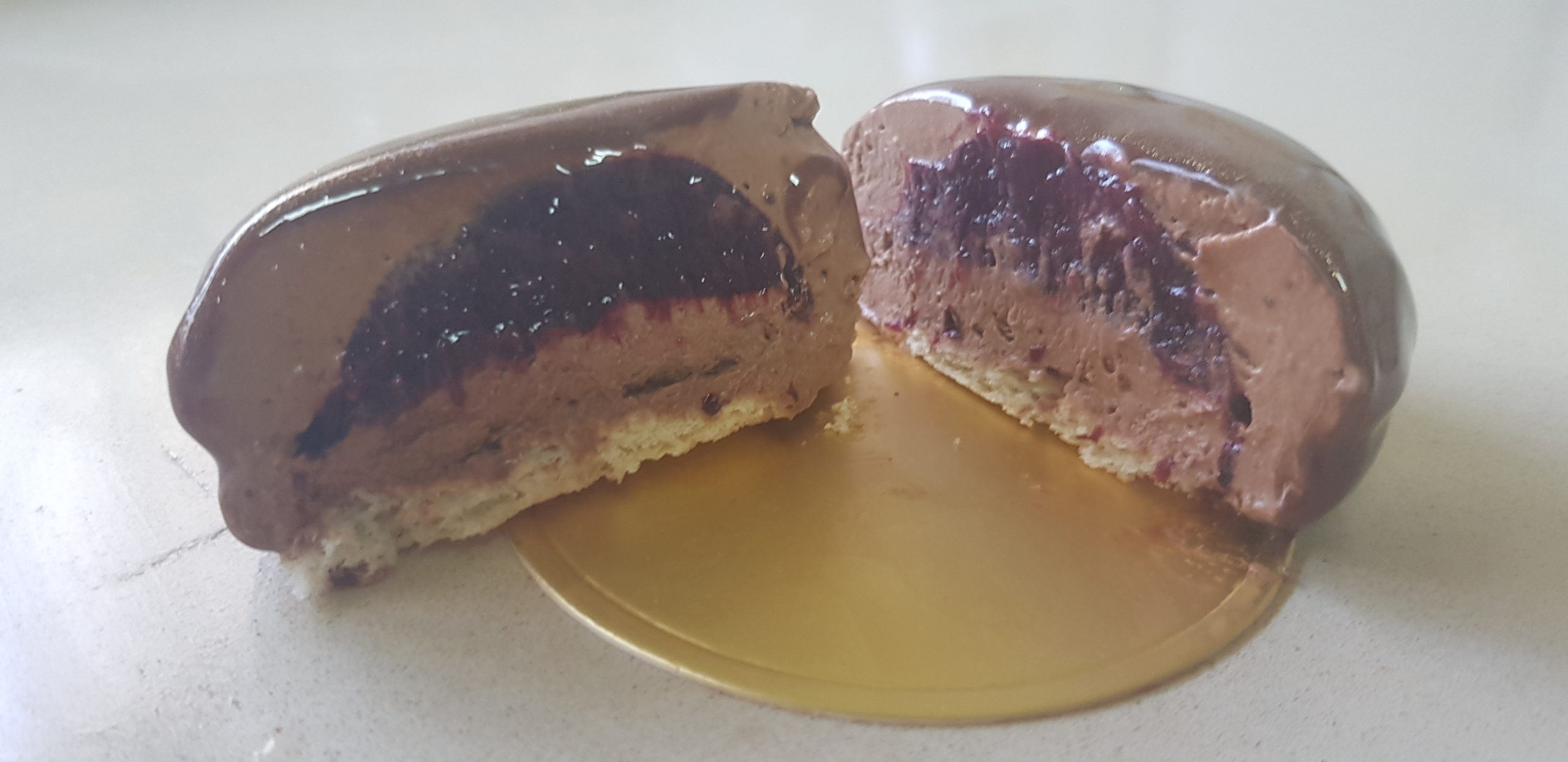 Déposer au fond du moule un peu de mousse, puis l’insert aux fruits et à nouveau la mousse et un cercle de biscuit cuillere et congeler.