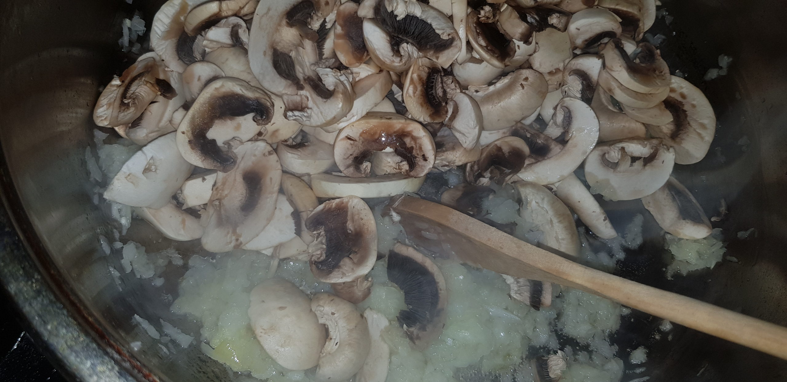 Faire revenir le soignons émincés et le champignons en lamelle.