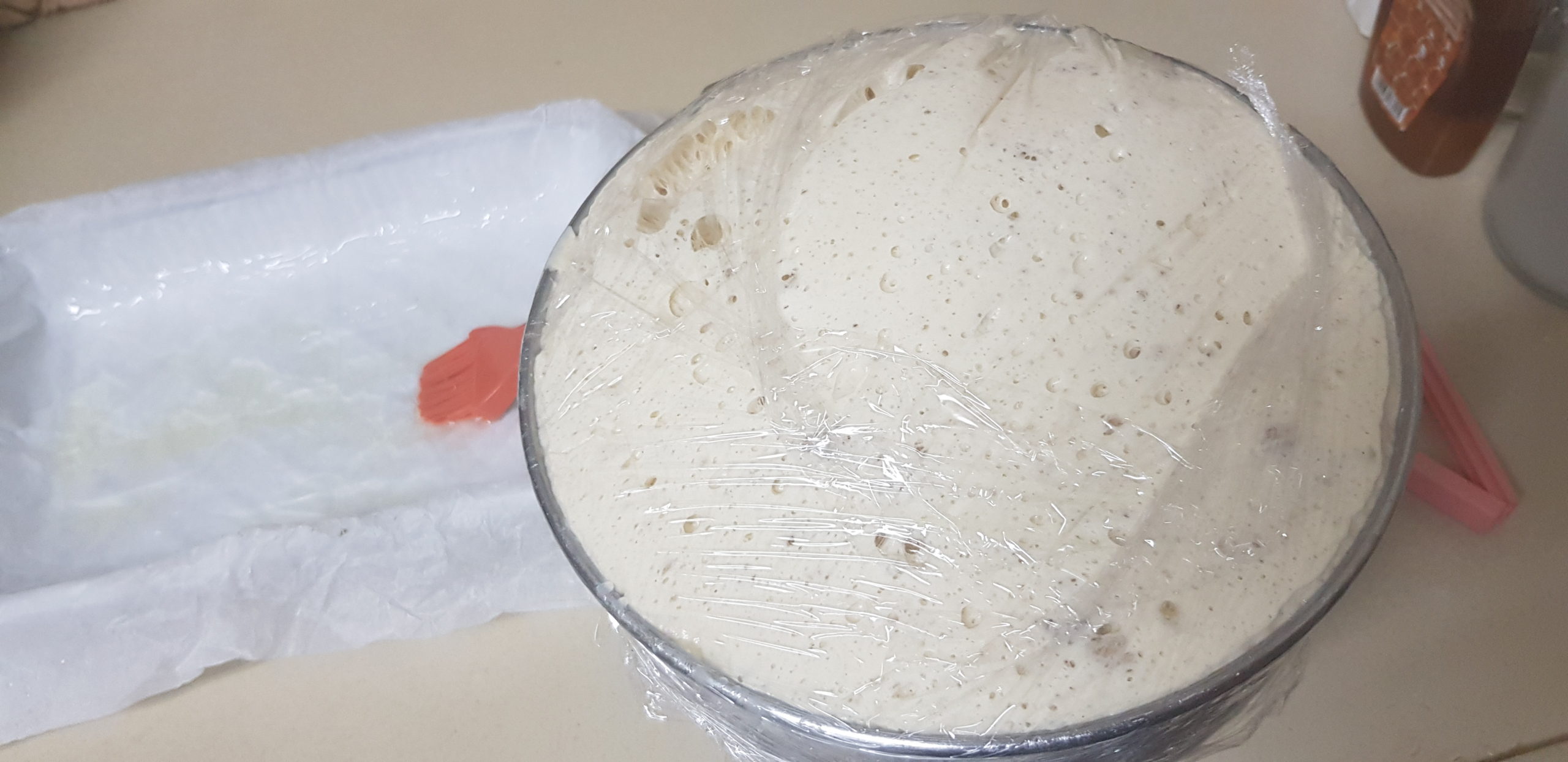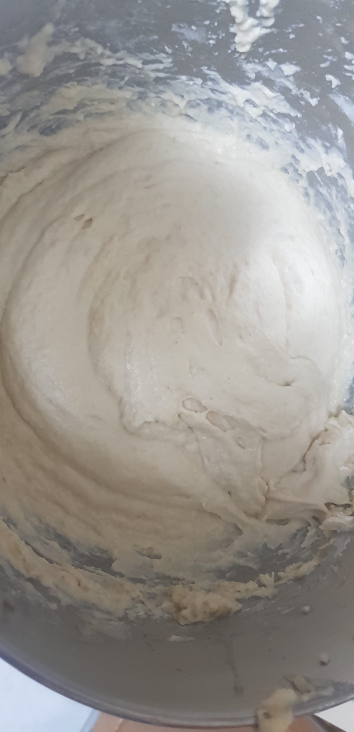 Verser le mélange de levure dans le bol de farine et mélanger avec une spatule, jusqu’à l’obtention d’une pâte souple. Envelopper dans du film alimentaire et laisser lever environ une heure ou jusqu’à ce que la pâte double de volume.