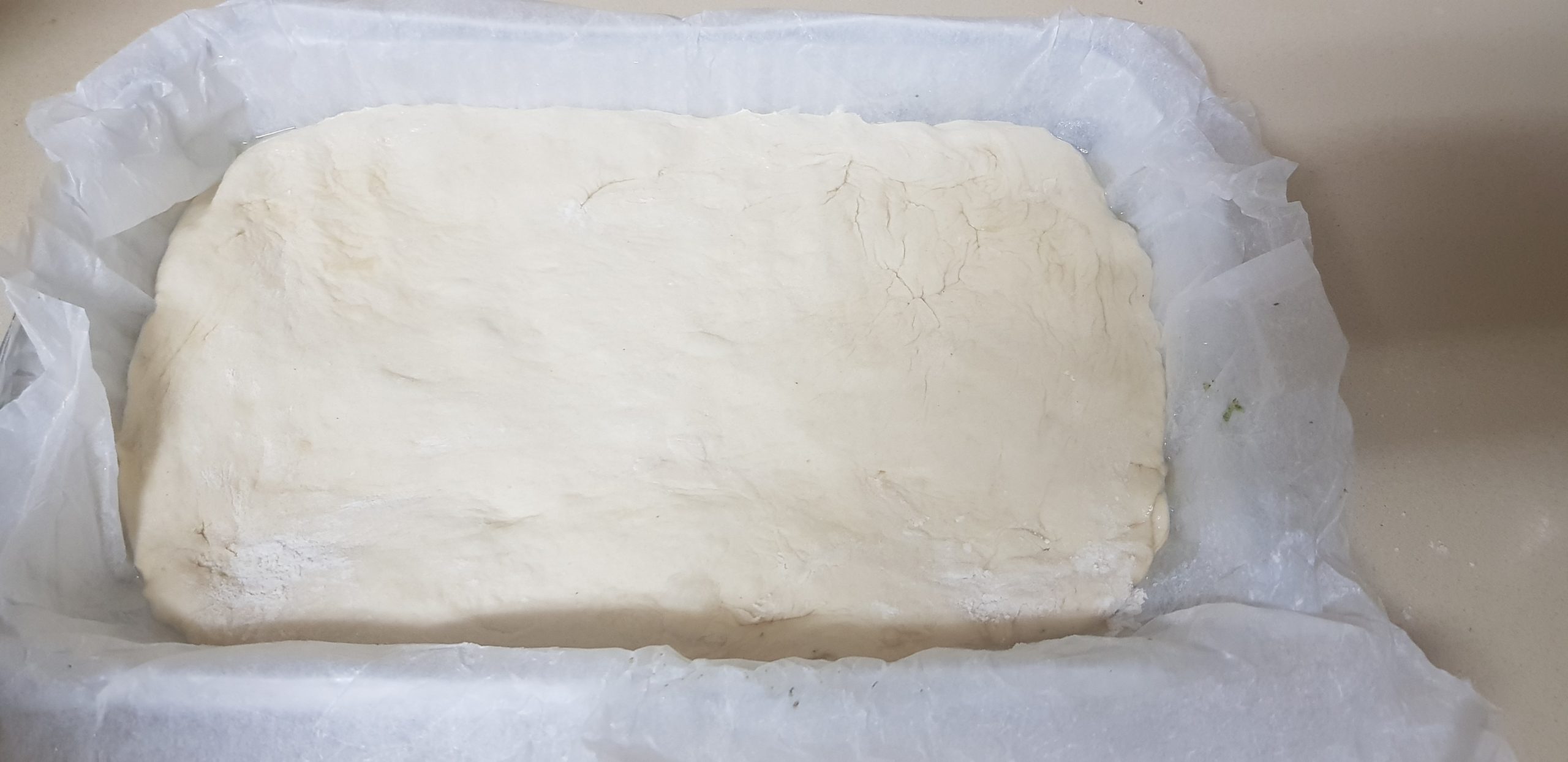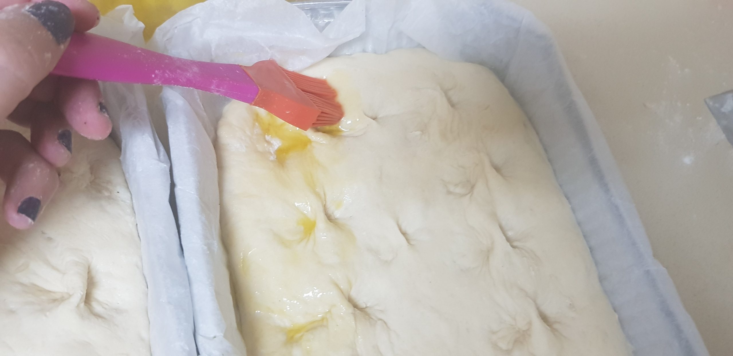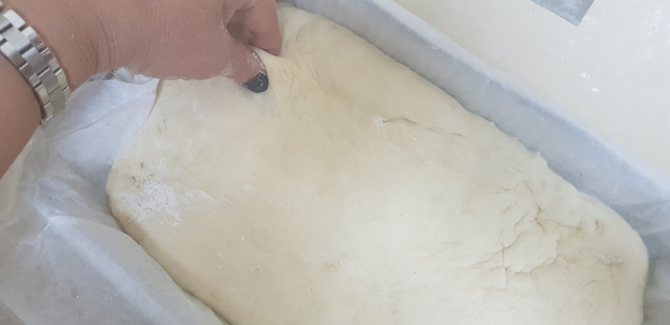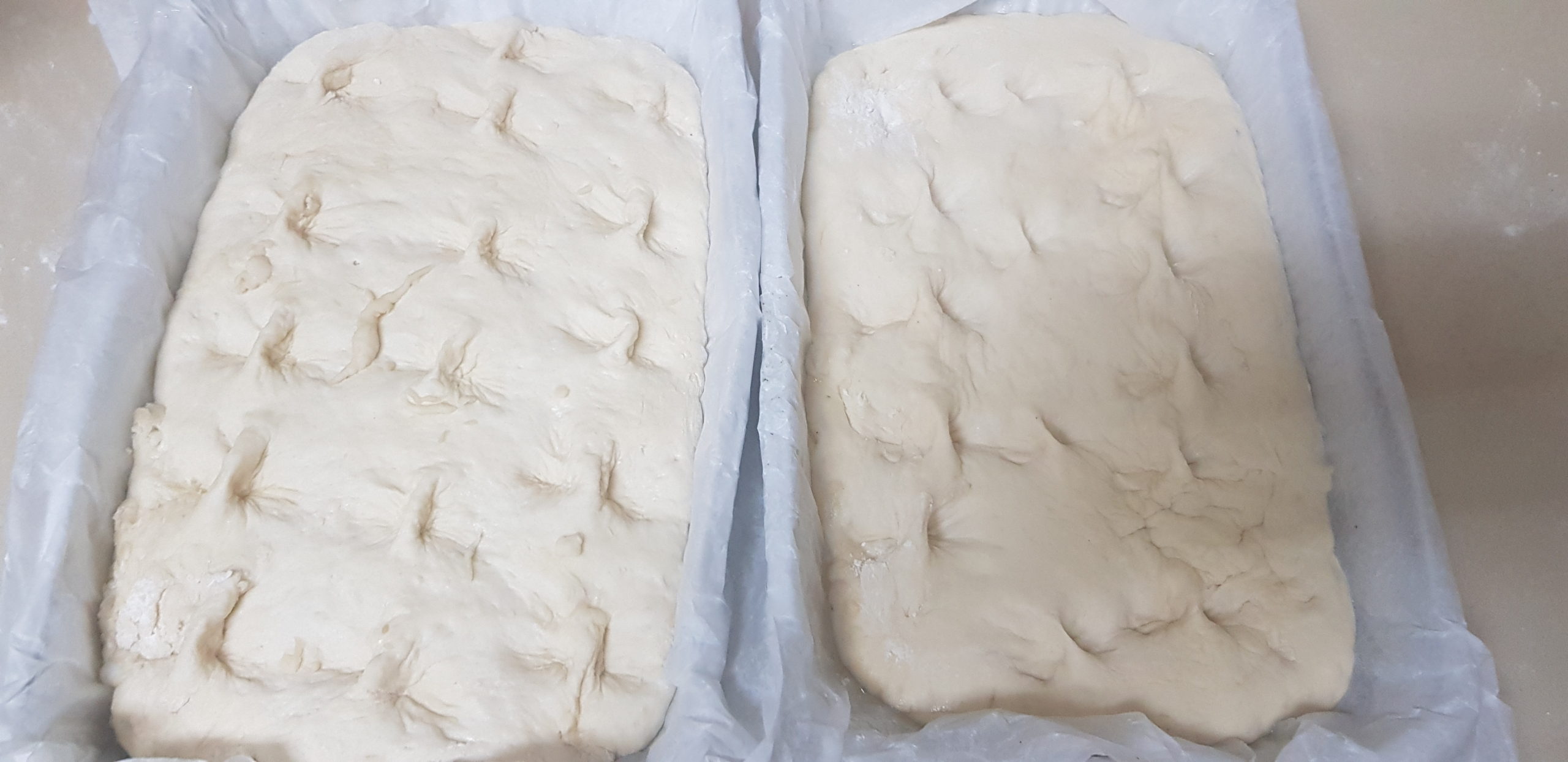 Faire des fossettes sur la surface de la pâte avec vos doigts et badigeonner d’eau salée. Gonflez pendant 10-20 minutes.