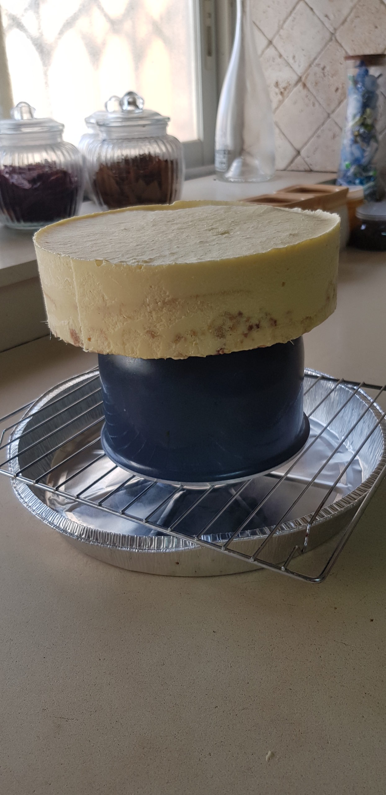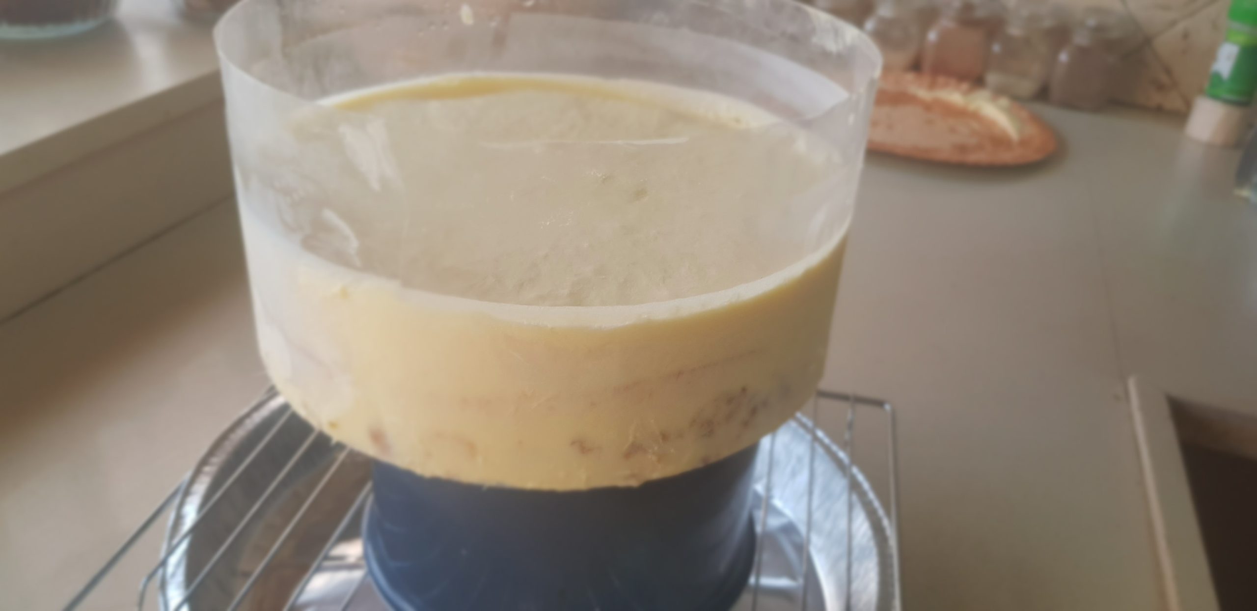 Déposer au fond du cercle le biscuit, couler dessus une partie de la crème pâtissière refroidie, poser ensuite le biscuit avec la compotée, verser dessus le reste de la crème pâtissière . Lisser et congeler. Vérifier la température du glaçage qui doit être à 32°. Le réchauffer si nécessaire. Sortir l‘entremets du congélateur et verser le glaçage dessus en une fine couche. Bien égoutter et déposer le gâteau sur un plateau !
