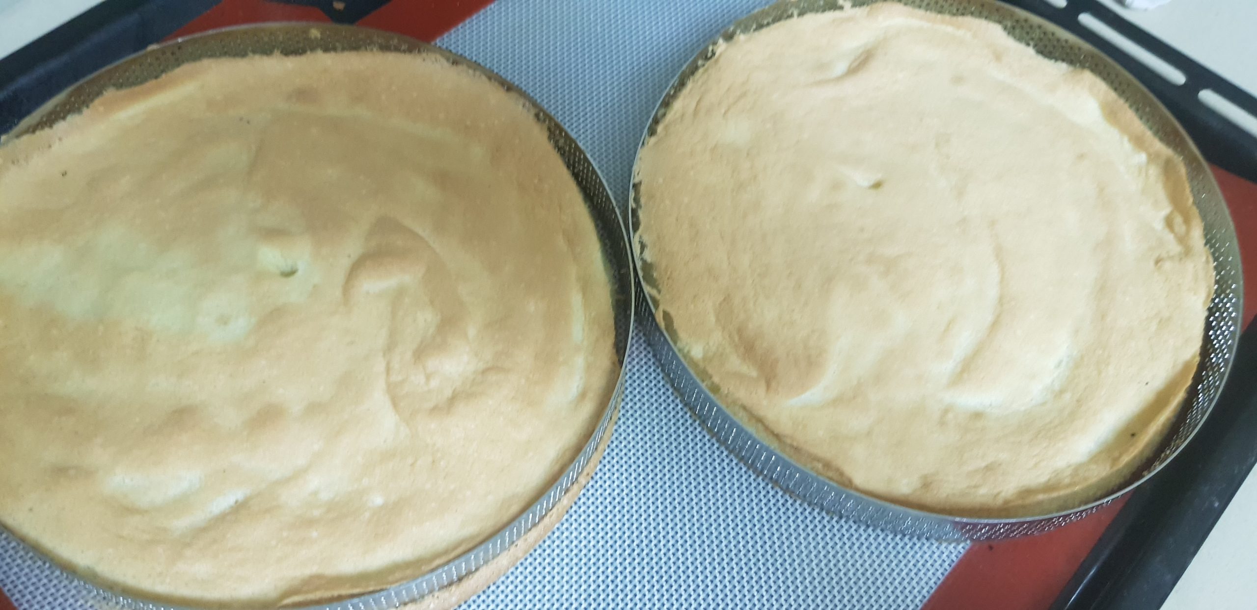 Monter progressivement les blancs en incorporant le sucre petit à petit. Quand ils sont au bec d’oiseau ajouter les jaunes et laisser tourner environ 15 secondes jusqu’à ce qu’ils soient bien incorporés. Ajouter délicatement à la maryse la farine tamisée. Étaler sur un flexipat et cuire à 160° pendant 10min. Détailler 2 biscuits à l’aide de deux cercles à pâtisserie choisi.