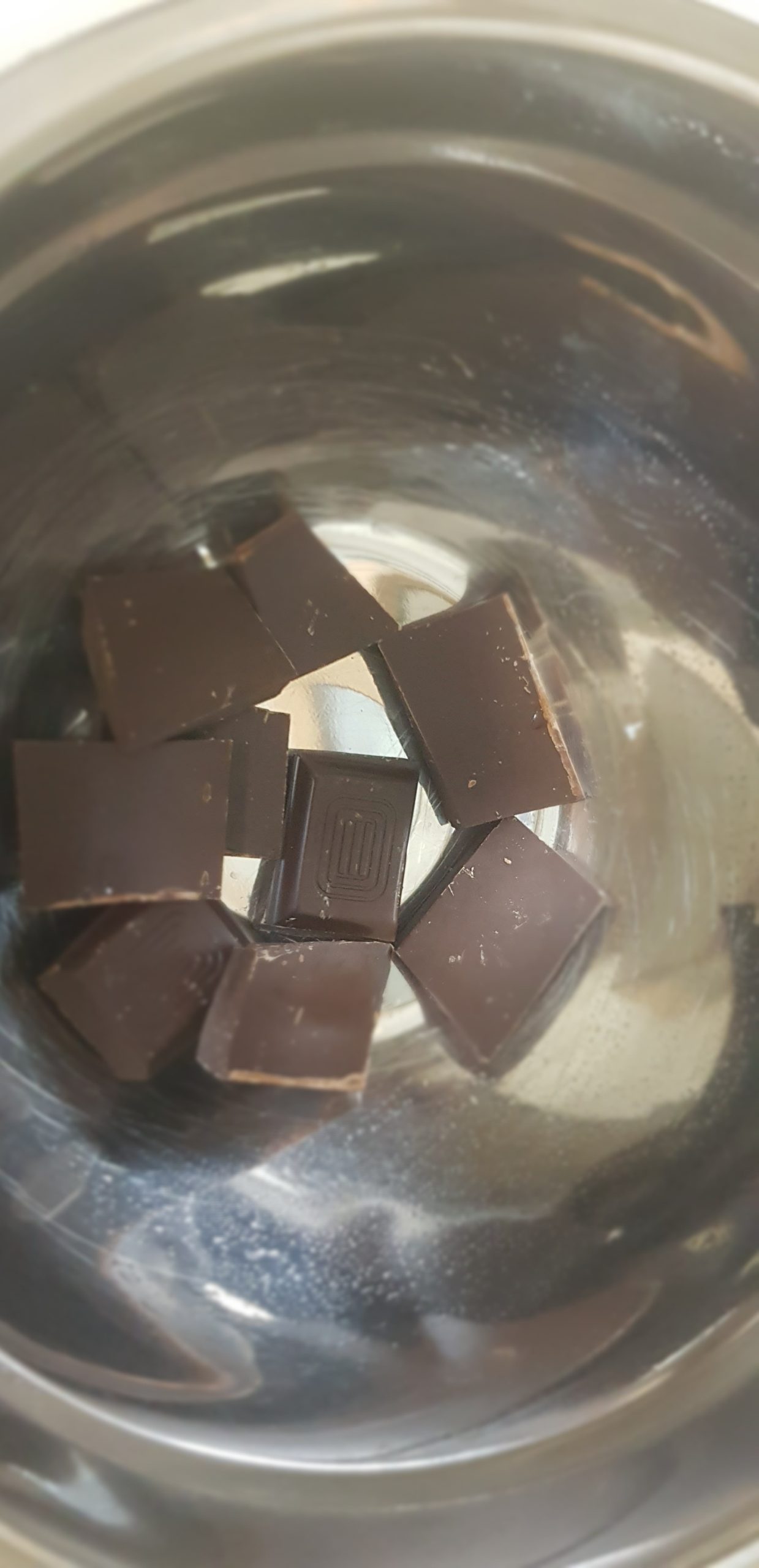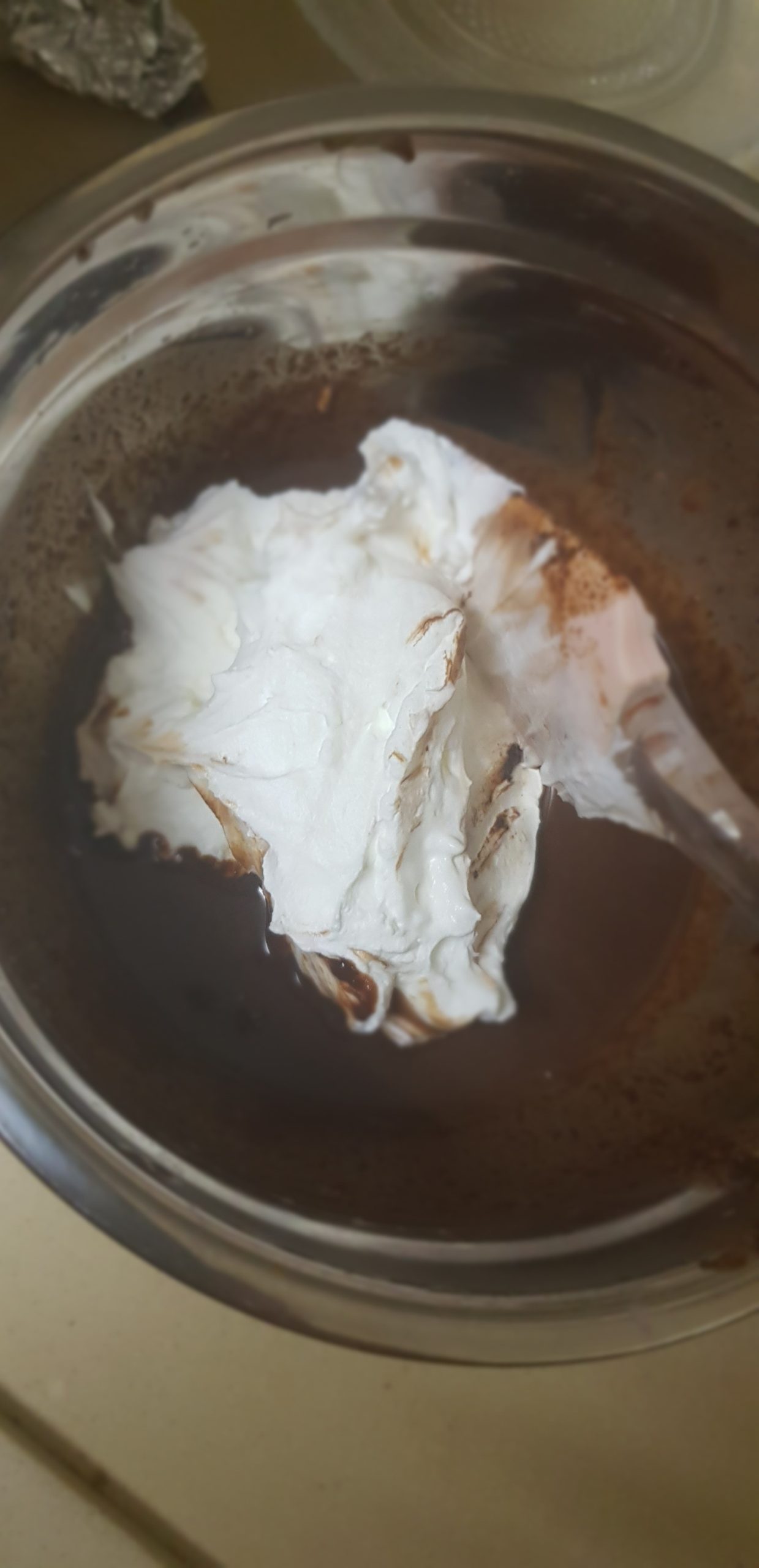 - Tamisez la farine, le cacao et la levure chimique, mélangez avec une spatule et ajouter délicatement à la pate avec une spatule.