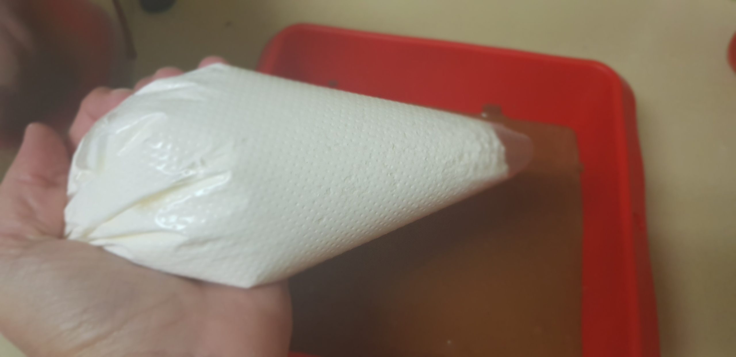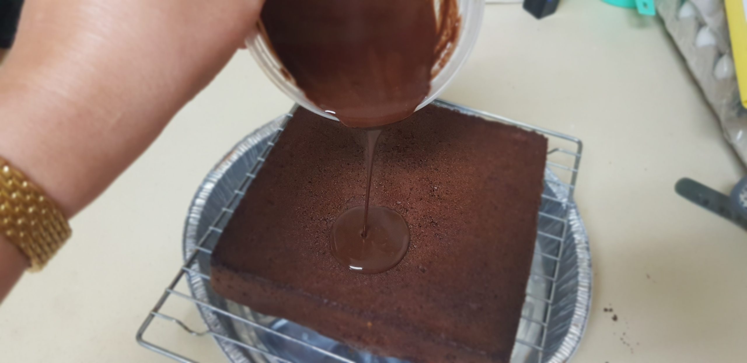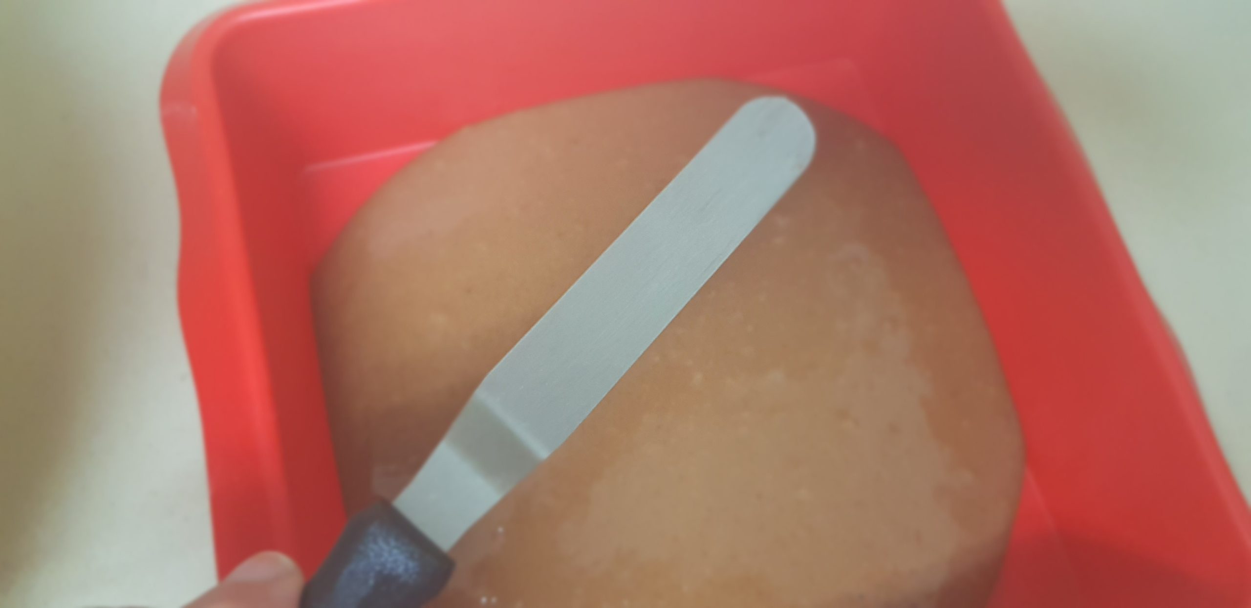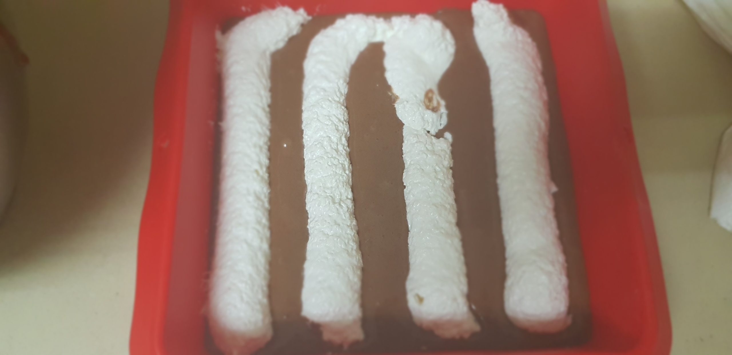 - Versez la moitié du mélange à gâteau dans le plat de cuisson, versez par dessus la garniture à la noix de coco à l’aide d’une douille puis versez le reste du mélange à gâteau.