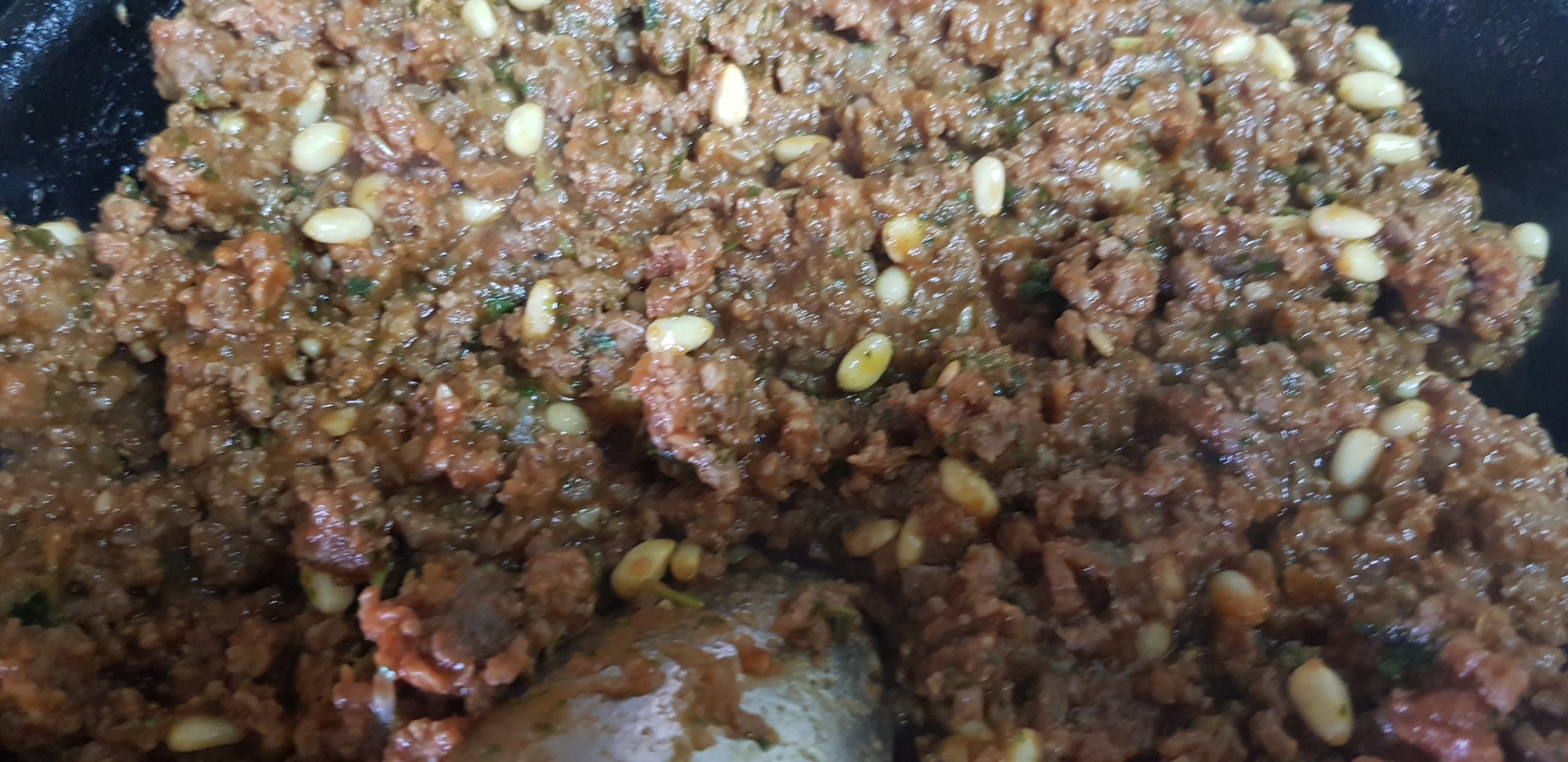3. Dans une grande poêle à feu moyen-vif, faire sauter les oignons pendant 4 à 5 minutes. Ajouter l’ail émincé et faire revenir 2-3 minutes de plus. Ajouter la viande et cuire jusqu’à ce qu’elle commence à dorer. Ajouter les épices et remuer. Verser la sauce tomate et cuire, en remuant de temps en temps, jusqu’à épaississement. Ajouter le persil haché et les pignons de pin. Remuer et éteindre le feu.