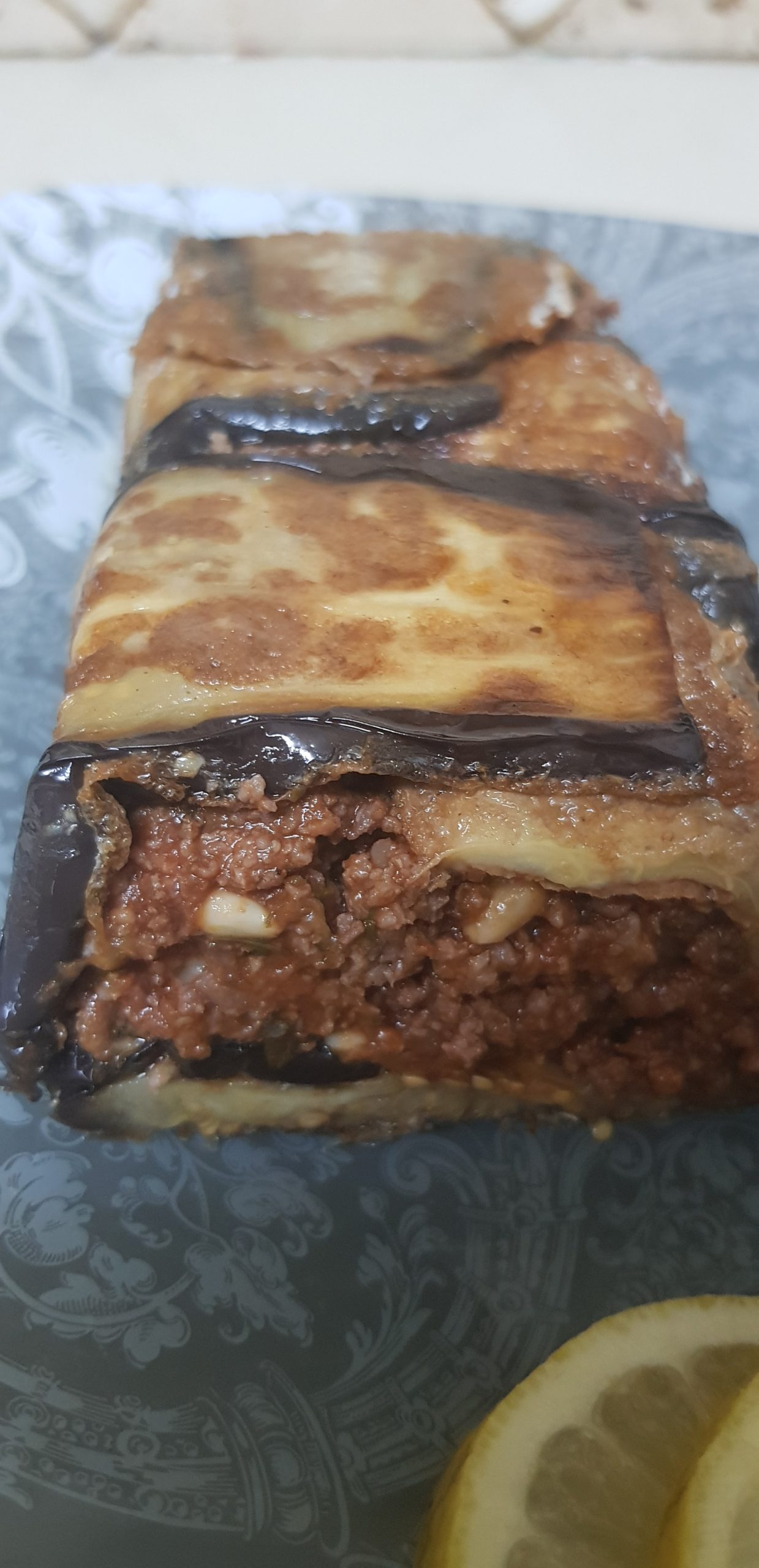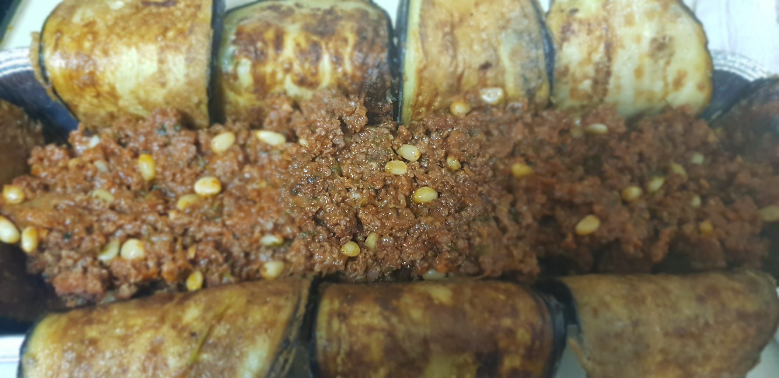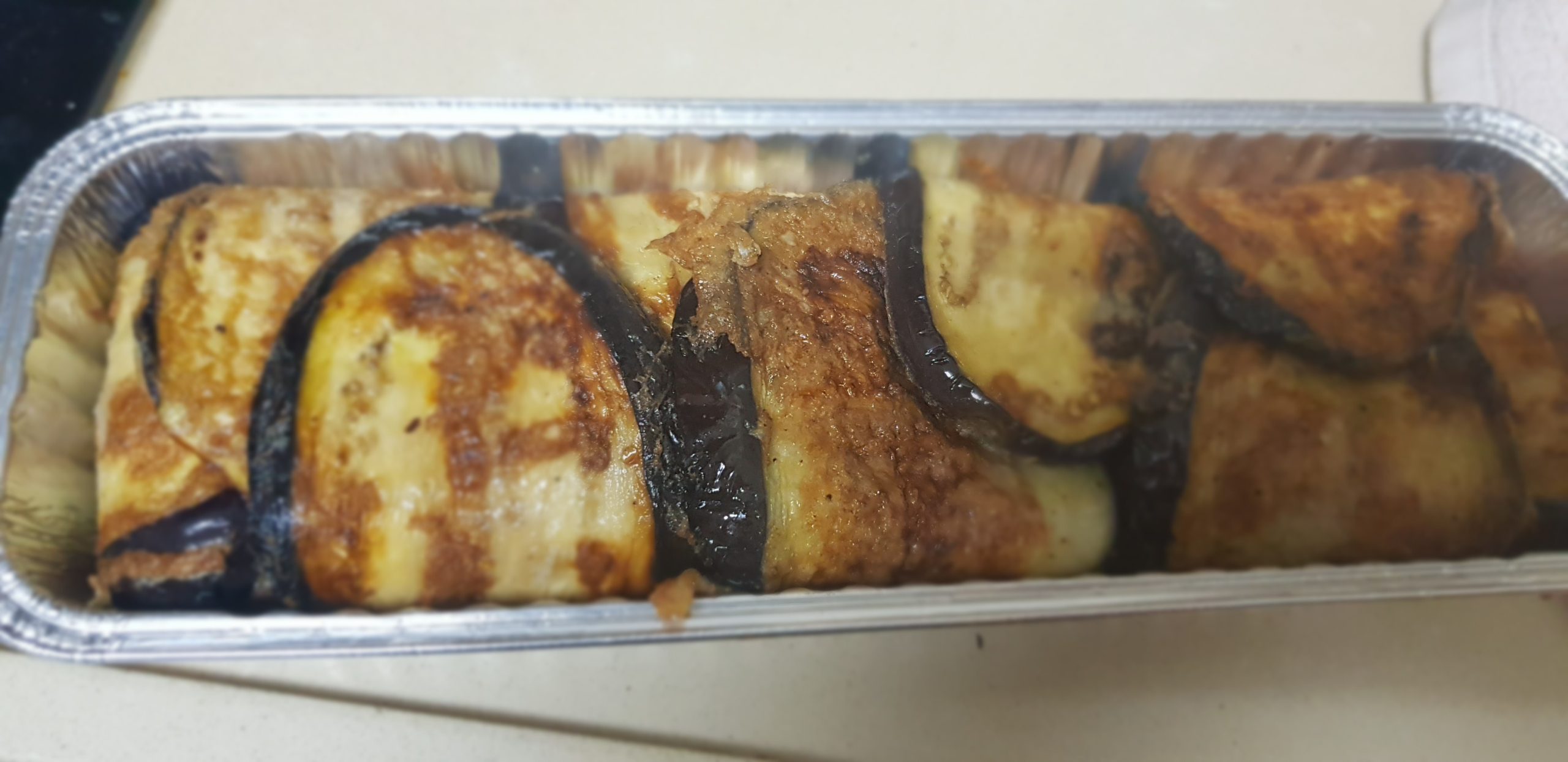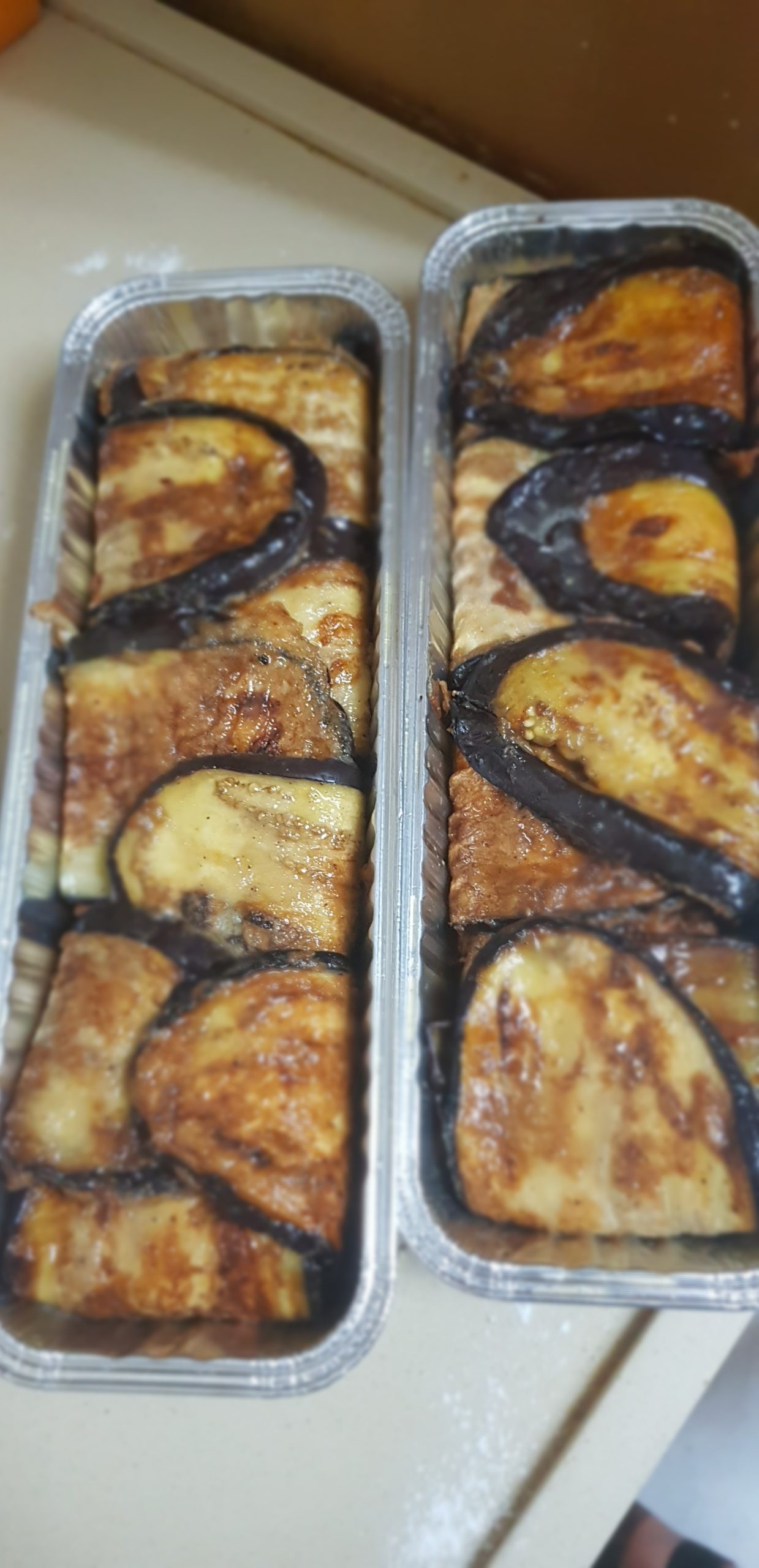 6. Dans 2 plats de cuisson (ou plateaux jetables), assemblez le gâteau. Disposez les aubergines comme indiqué dans les photos. Placez la moitié du mélange de viande dans chacun des plats et fermez avec les aubergines. Badigeonner d’oeuf battu