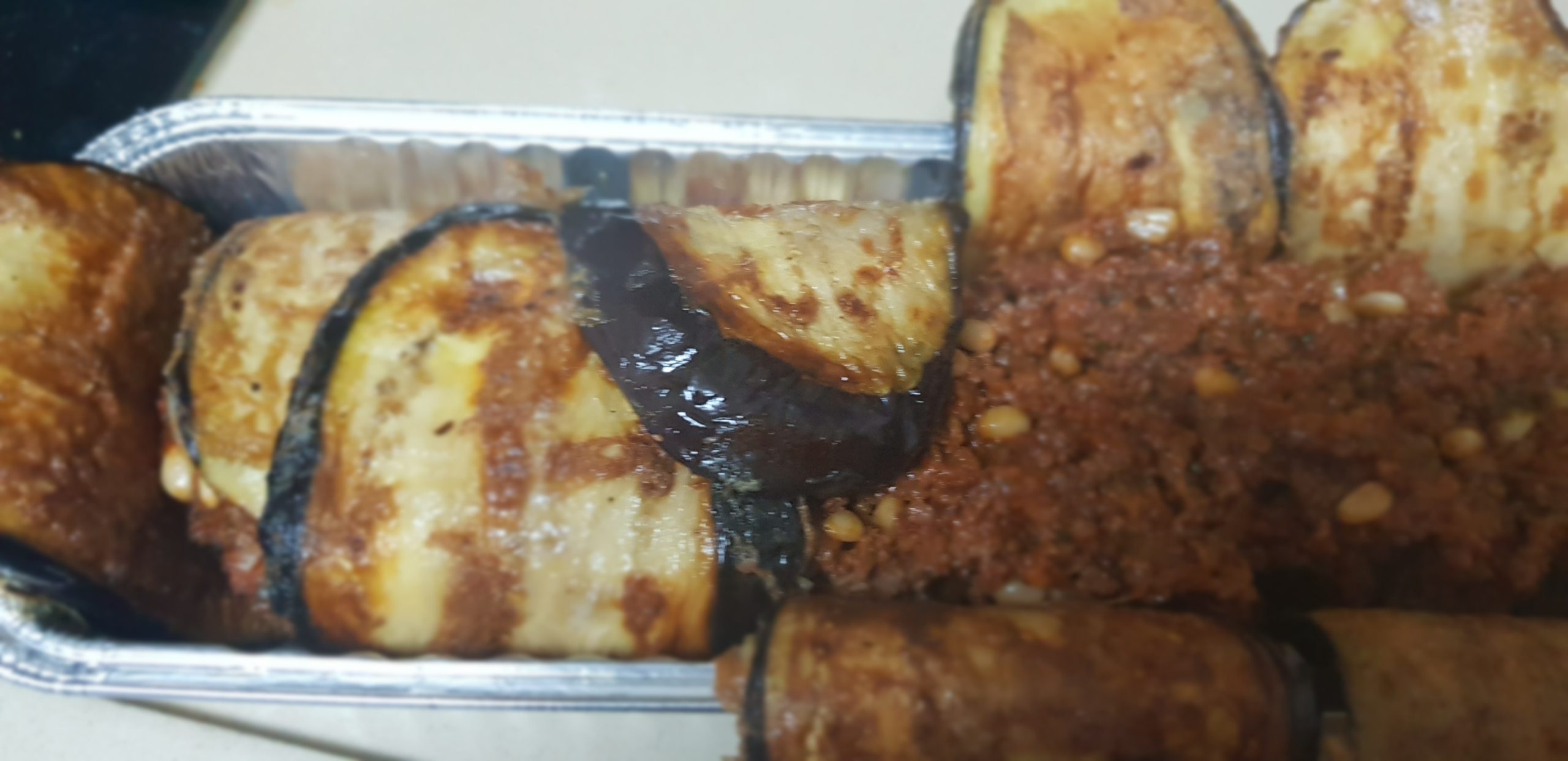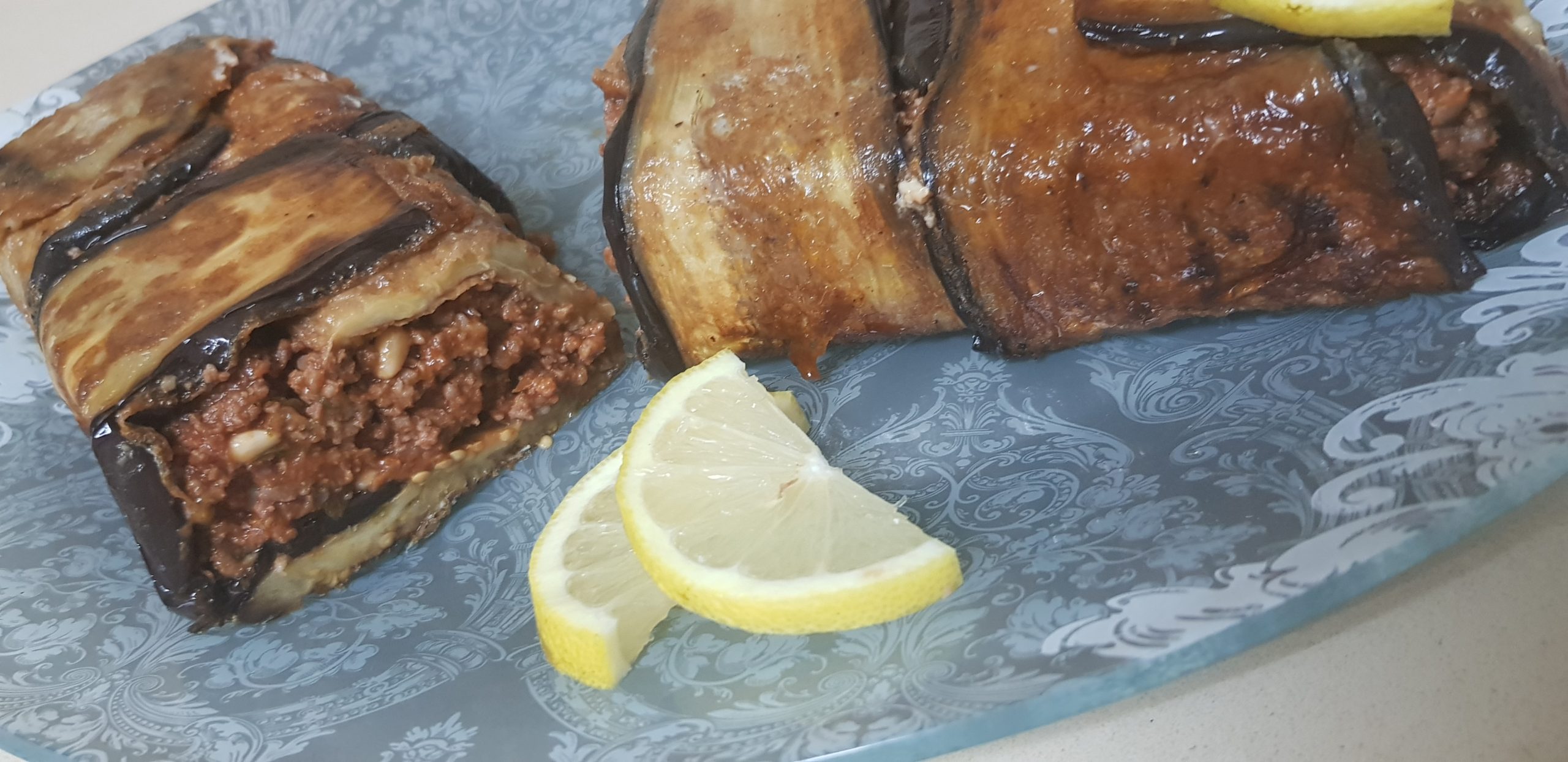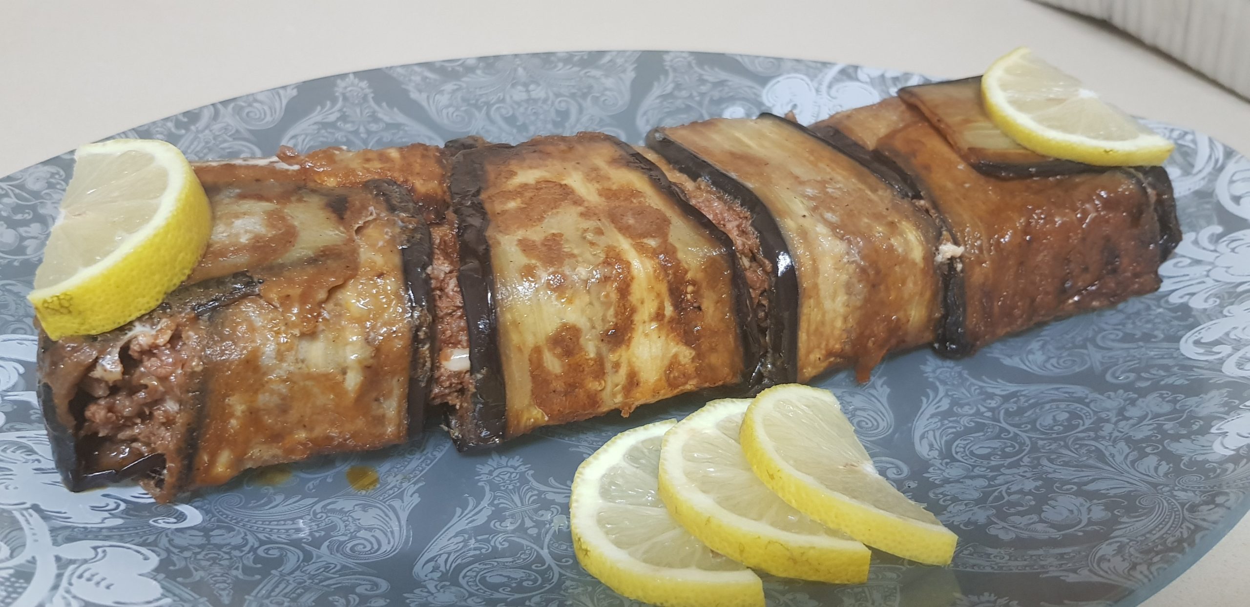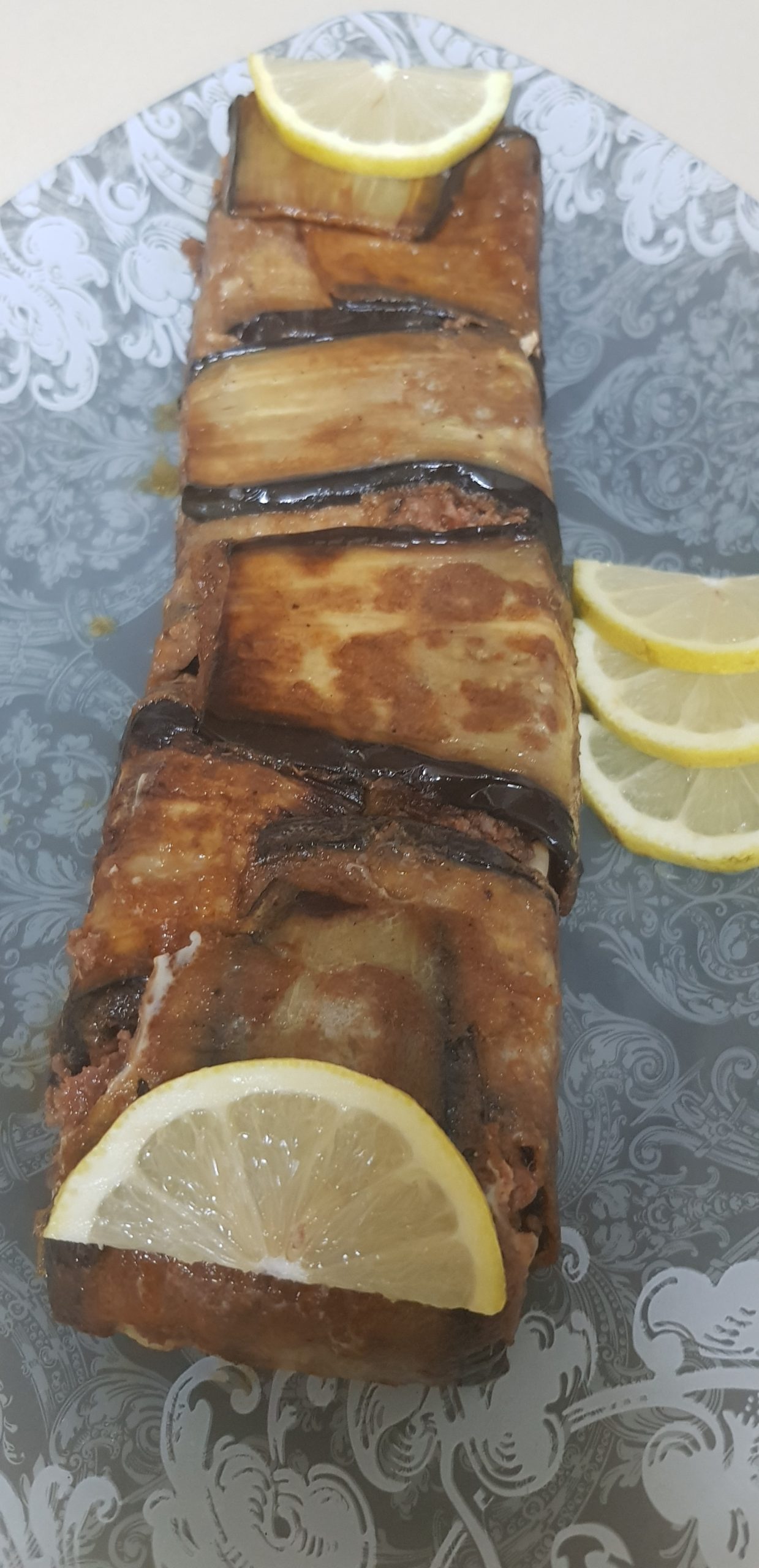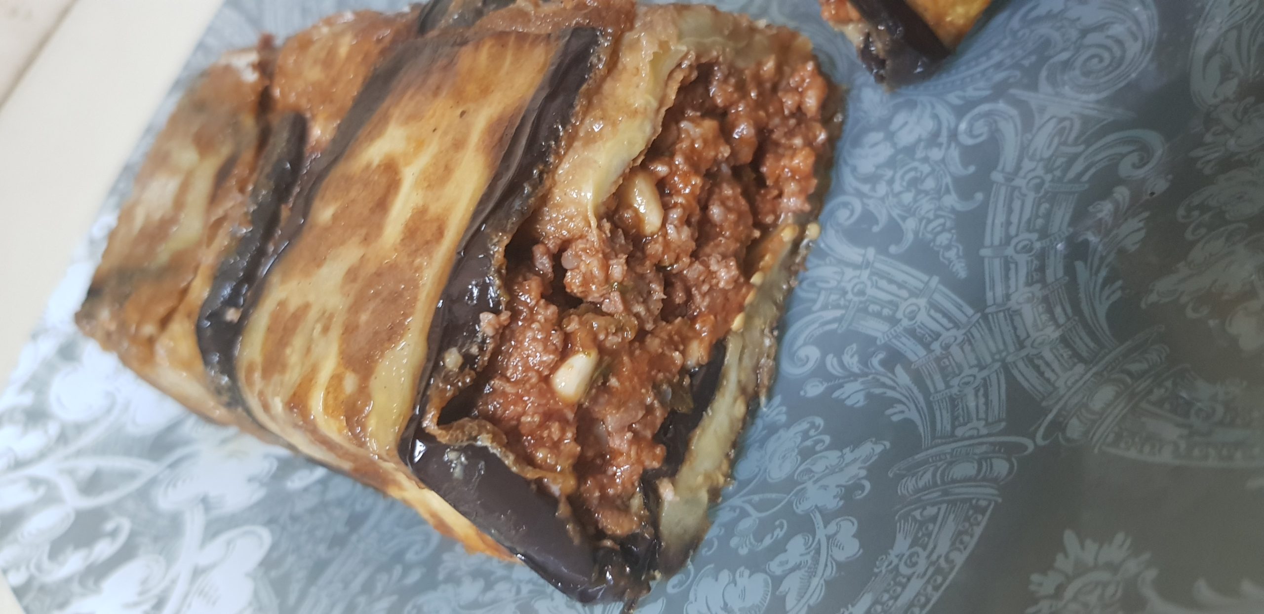 6. Dans 2 plats de cuisson (ou plateaux jetables), assemblez le gâteau. Disposez les aubergines comme indiqué dans les photos. Placez la moitié du mélange de viande dans chacun des plats et fermez avec les aubergines. Badigeonner d’oeuf battu