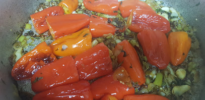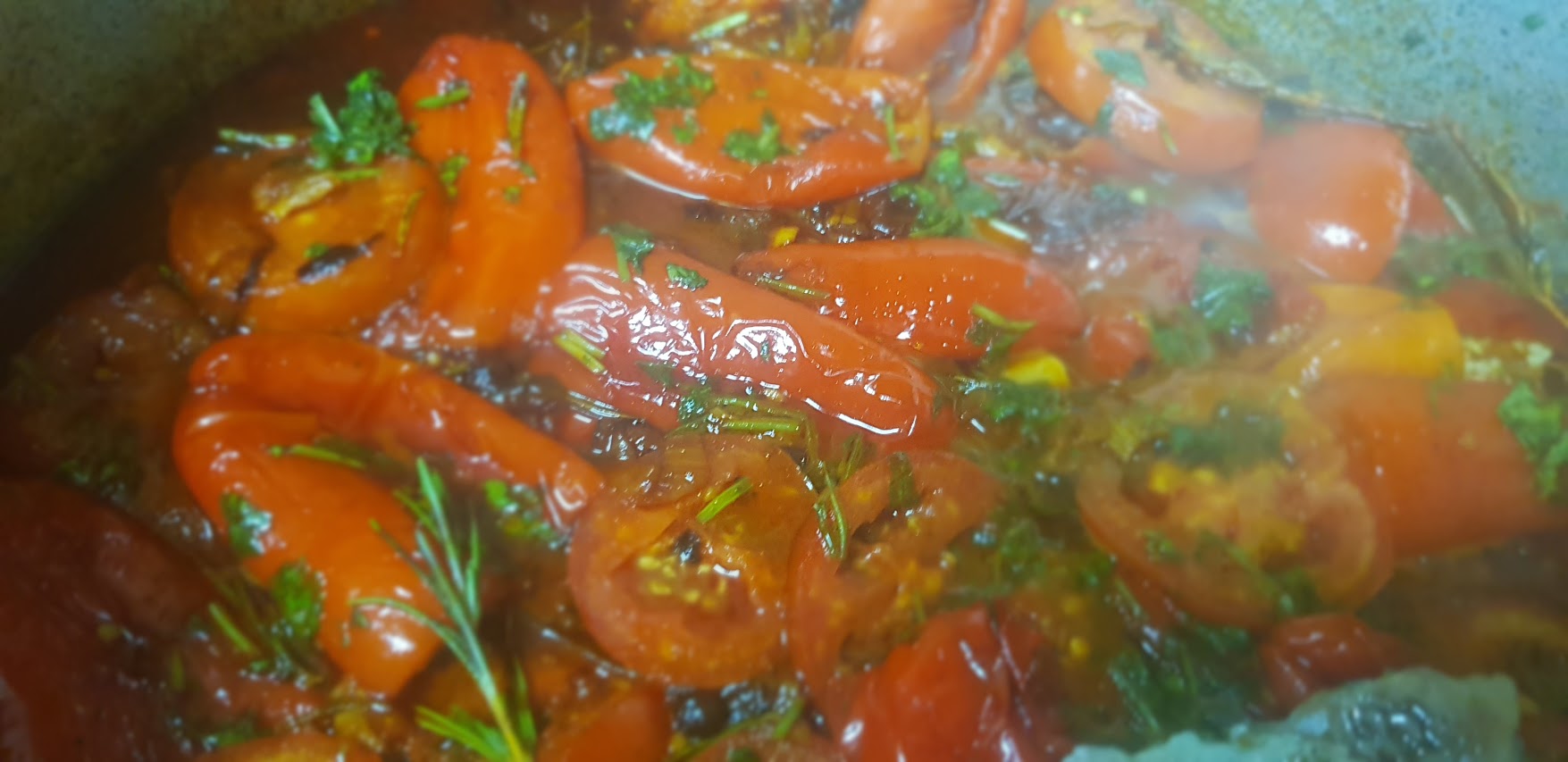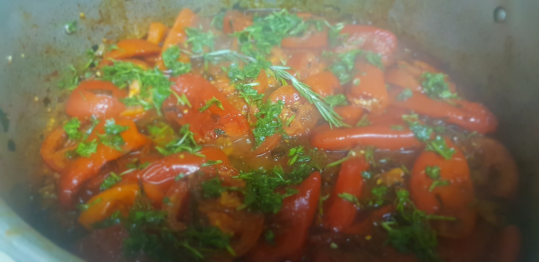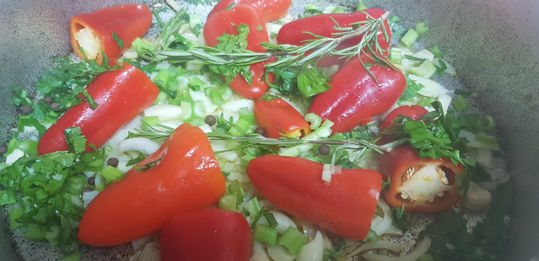 Faites revenir avec quatre cuillères à soupe d’huile d’olive les oignons avec les poivrons, l’ail, les branches de céleri y compris les feuilles, ajoutez le gros sel, le poivre noir moulu, la tige de romarin, couvrez la casserole et remuez de temps en temps, ajouter des tomates en rondelle et un cuillère à café de sucre, et laisser cuire jusqu’à ce que les légumes ramollissent (pas trop non plus!). Enfin, ajouter une cuillère à soupe de paprika doux et continuer à faire frire sur le feu doux pendant une minute.