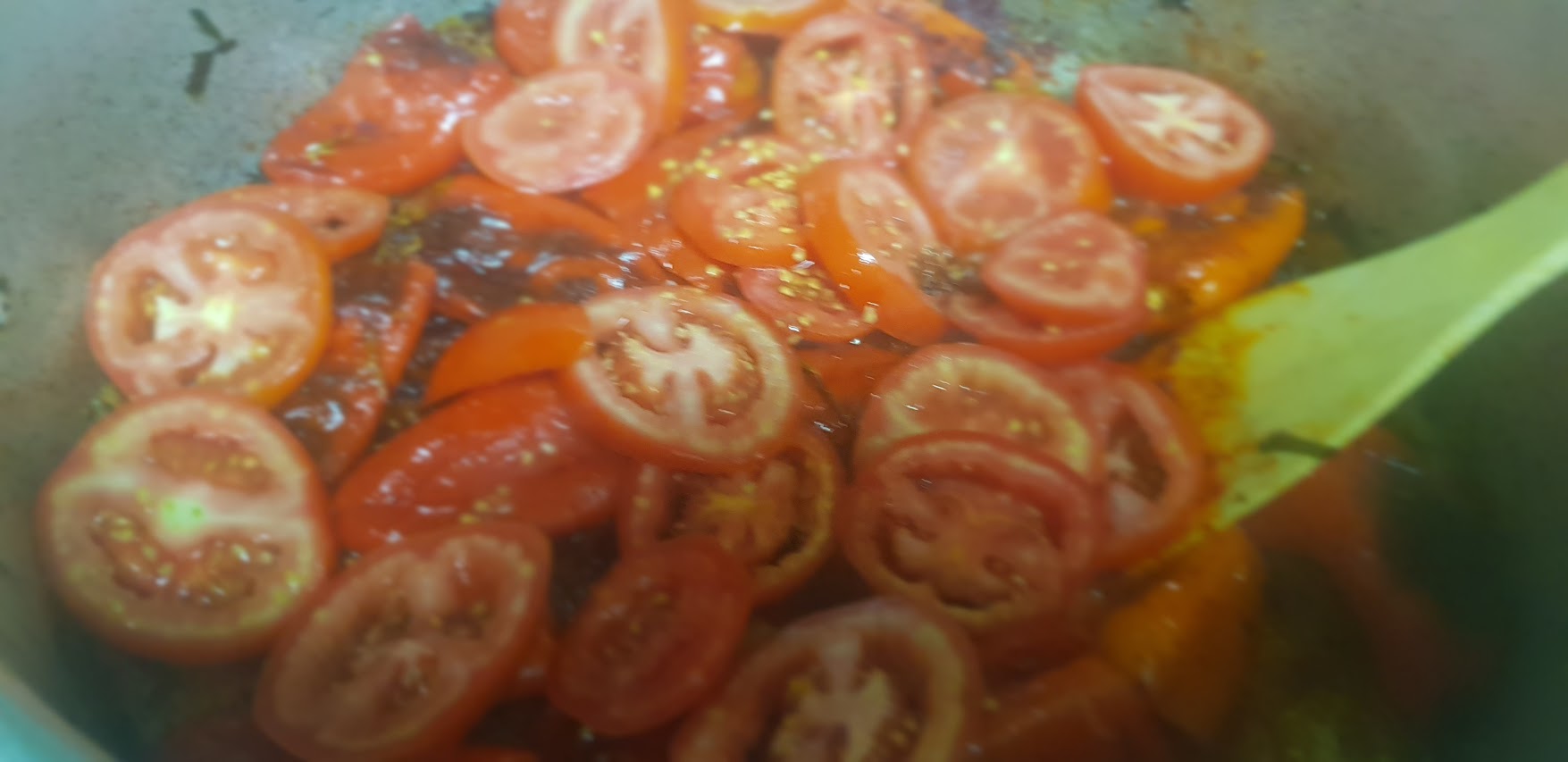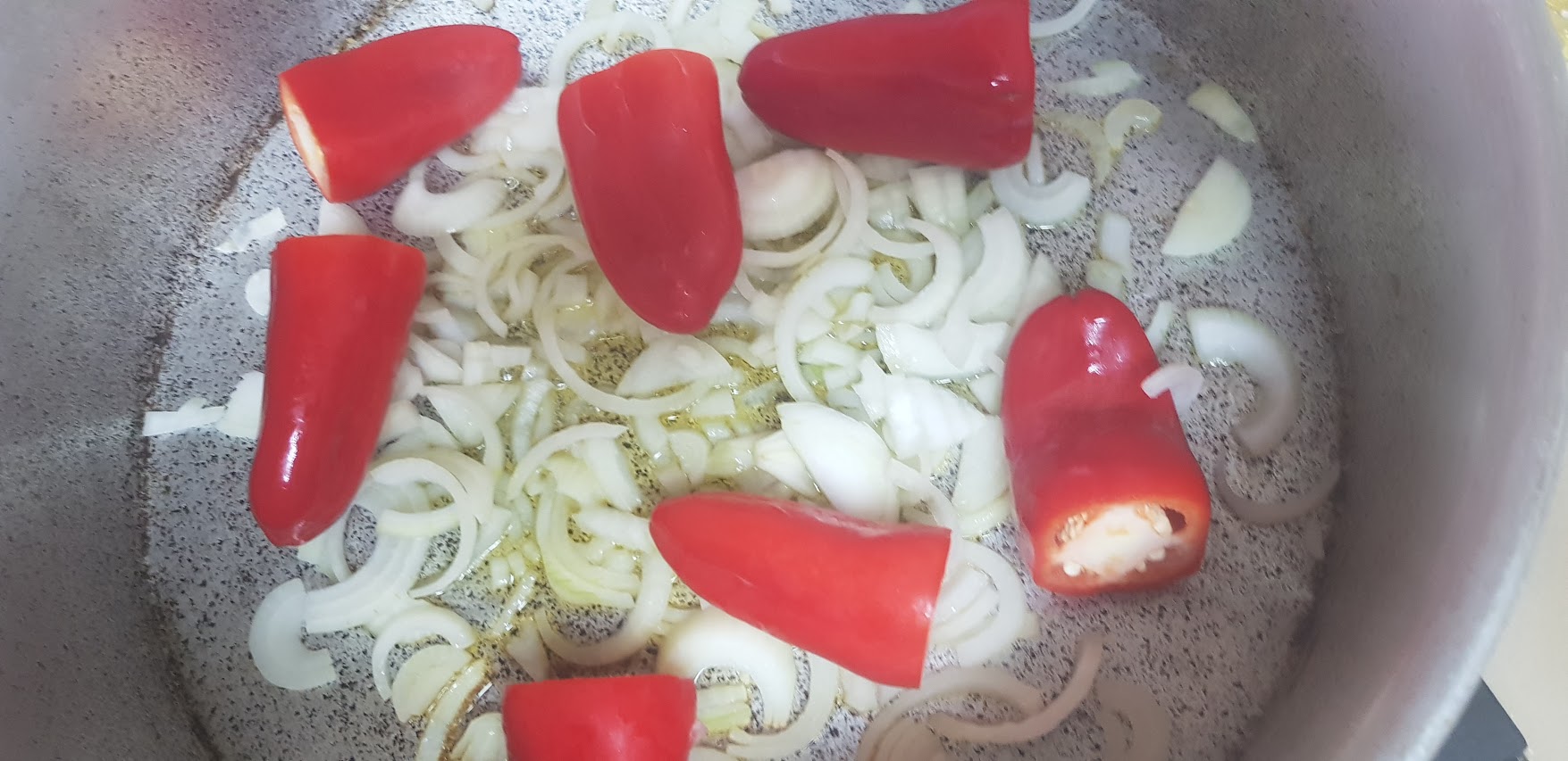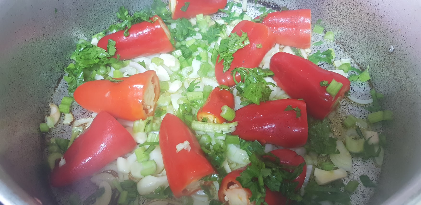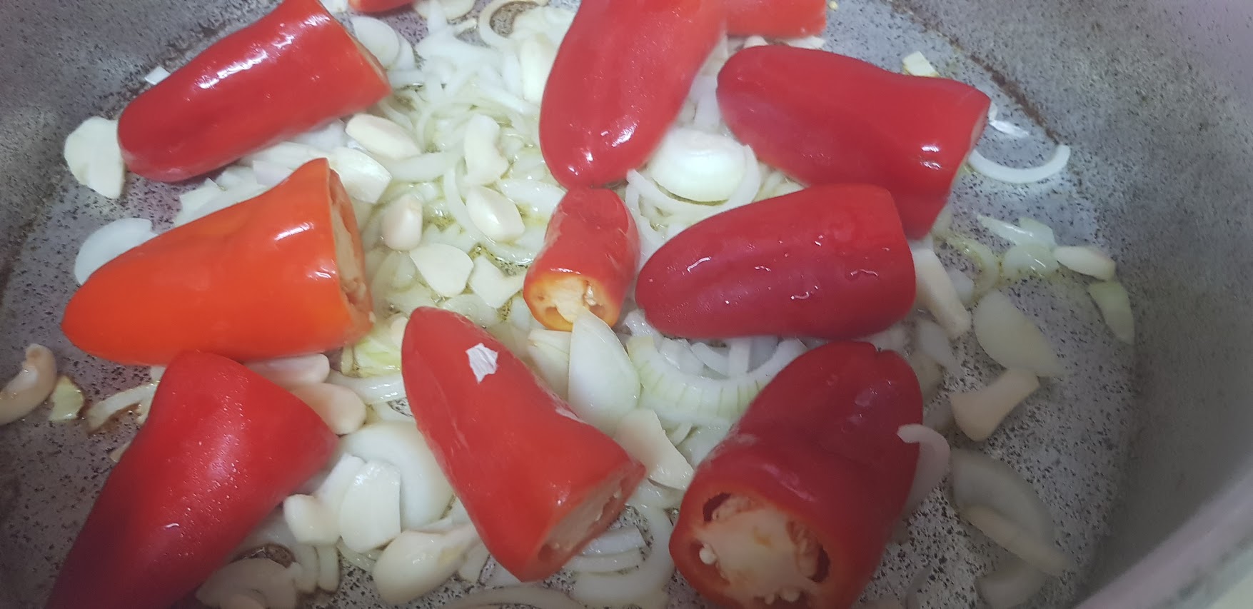 Faites revenir avec quatre cuillères à soupe d’huile d’olive les oignons avec les poivrons, l’ail, les branches de céleri y compris les feuilles, ajoutez le gros sel, le poivre noir moulu, la tige de romarin, couvrez la casserole et remuez de temps en temps, ajouter des tomates en rondelle et un cuillère à café de sucre, et laisser cuire jusqu’à ce que les légumes ramollissent (pas trop non plus!). Enfin, ajouter une cuillère à soupe de paprika doux et continuer à faire frire sur le feu doux pendant une minute.
