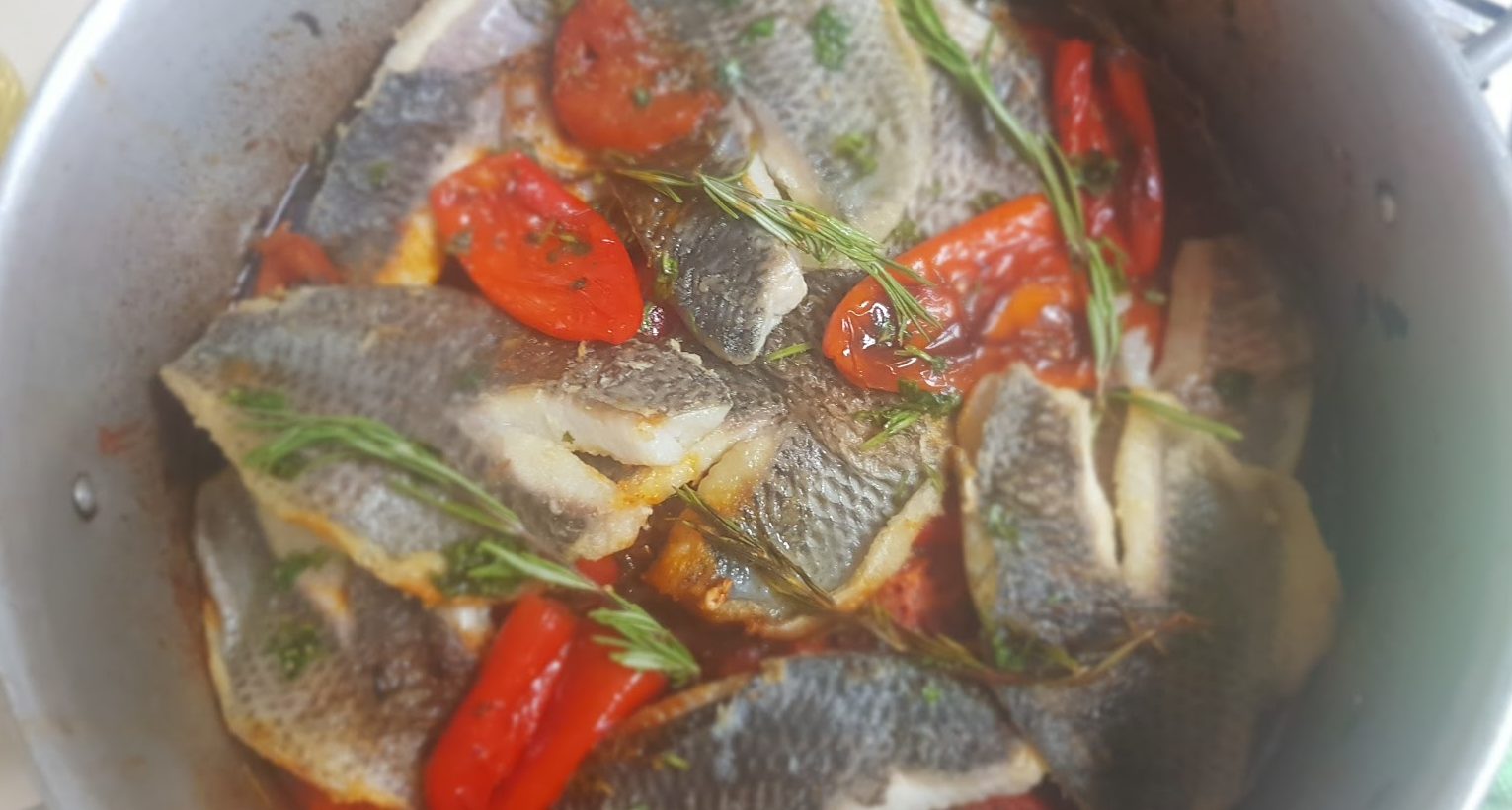 Prenez une casserole ajoutez un peu d’huile d’olive et placez le poisson fariné, avec la peau au fond de la casserole couvrez la casserole et saupoudrez sur le poisson du gros sel, et de poivre noir moulu et faites frire de chaque côté pendant 10 minutes.