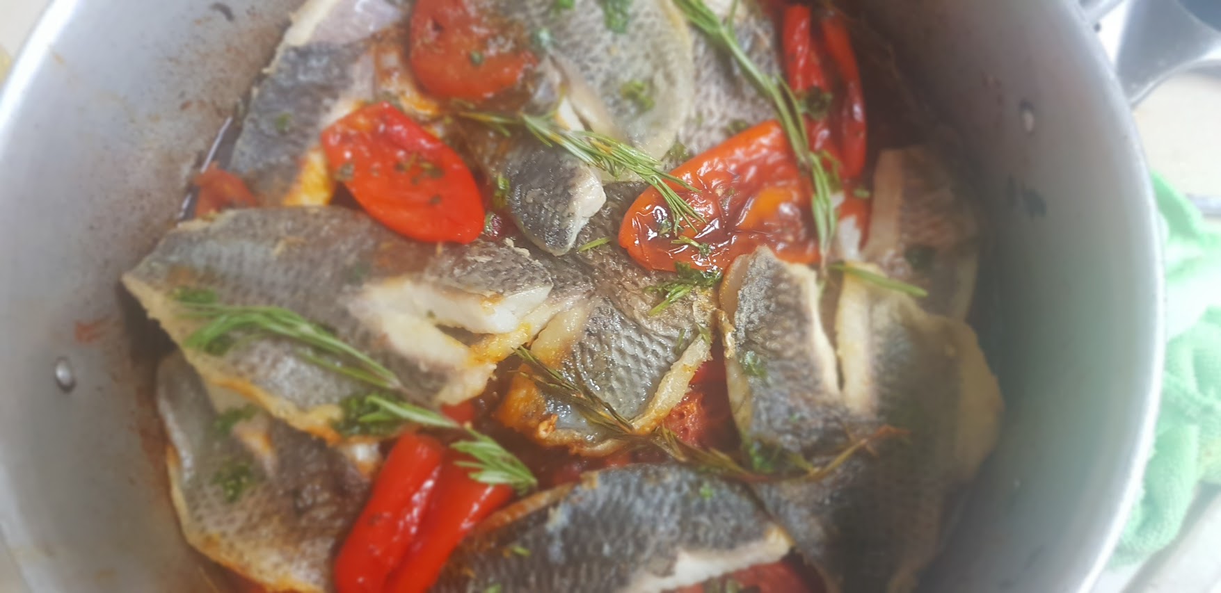 Au bout de 20 minutes, transférez le poisson et placez-le sur les poivrons à feu vif et avec le couvercle fermé, continuez à faire frire pendant encore 2 minutes, en coupant le gaz.