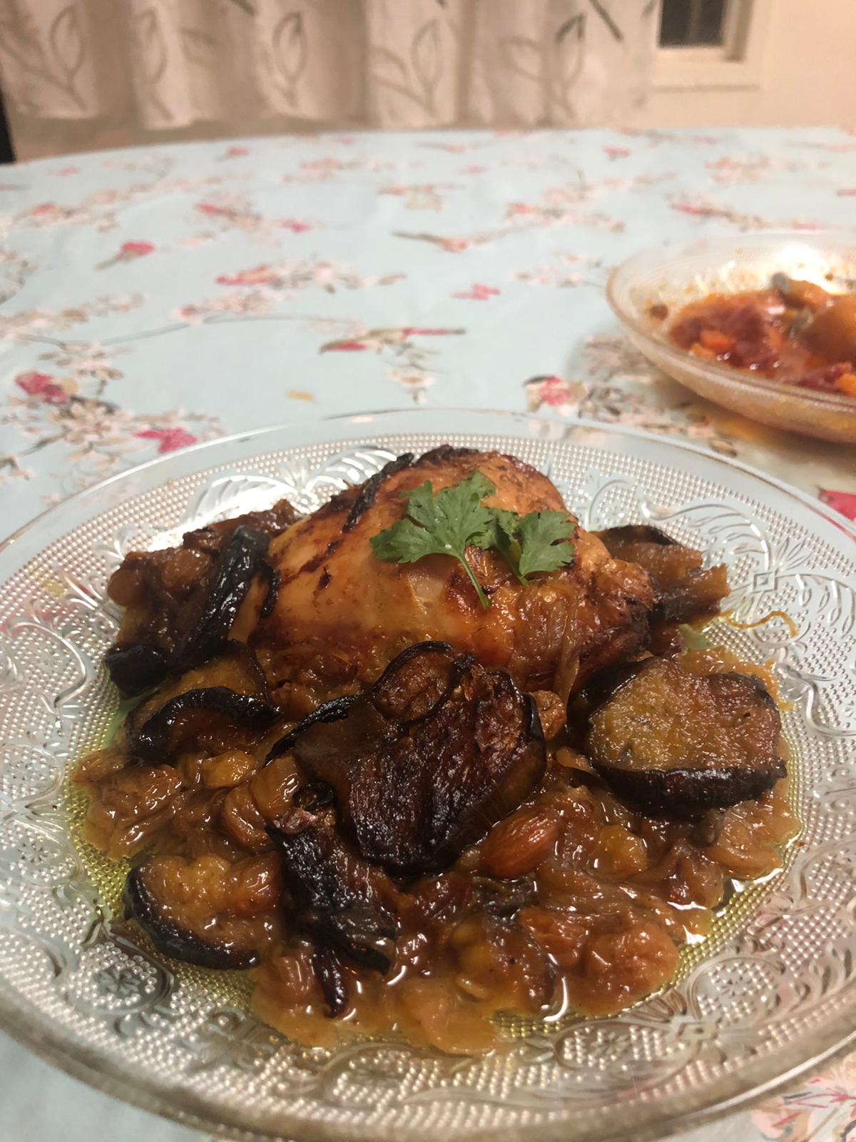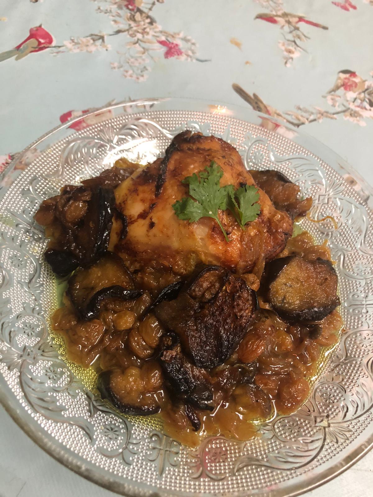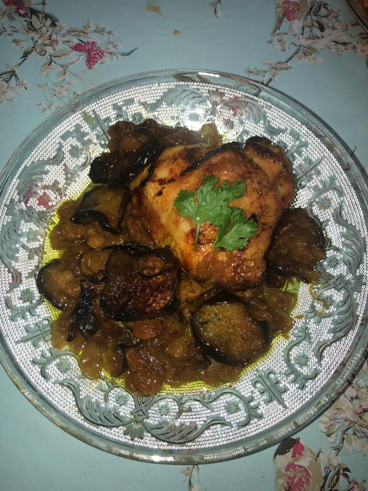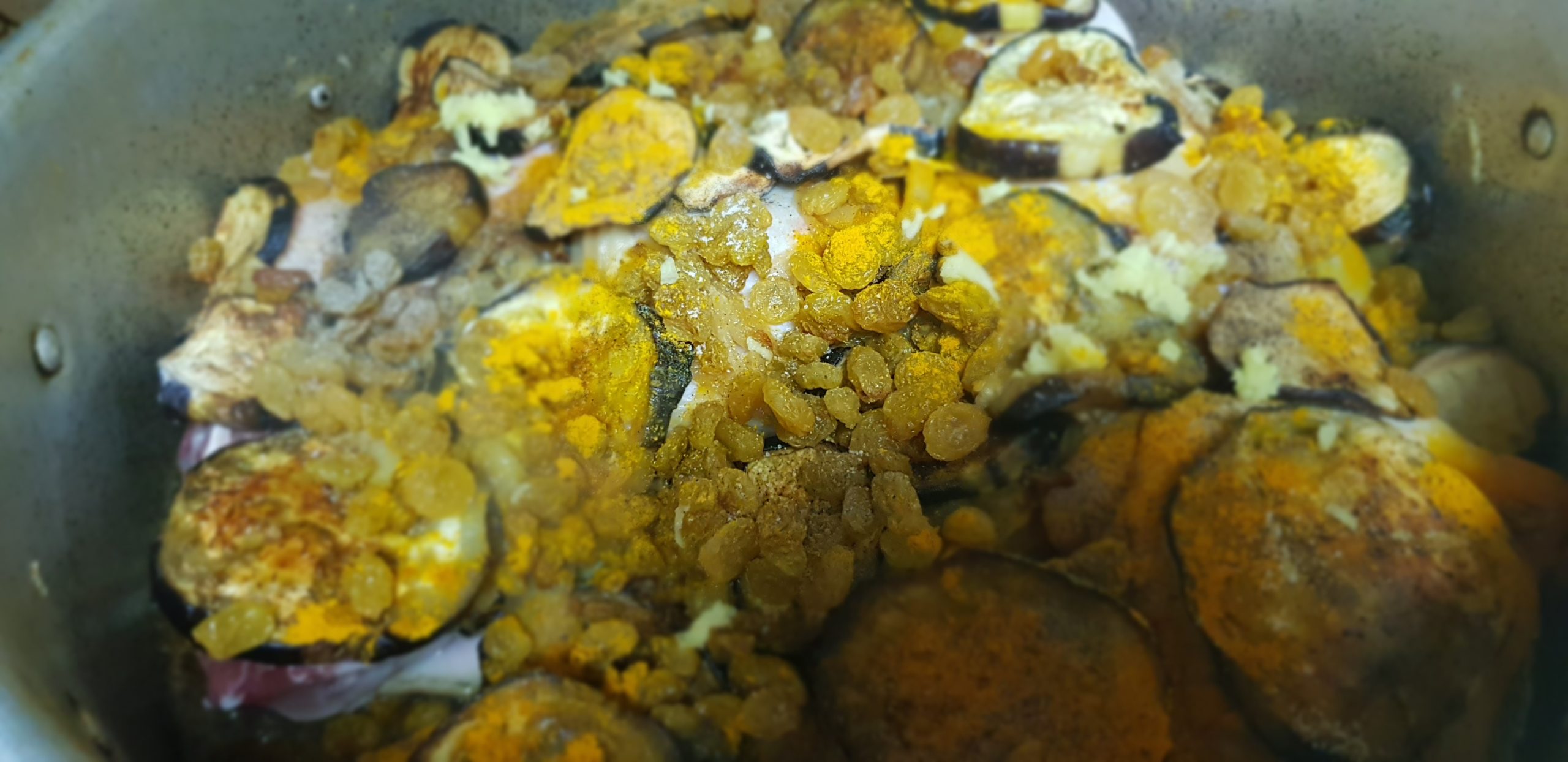 Entre temps, émincer les oignons et les faire revenir à feu doux jusqu’à ce que toute l’eau soit évaporée et laisser mijoter jusqu’à ce que les oignons soit bien dorés. Dans une autre marmite, placer une premiere partie des poulets et ajouter la moitié des oignons, et des aubergines et les épices puis placer à nouveau les autres morceaux de poulet et au dessus des aubergines, et le reste des oignons et terminer les raisins secs et épicer à nouveau.