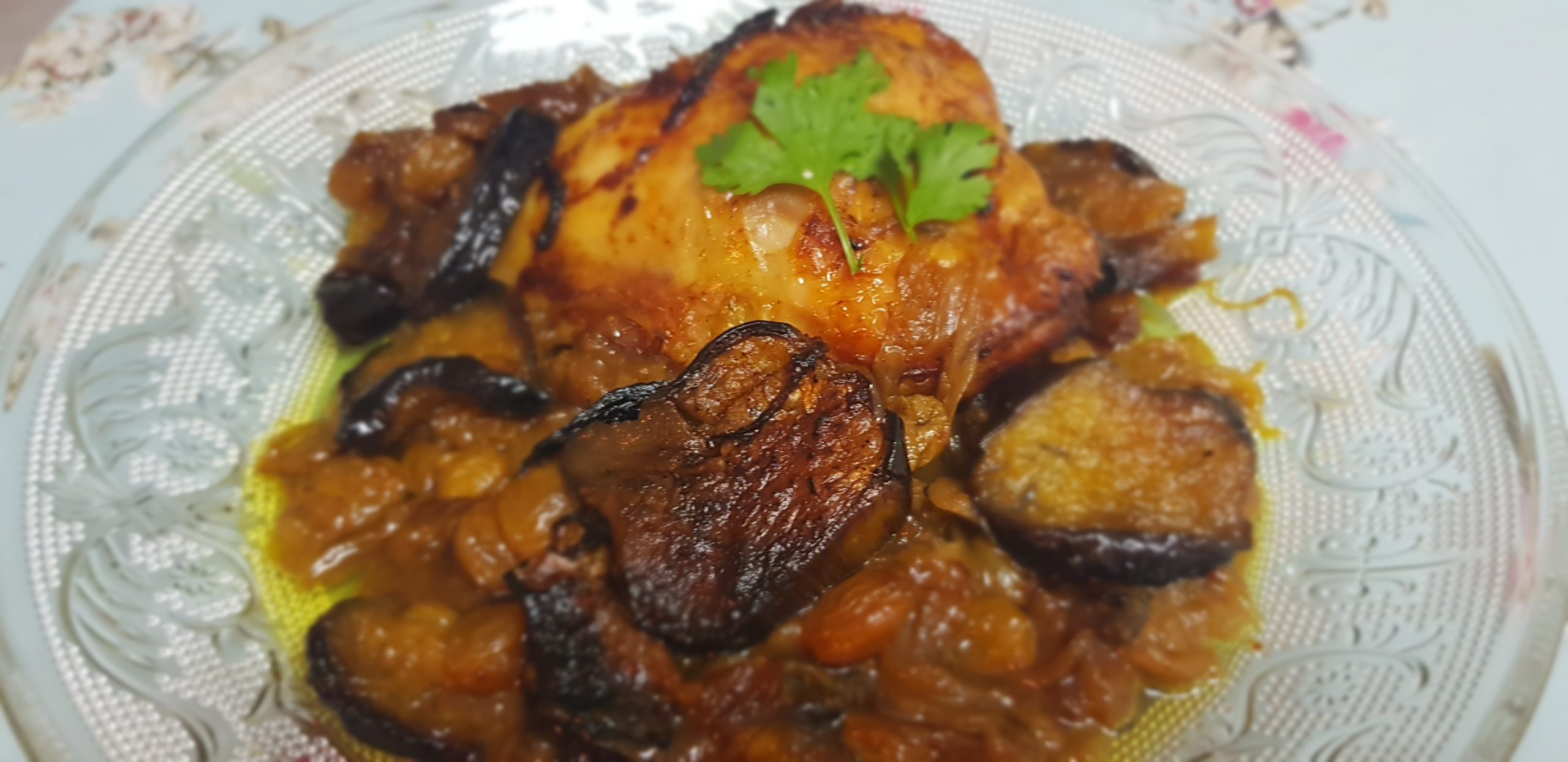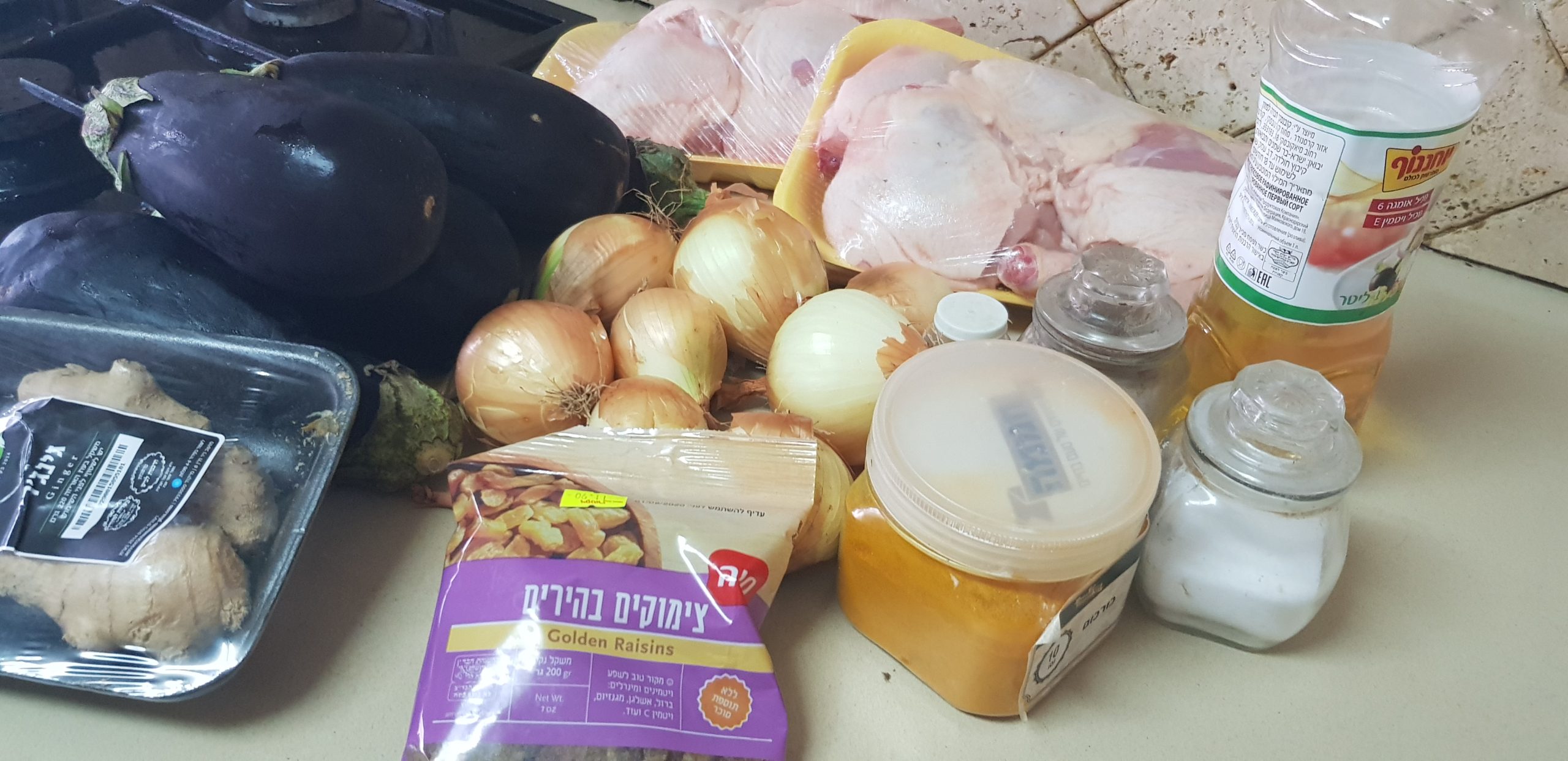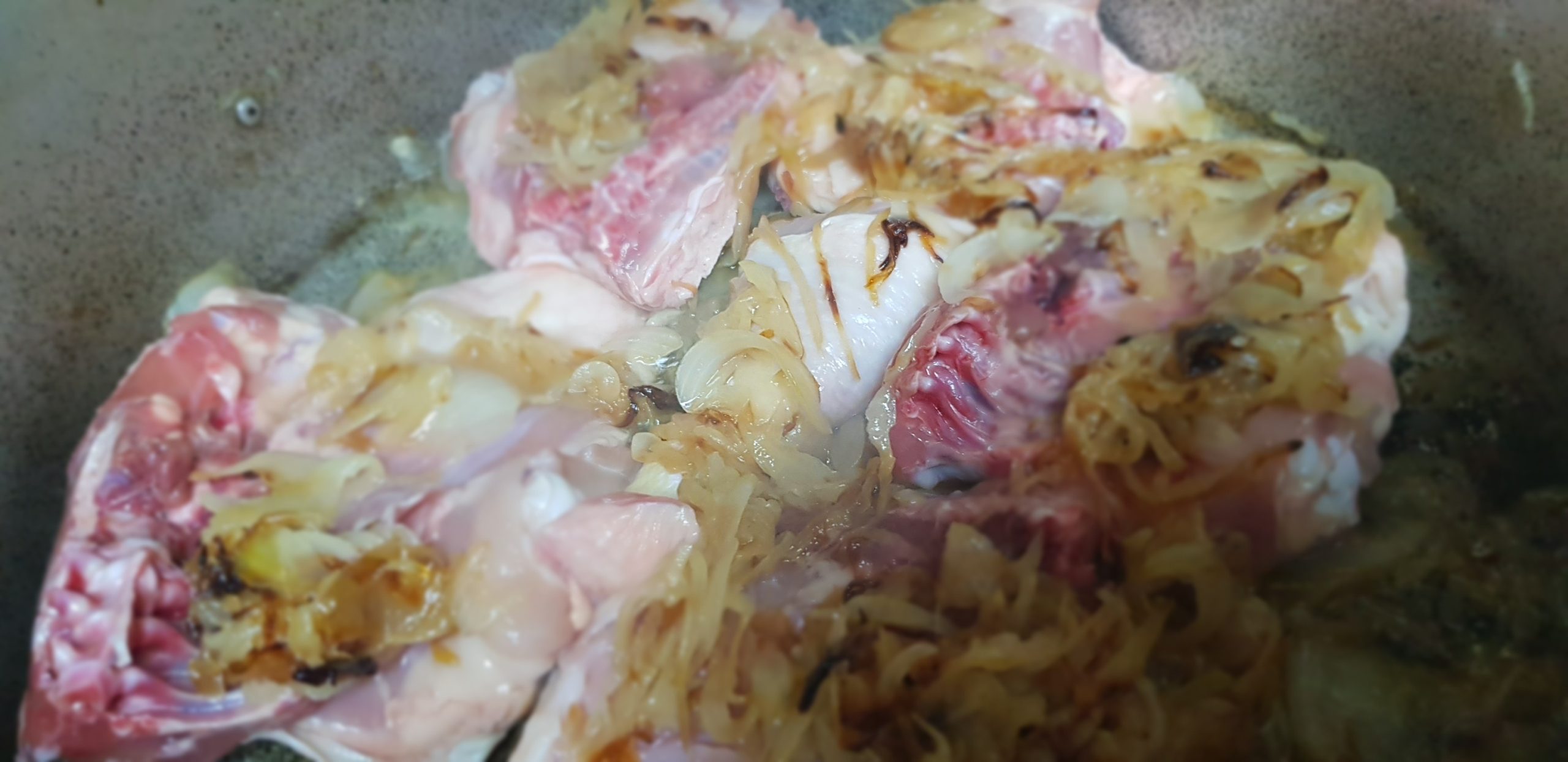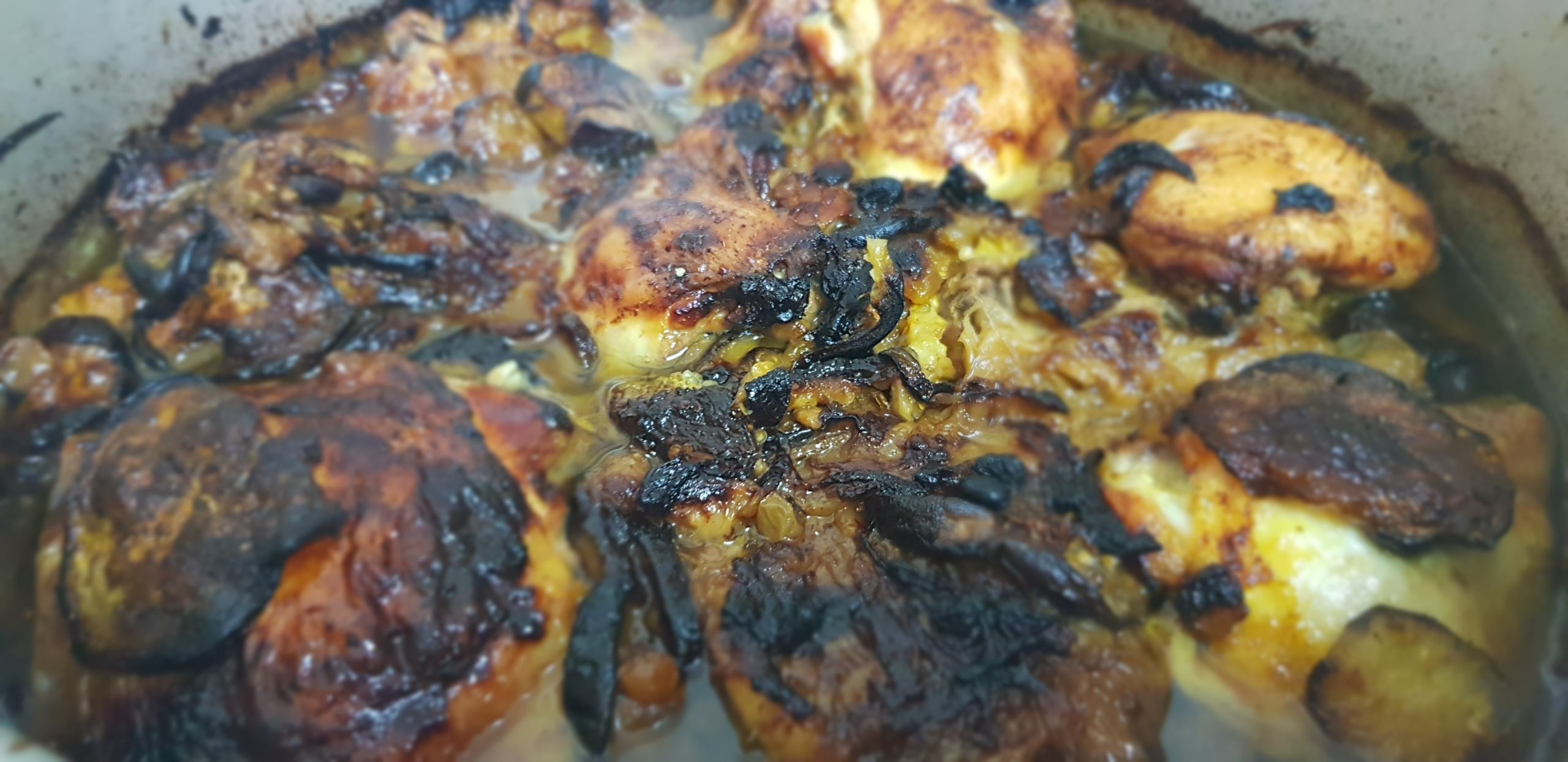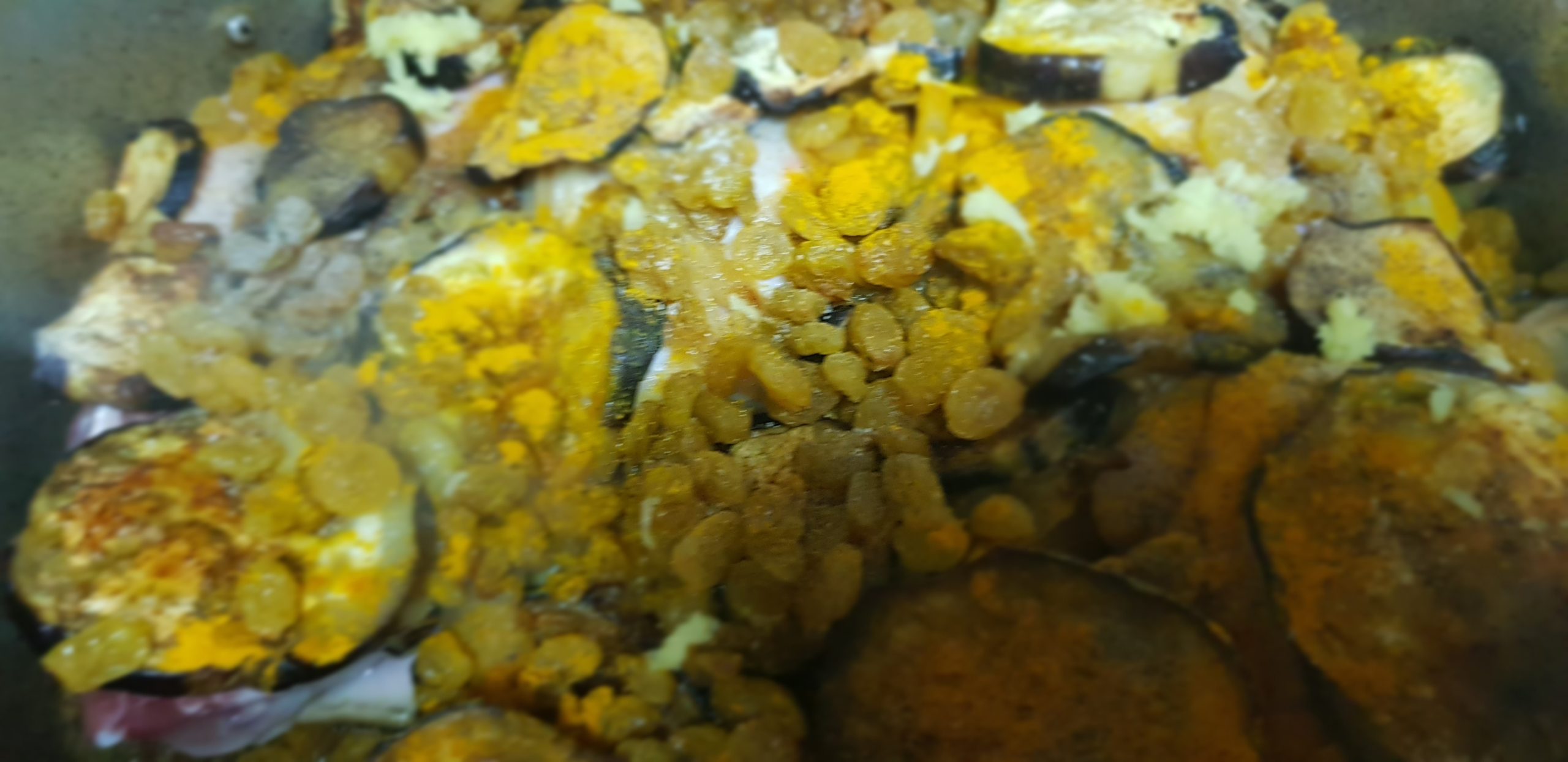 Entre temps, émincer les oignons et les faire revenir à feu doux jusqu’à ce que toute l’eau soit évaporée et laisser mijoter jusqu’à ce que les oignons soit bien dorés. Dans une autre marmite, placer une premiere partie des poulets et ajouter la moitié des oignons, et des aubergines et les épices puis placer à nouveau les autres morceaux de poulet et au dessus des aubergines, et le reste des oignons et terminer les raisins secs et épicer à nouveau.