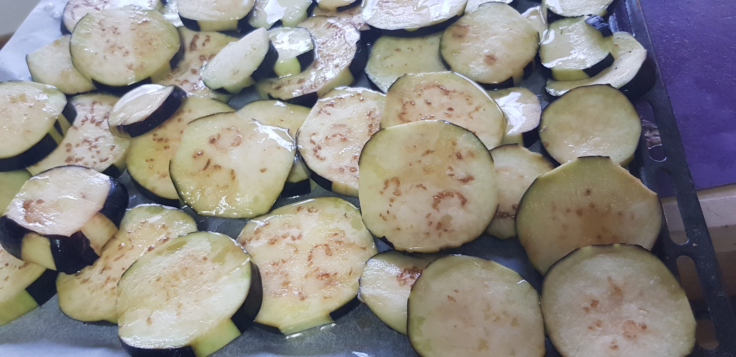 Couper les aubergines en tranches et les laisser masserez dans su sel et ensuite les faire cuire au four avec un filet d’huile.