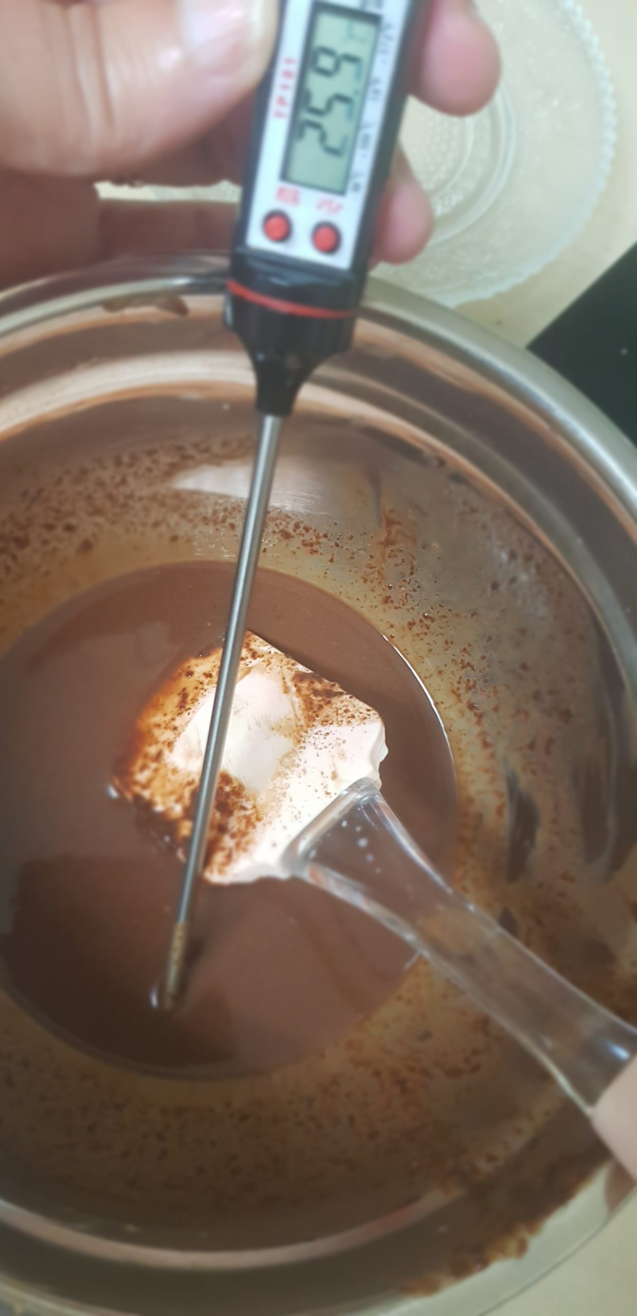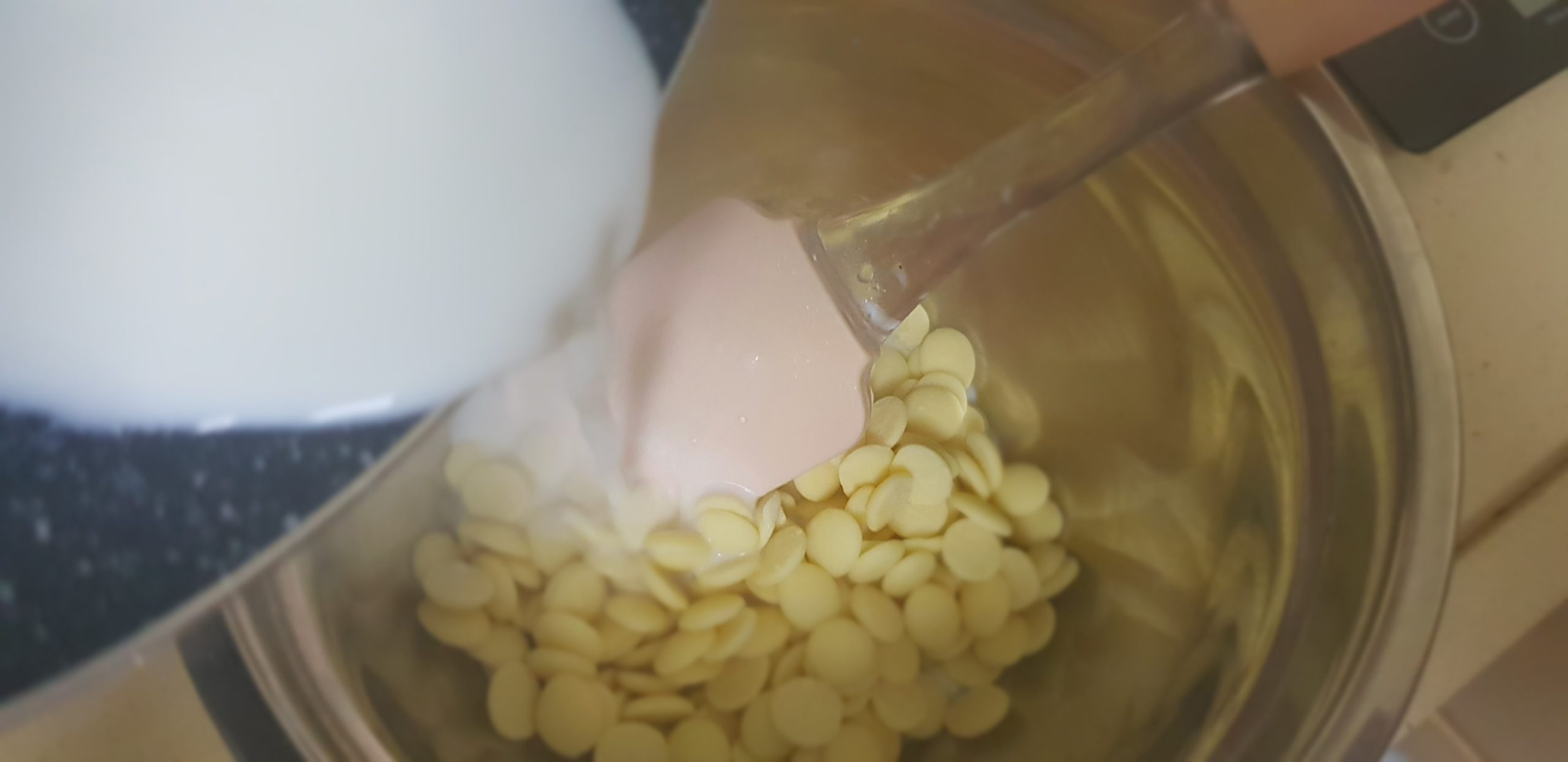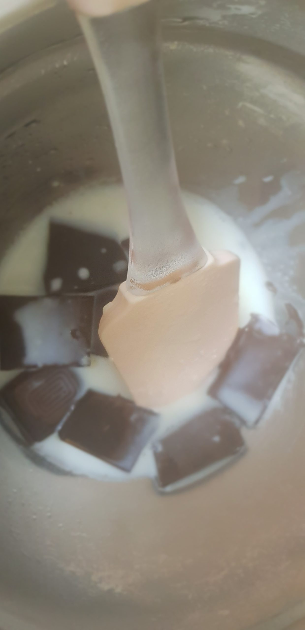 3 – Réaliser une émulsion en 3 fois en versant 1/3 du lait sur le chocolat pour obtenir une texture élastique lisse et brillante signe d’une émulsion démarrée.