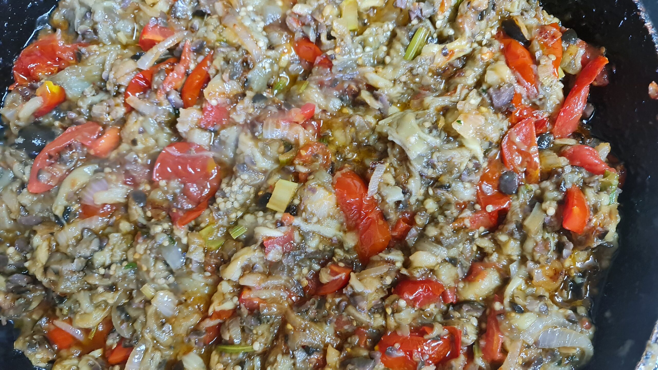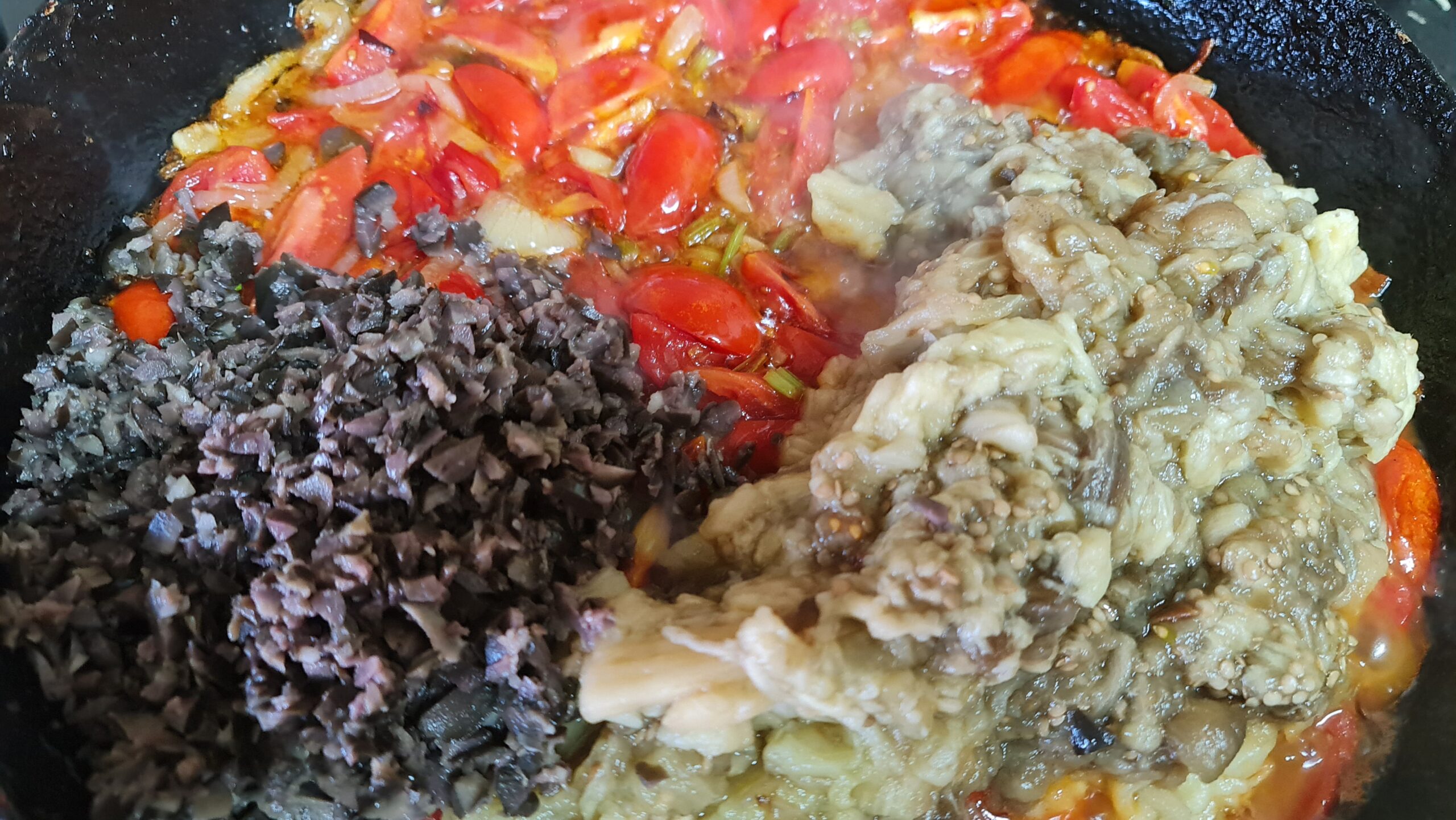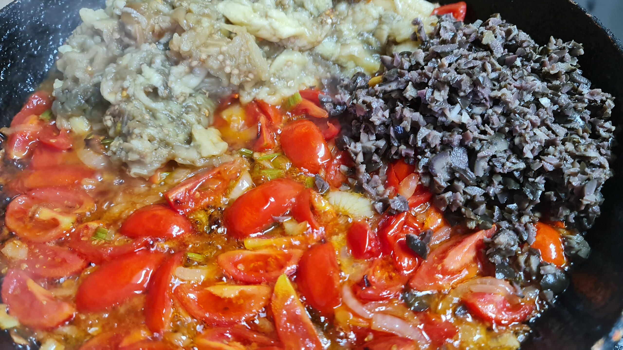 – Rajouter aubergines & olives hachées pour encore 8 minutes à feu doux.