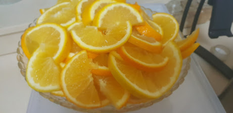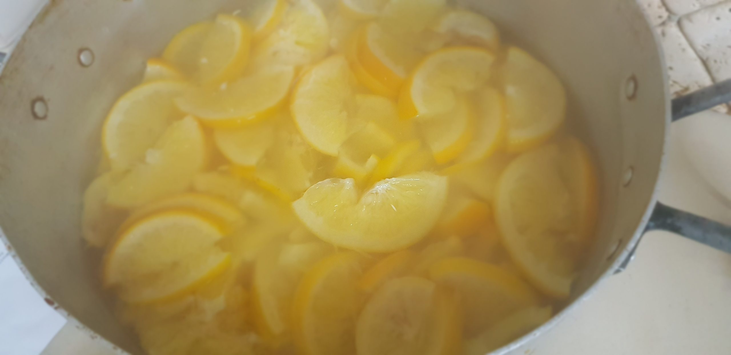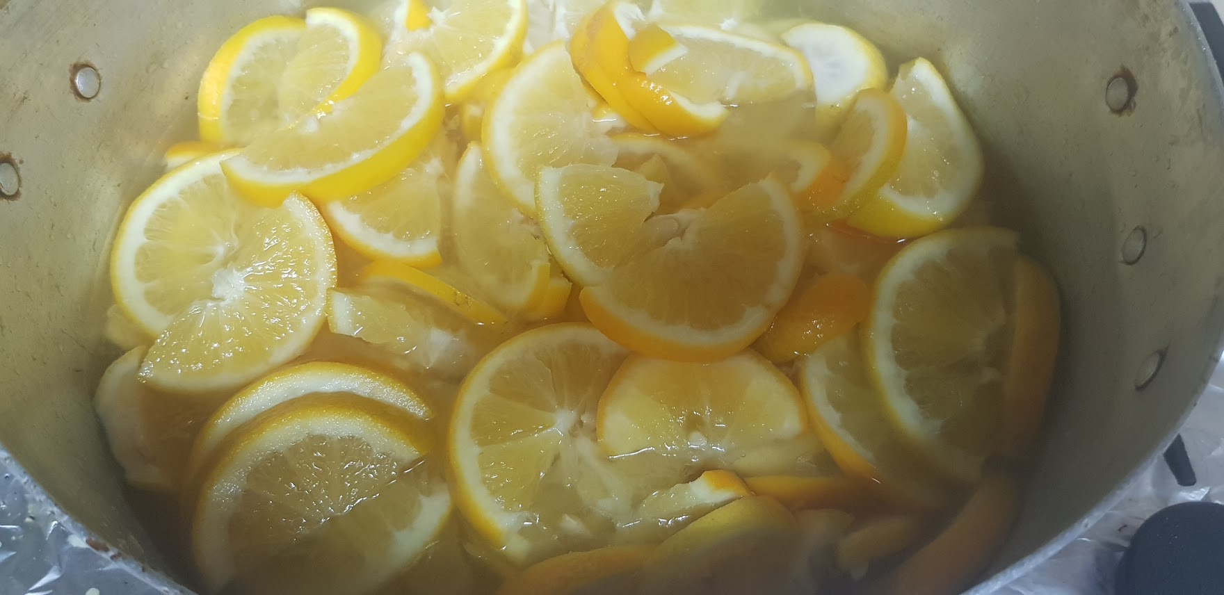 2 – Les couper en fines lamelles ou petits carrés , ( ma mère les coupé en 4 seulement, car cette confiture peut se faire comme une « marmelade, ou des fruits confits). Les recouvrir d’eau et les laisser ainsi 24h.