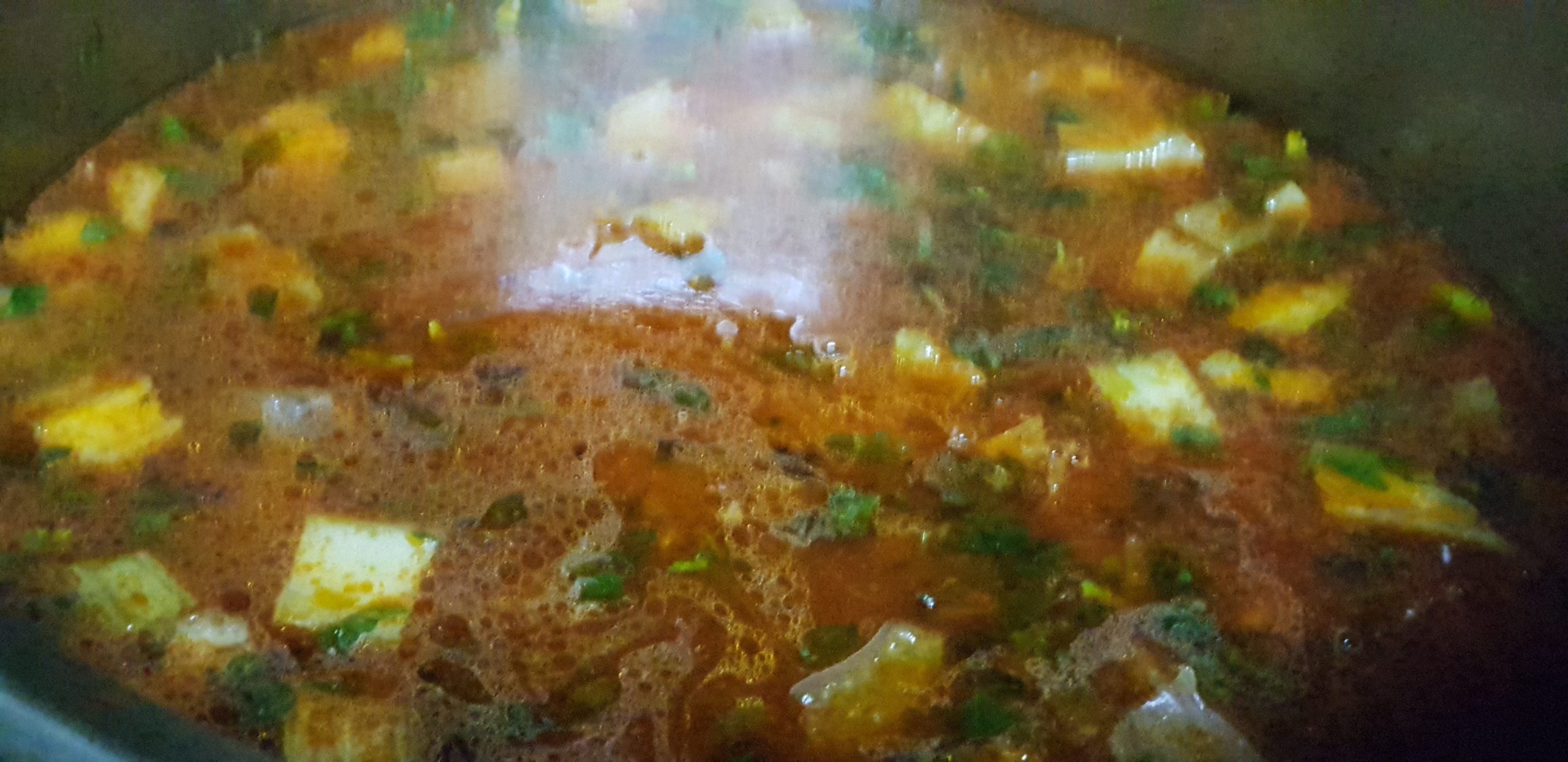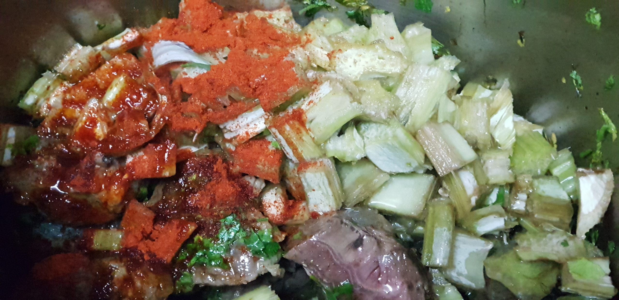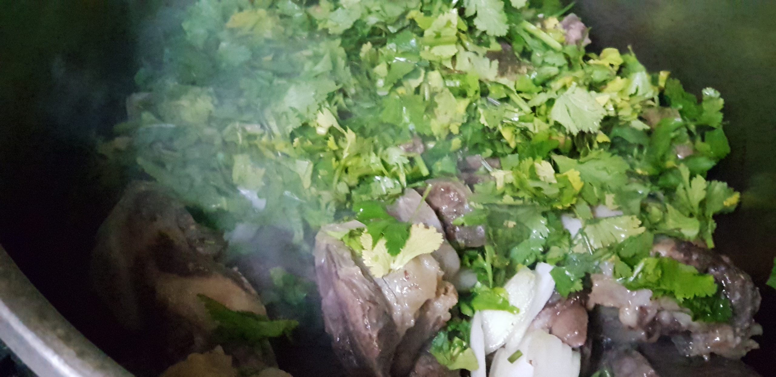 Dans une cocotte minute très haute, faire revenir 3 a 4 oignons qui ont été mixés avec la botte de kosbara . Puis ajouter la viande coupées en cubes par trop petits. Laisser cuire 15 minutes.