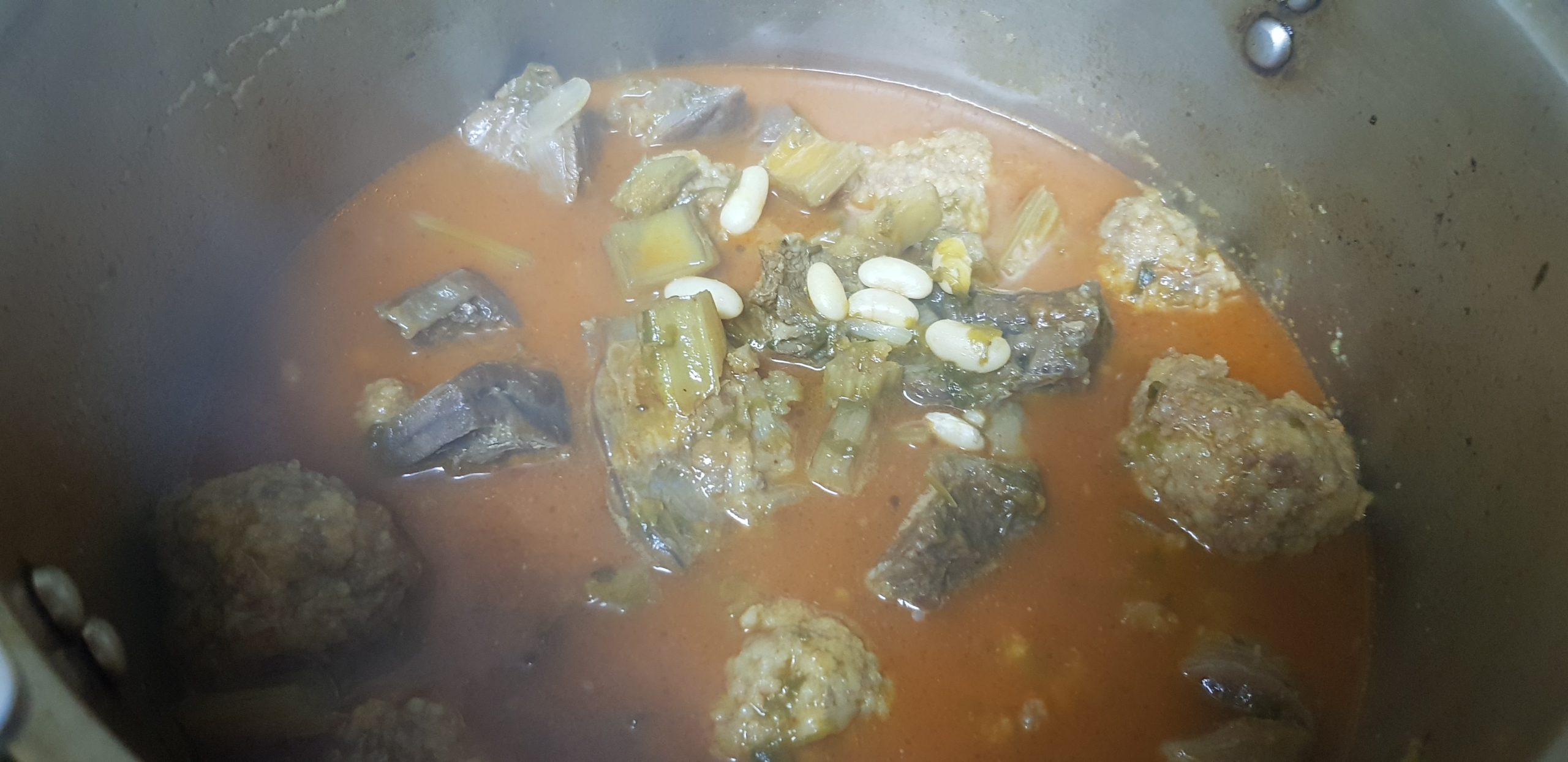 Ajouter ensuite les haricots, les cardes, l’huile d’olive, le paprika, et ajouter de l’eau jusqu’à 2/3 de la hauteur et faire cuire a feu moyen entre 1 a 2 heures…..Ajouter le sel en fin de cuisson.