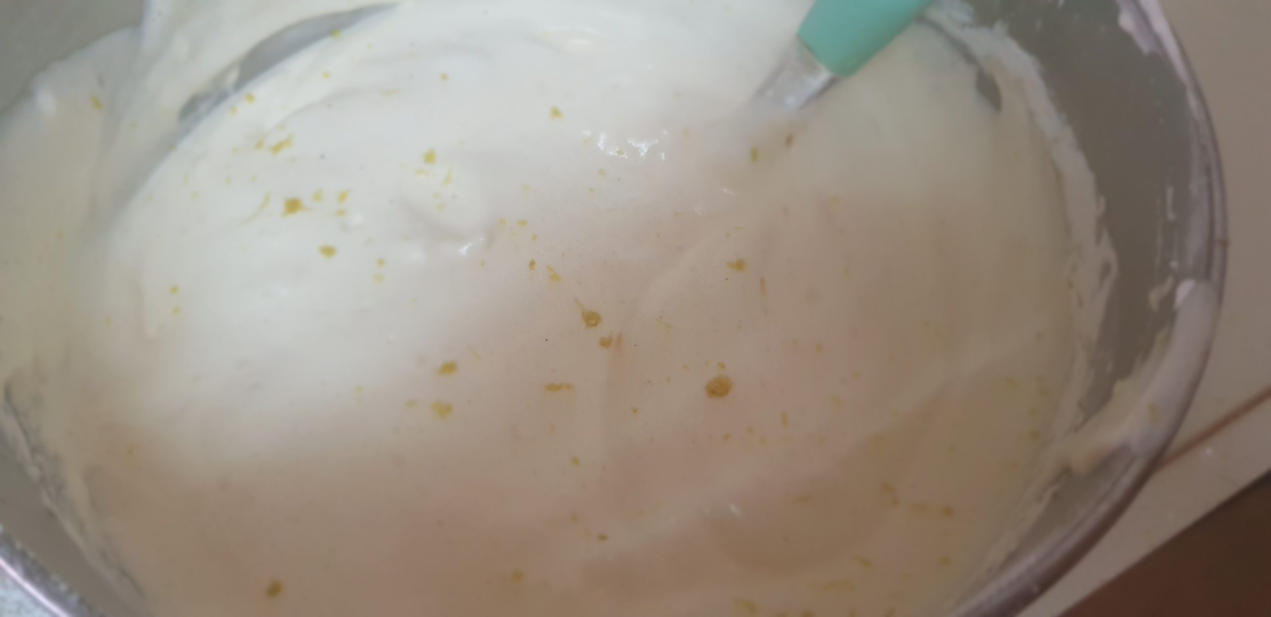 3 – Verser en pluie la moitié des poudres et les incorporer délicatement à la maryse, ajouter le zeste du citron râpé à la microplane puis le reste des poudres et mélanger à nouveau à la maryse. Quand l’appareil est lisse le verser dans le moule en le remplissant aux 3/4.