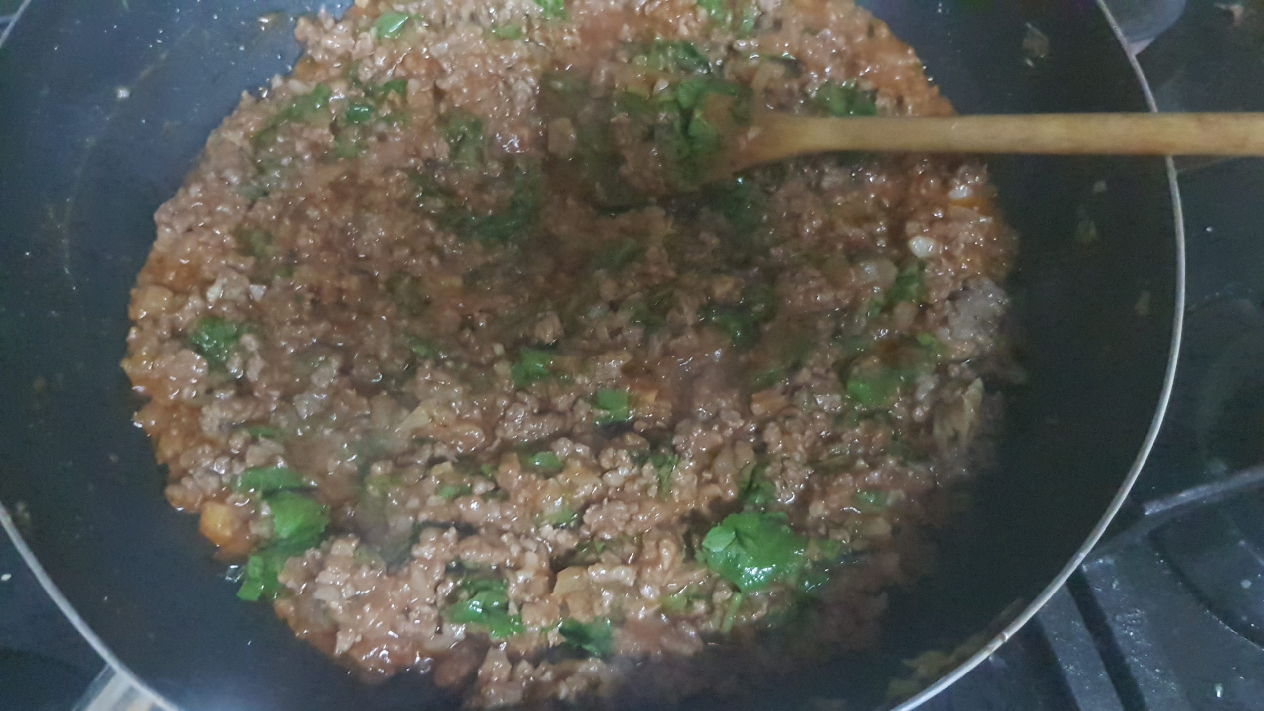 Faire revenir dans un peu d’huile d’olive pendant 15 minutes à feux doux et ajouter la viande hachée.