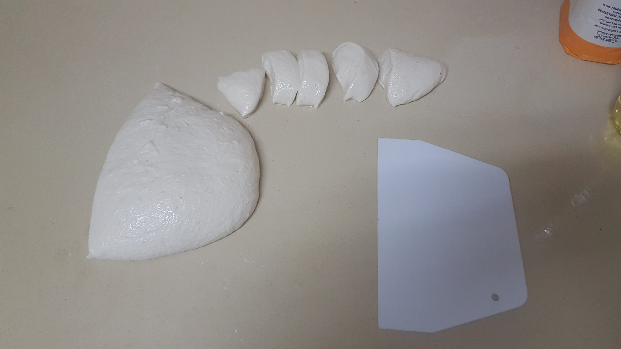 7 – Déposer un peu d’huile sur le plan de travail et prendre une boulette de pâte, l’étirer un peu, déposer un tout petit peu d’huile sur la pâte pour l’étaler avec les doigts le plus finement possible.