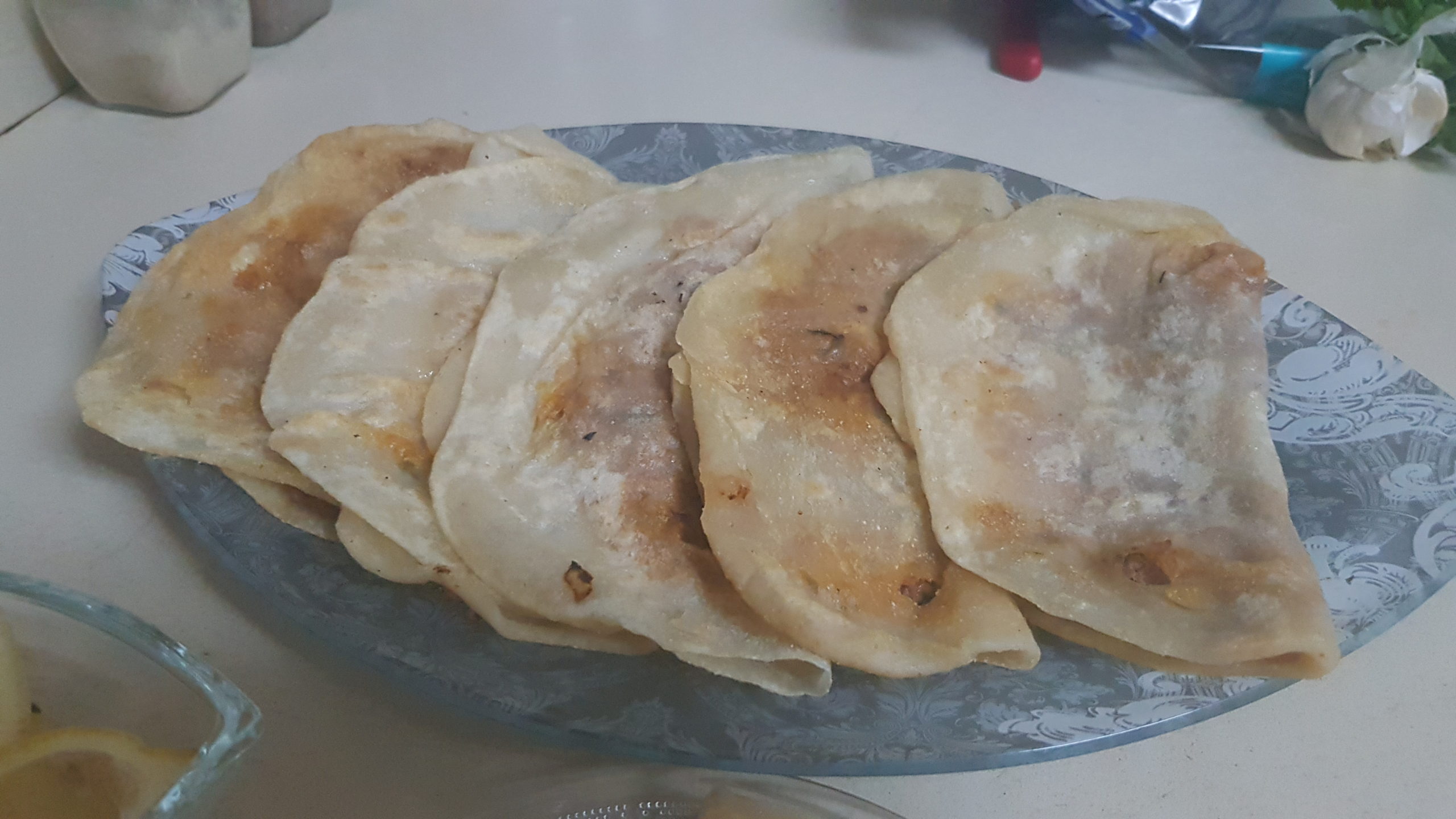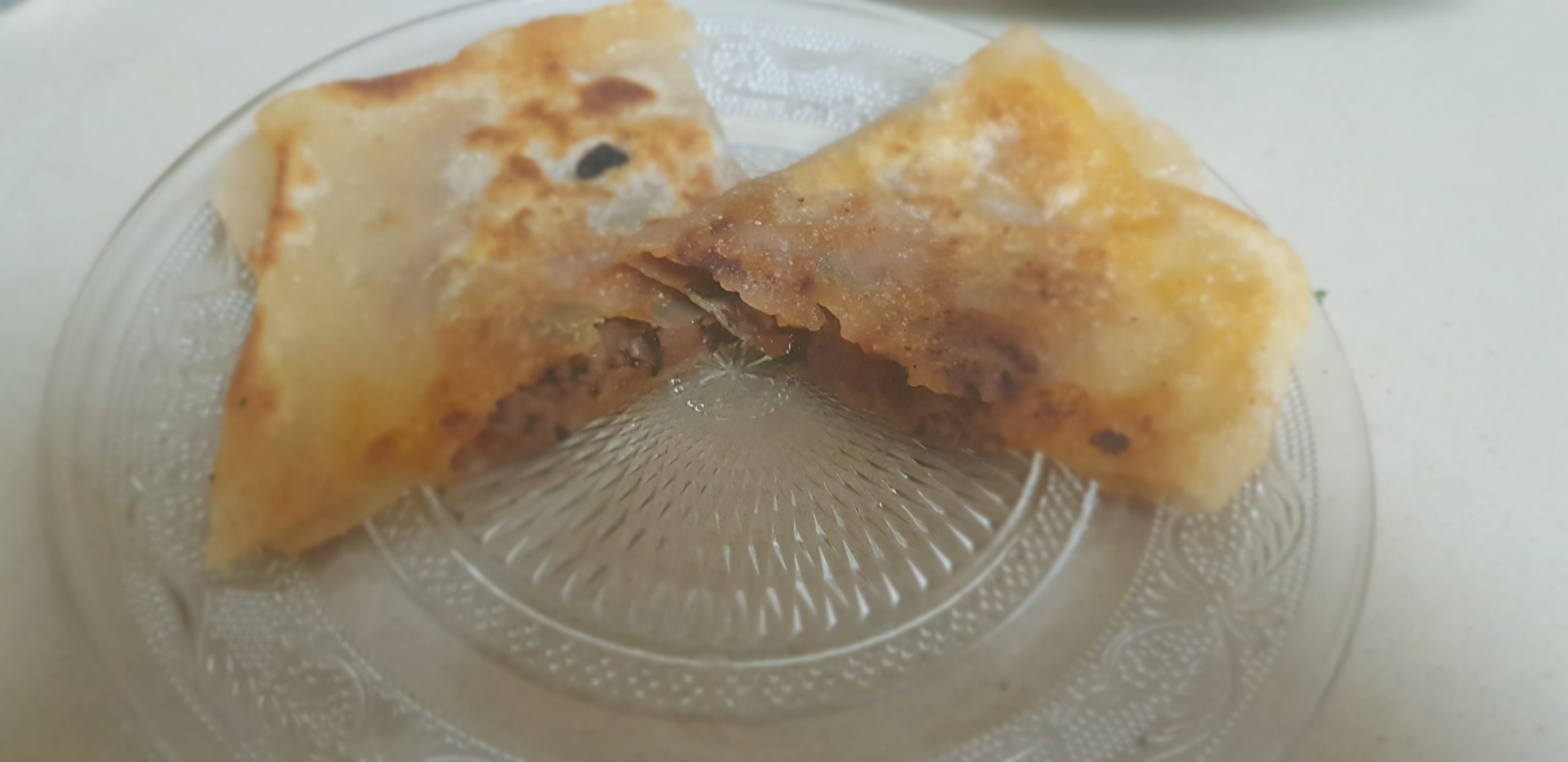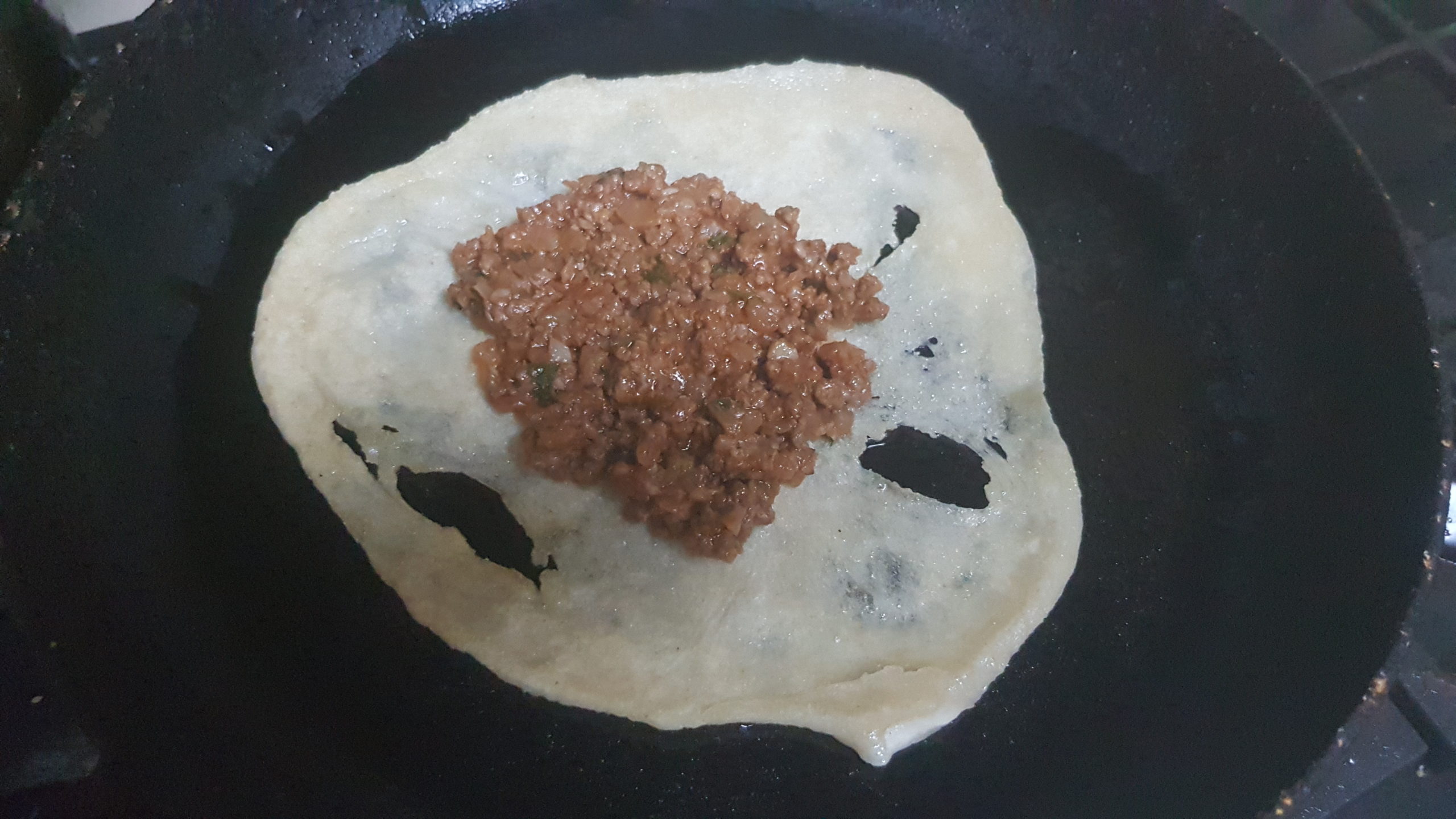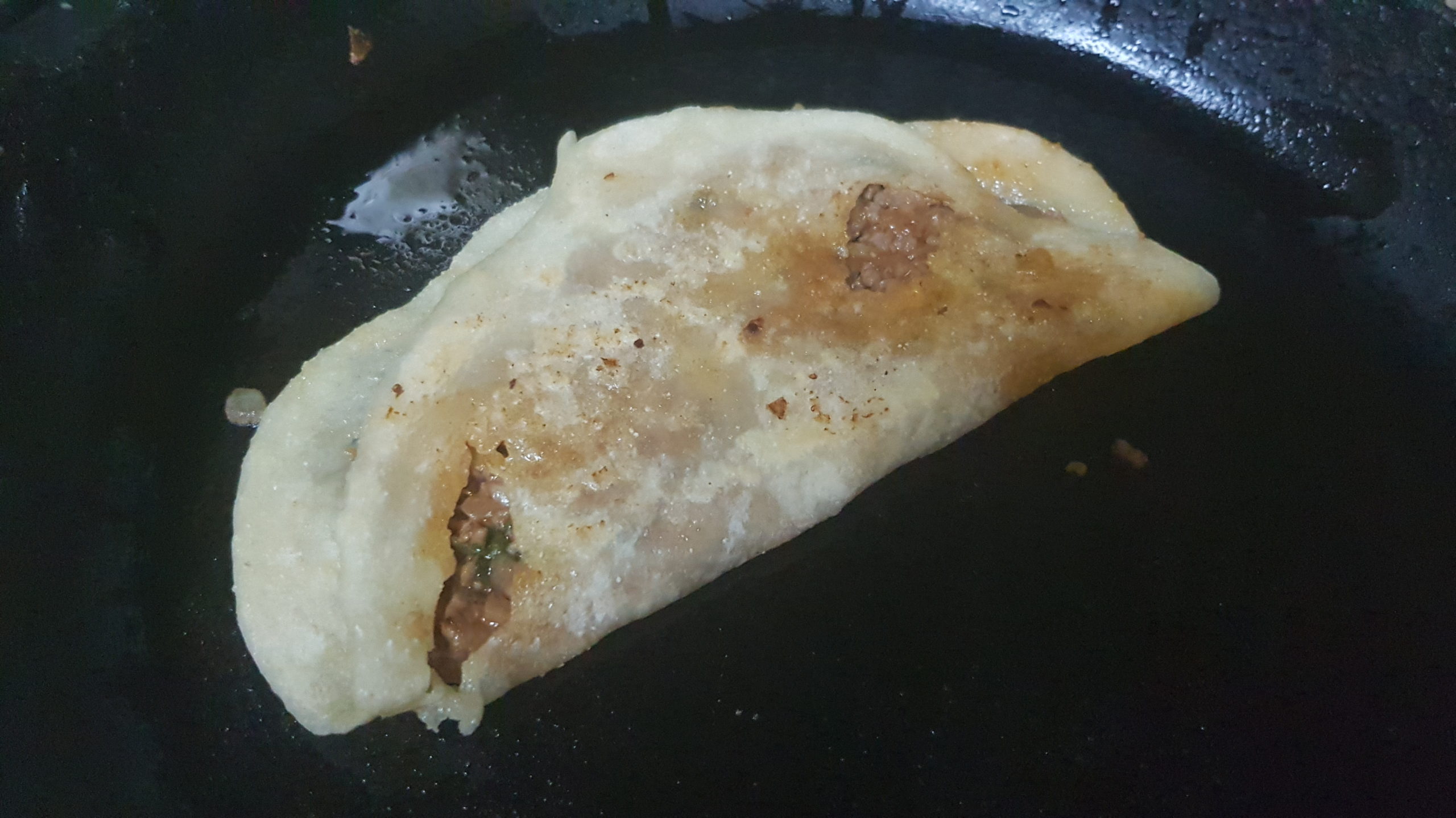 8 – Cuire la pate 5 minutes et ajouter deux cuillères de farce et refermer , comme pour former le chausson.