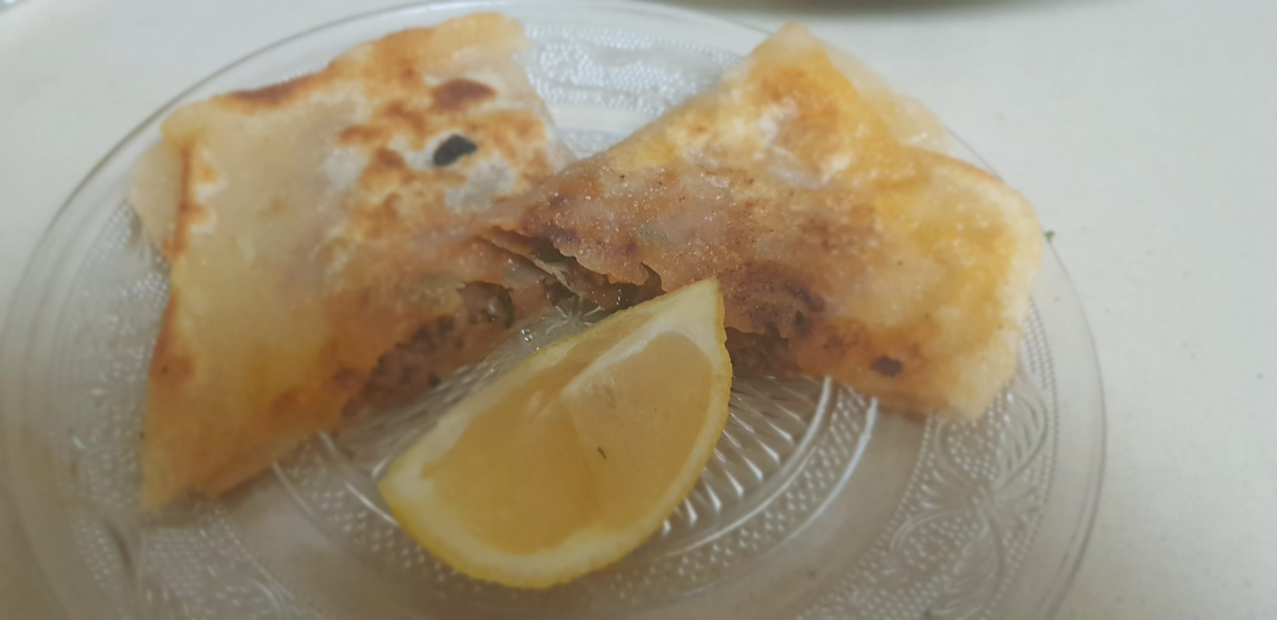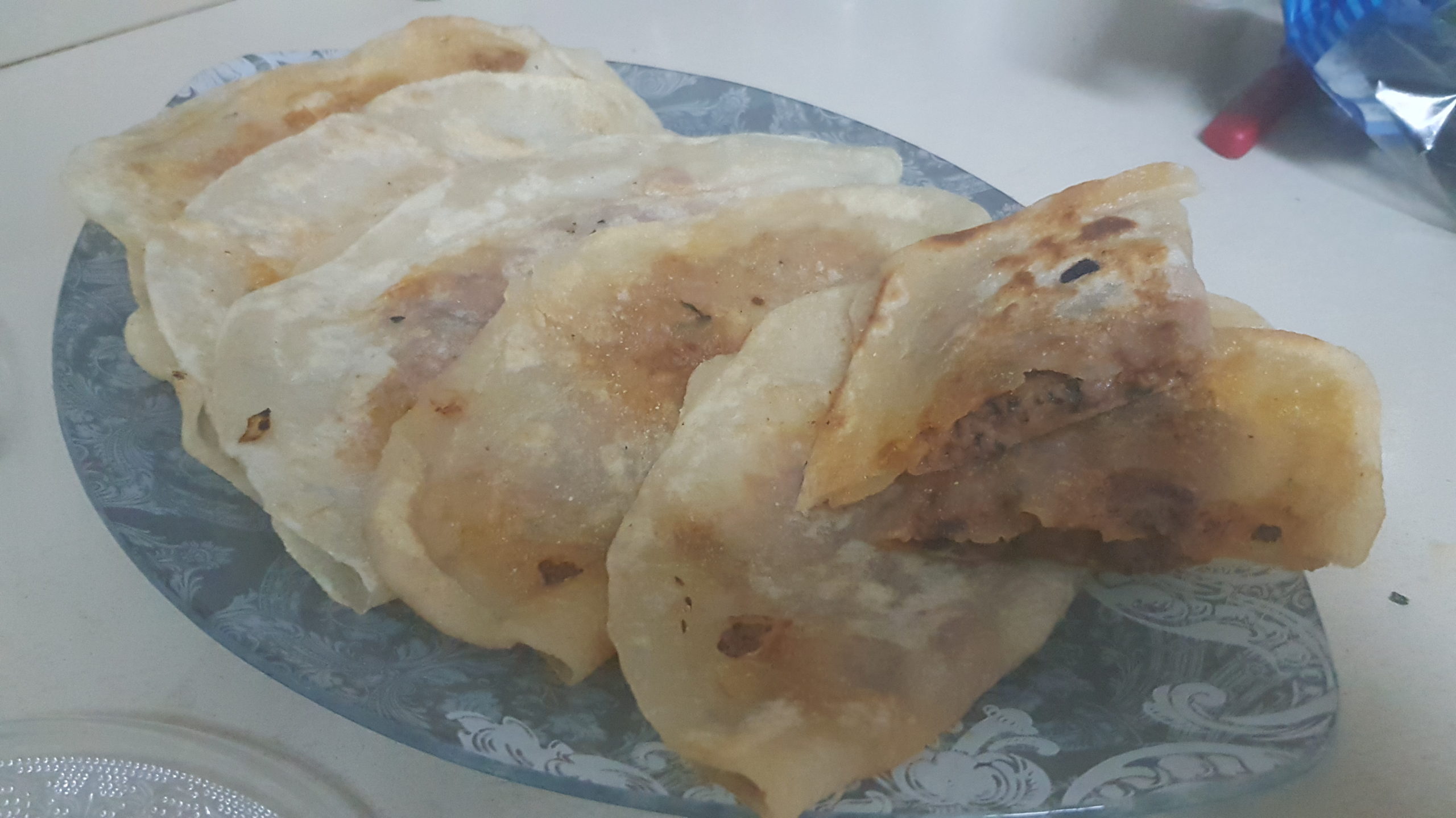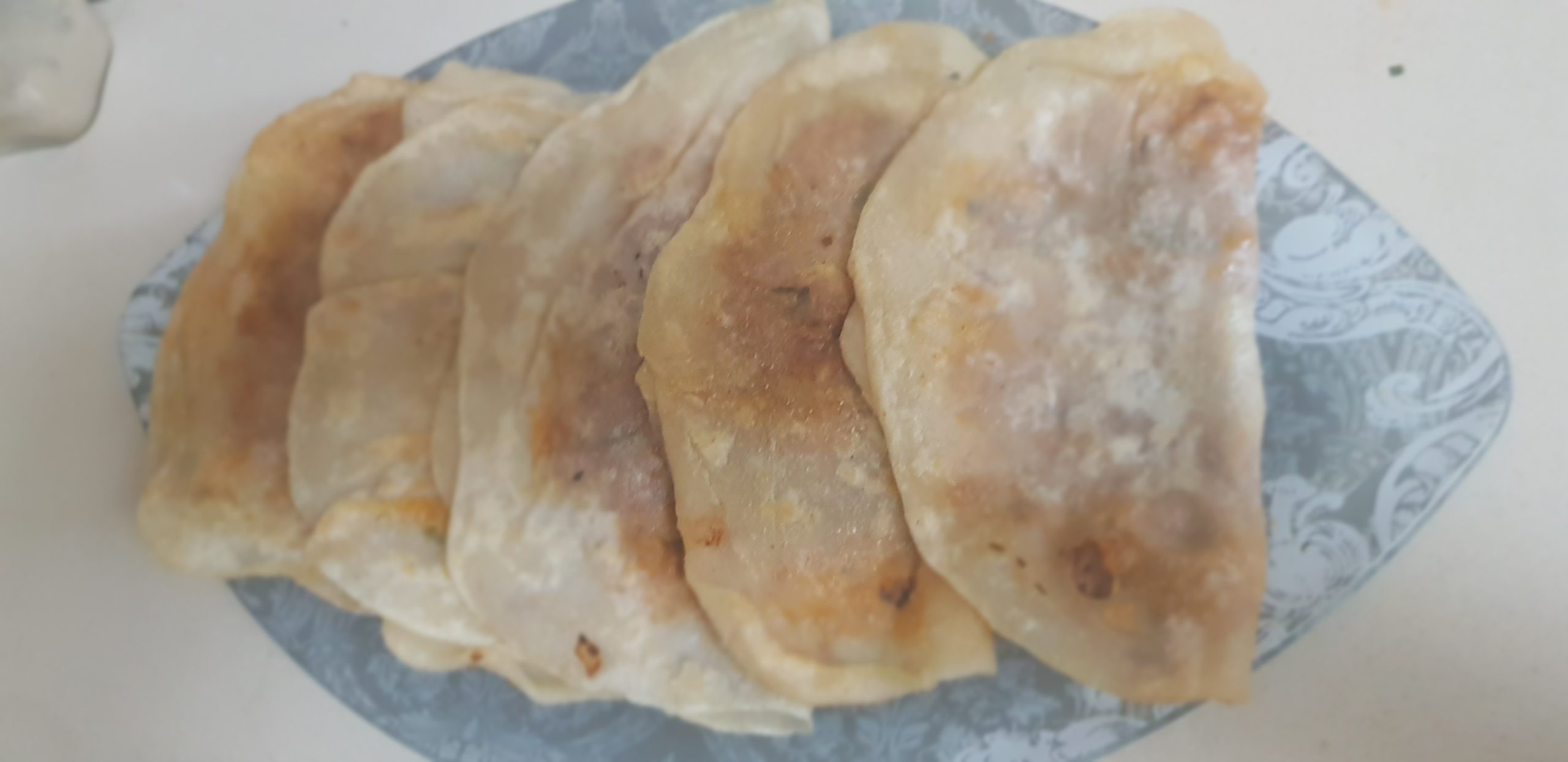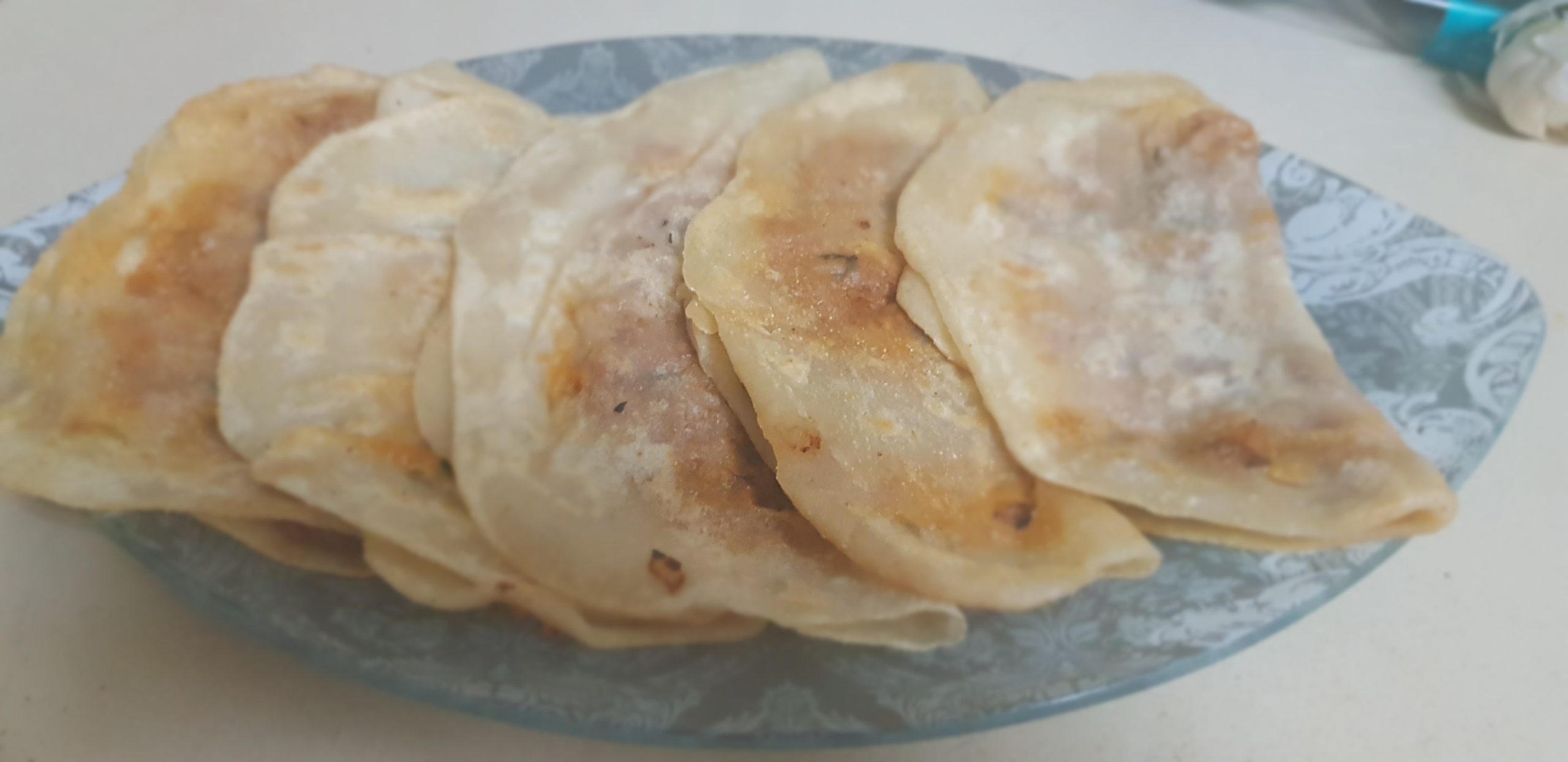 8 – Cuire la pate 5 minutes et ajouter deux cuillères de farce et refermer , comme pour former le chausson.