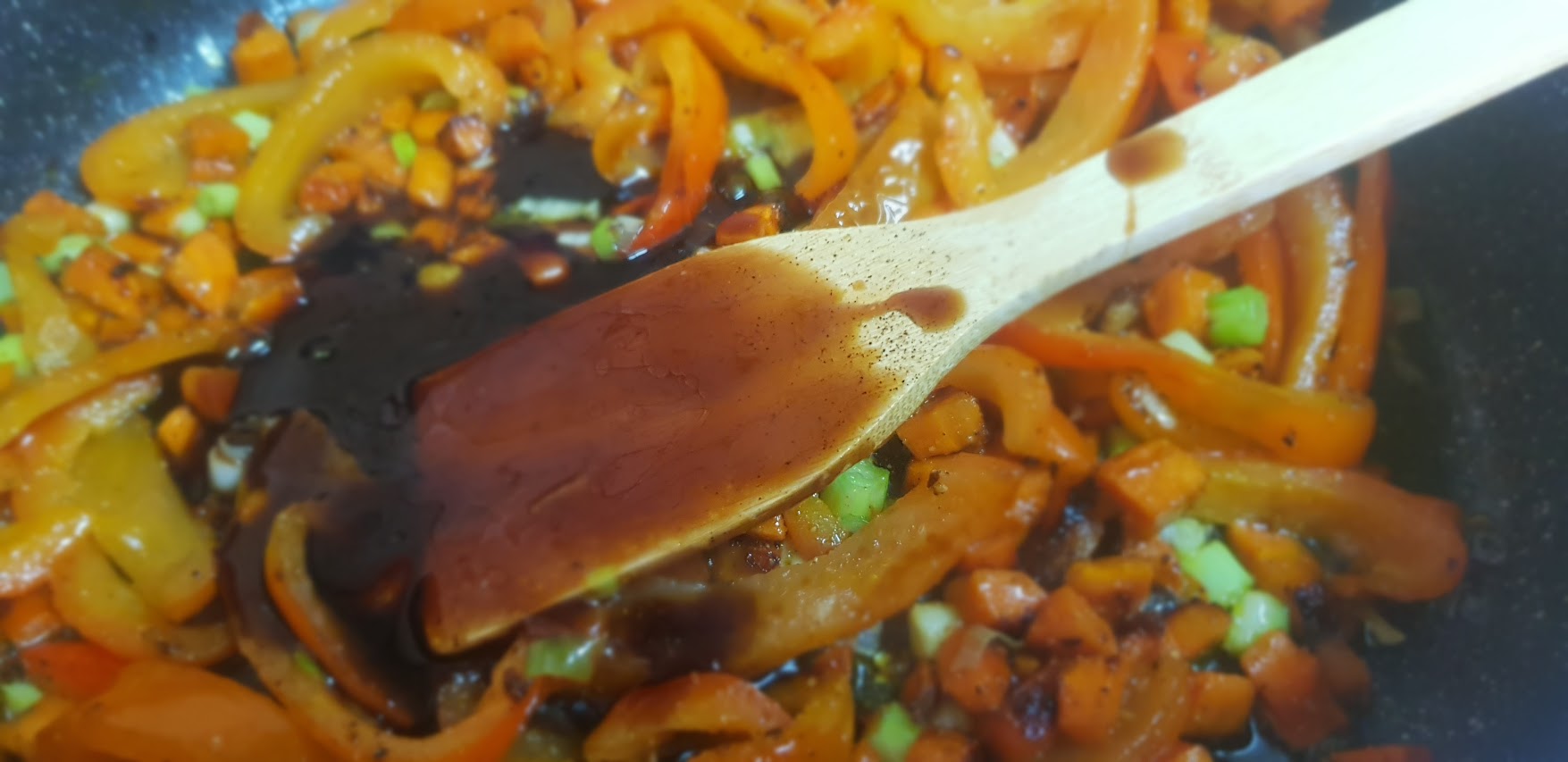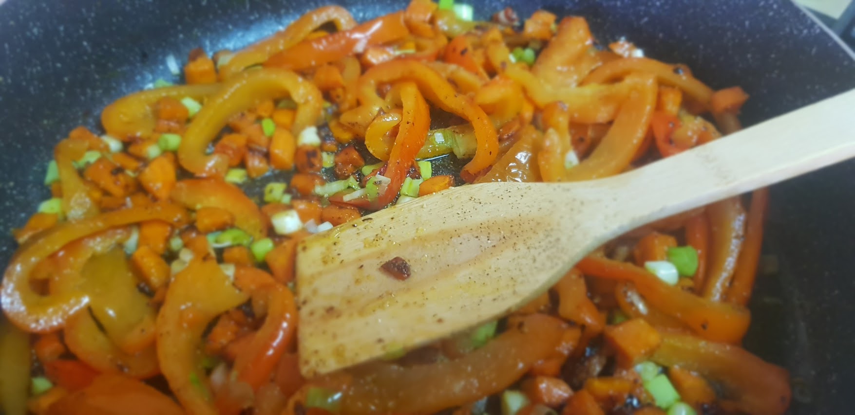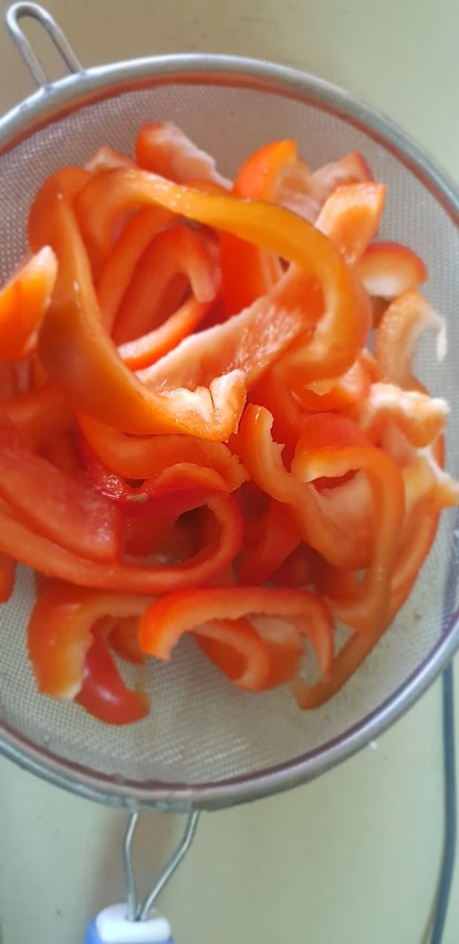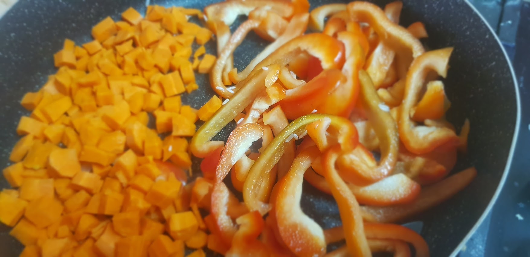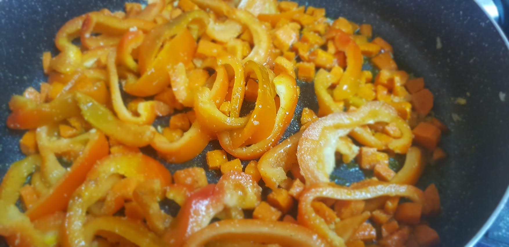 Entre temps, couper le poivrons en lamelles. Couper les carottes en petit cubes et ajouter de légumes de saison ou ceux que vous préférez.