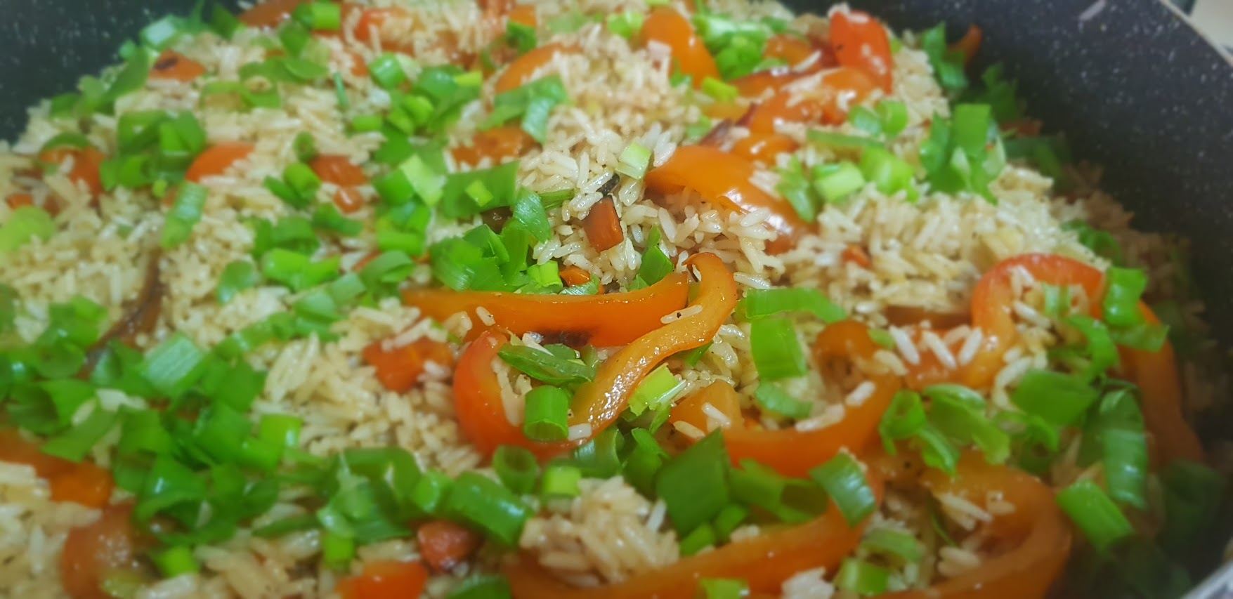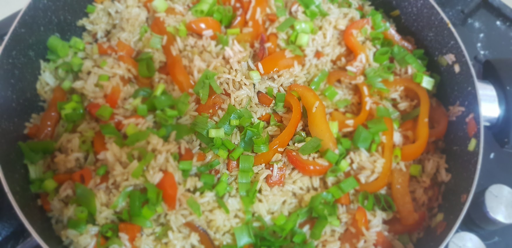 Vérifier la cuisson de votre riz, et quand il est cuit, disposer le riz dans un bol et laisser tiédir (ajouter u filet d’huile pour éviter que le grains se collent entre eux) . Rajouter de l’huile dans la poêle et faire cuire les poivrons et les carottes. Ajouter du sel, du poivre , de l’ail en poudre et du gingembre (ou frais) . Laisser cuire 20 minutes sur feu moyen.