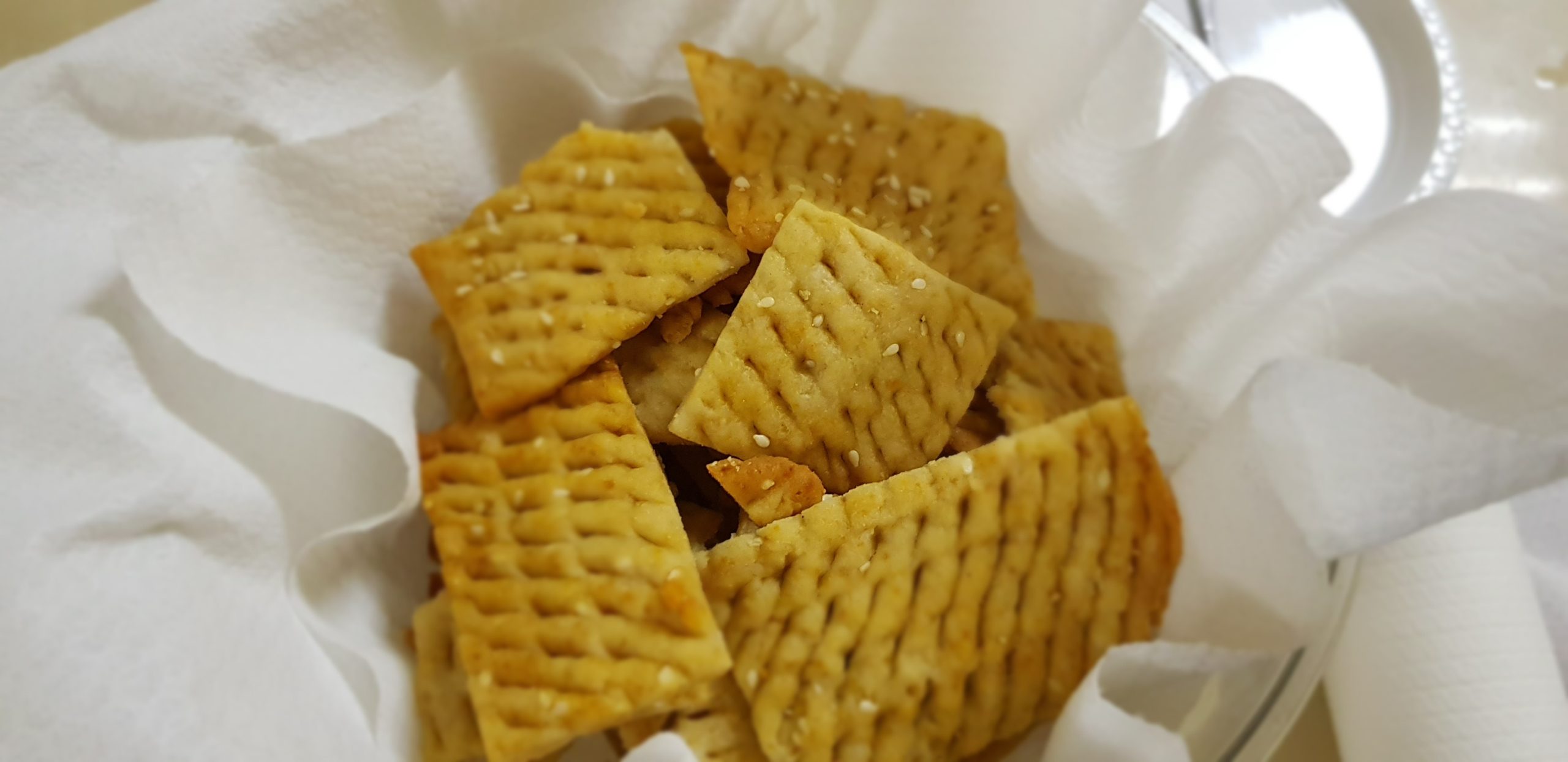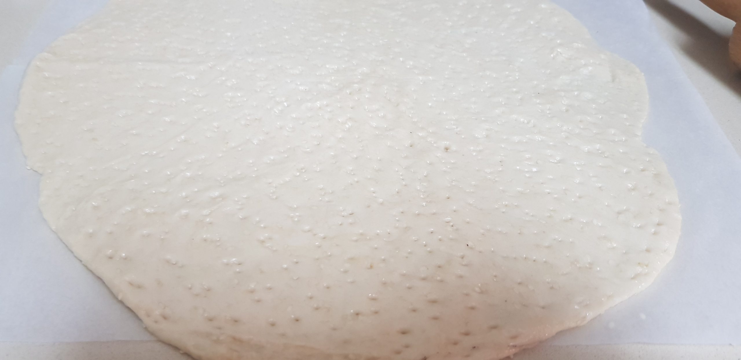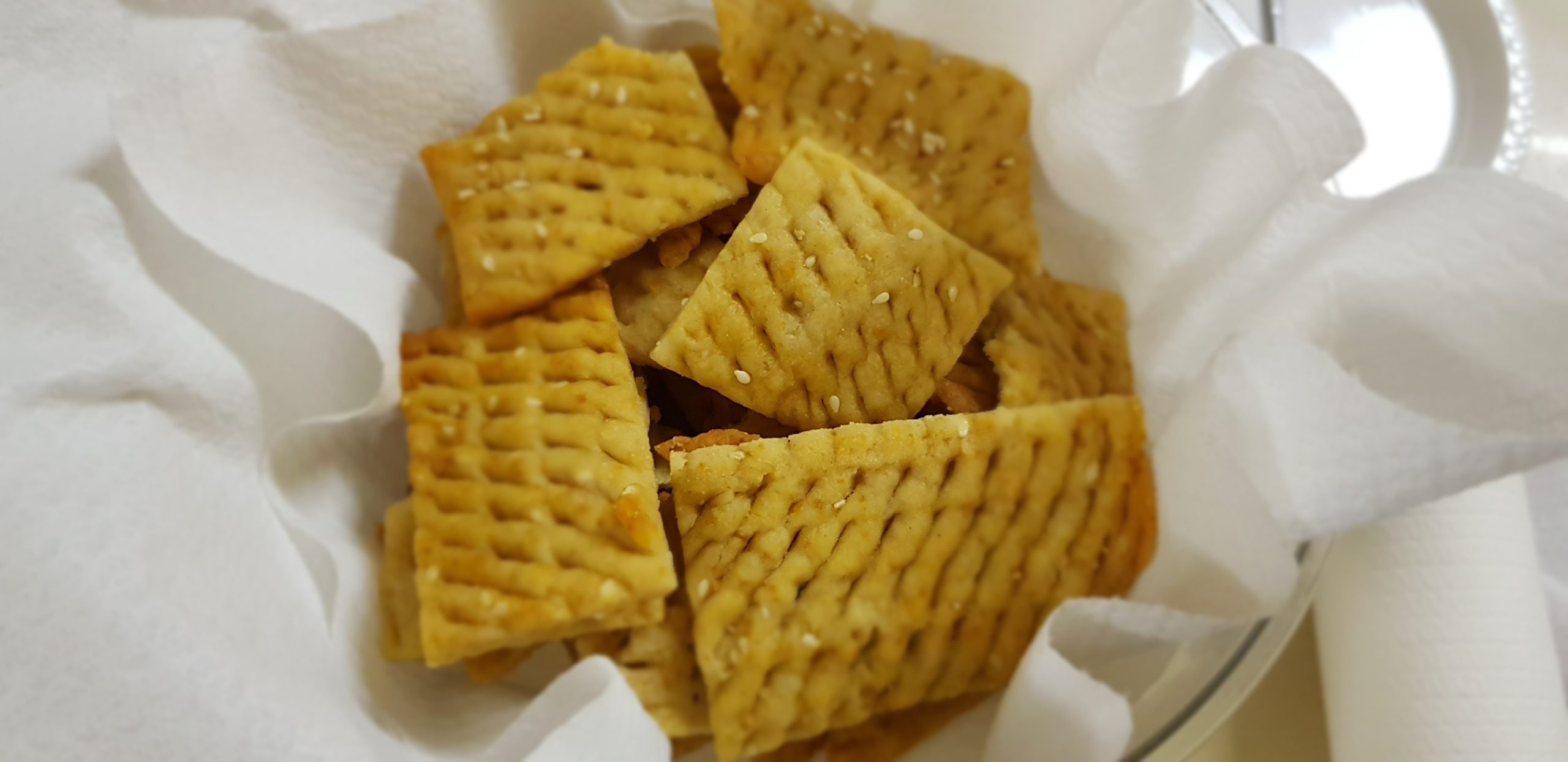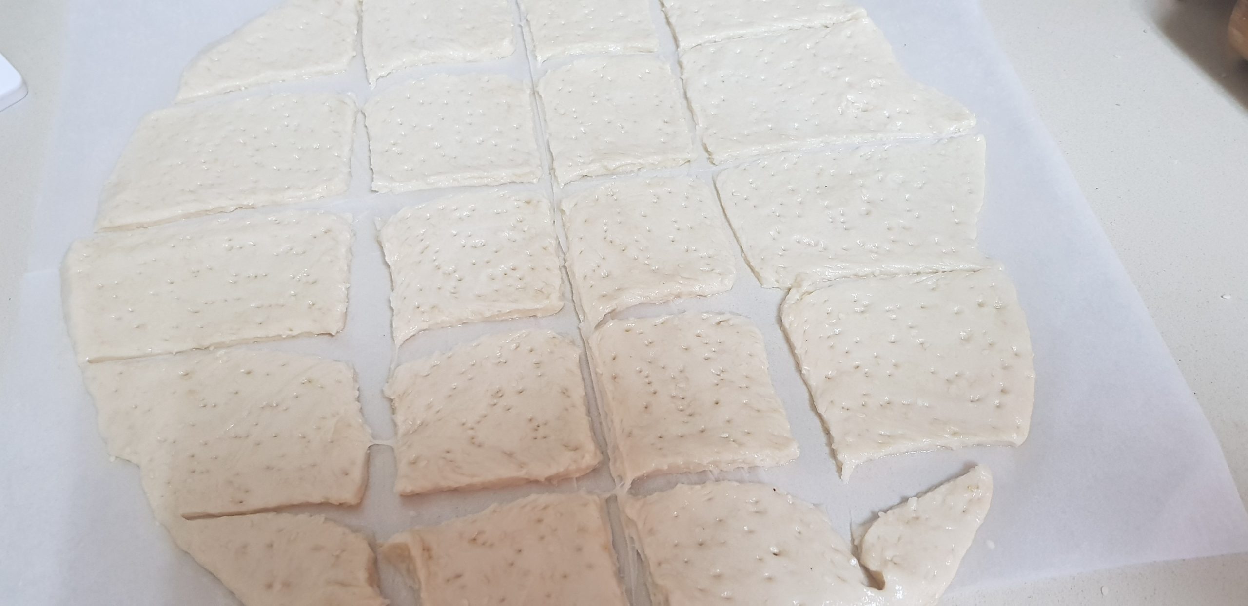 Ensuite partager votre pâte en 5 boules et les aplatir entre deux feuilles de cellophane (3 mm d’épaisseur) et faire de trous et ensuite découper des carrés et faire cuire à la chaleur tournante à 180° pendant 15 minutes. Si vous aimez une cuisson plus dorée, laissez encore 10 minutes.