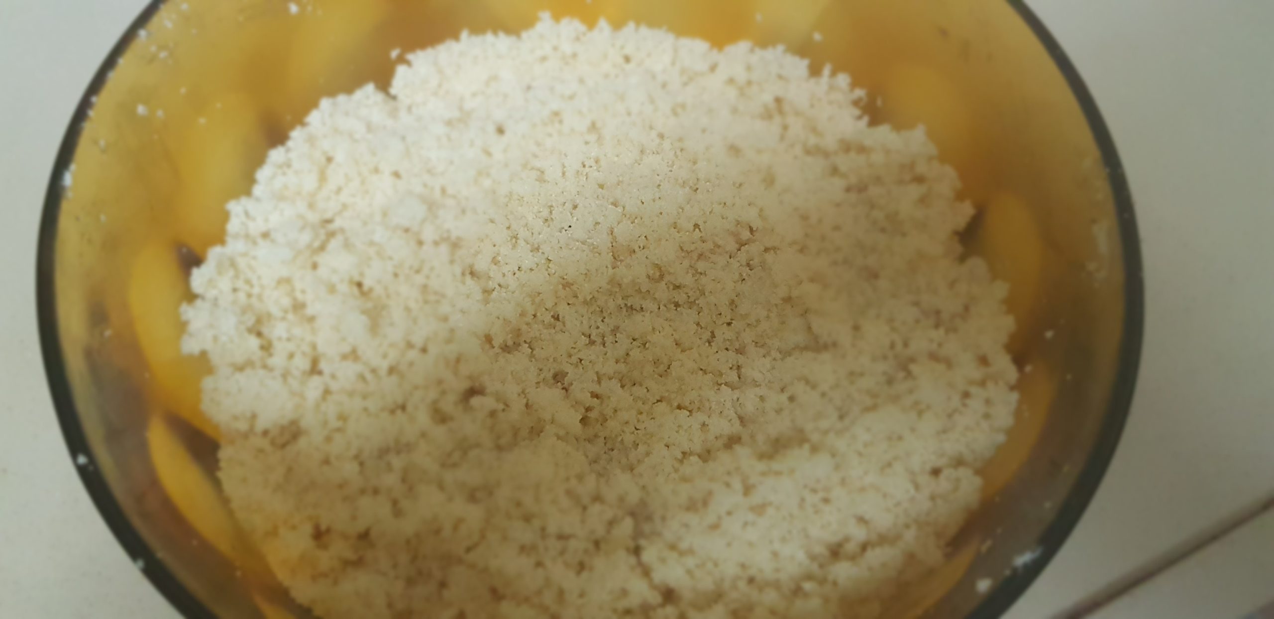 Mélanger la semoule moyenne et le beurre mou (température ambiante) (ou margarine) et l’huile et travailler la pate comme les grains de couscous et laisser reposer la pate 30 minutes.